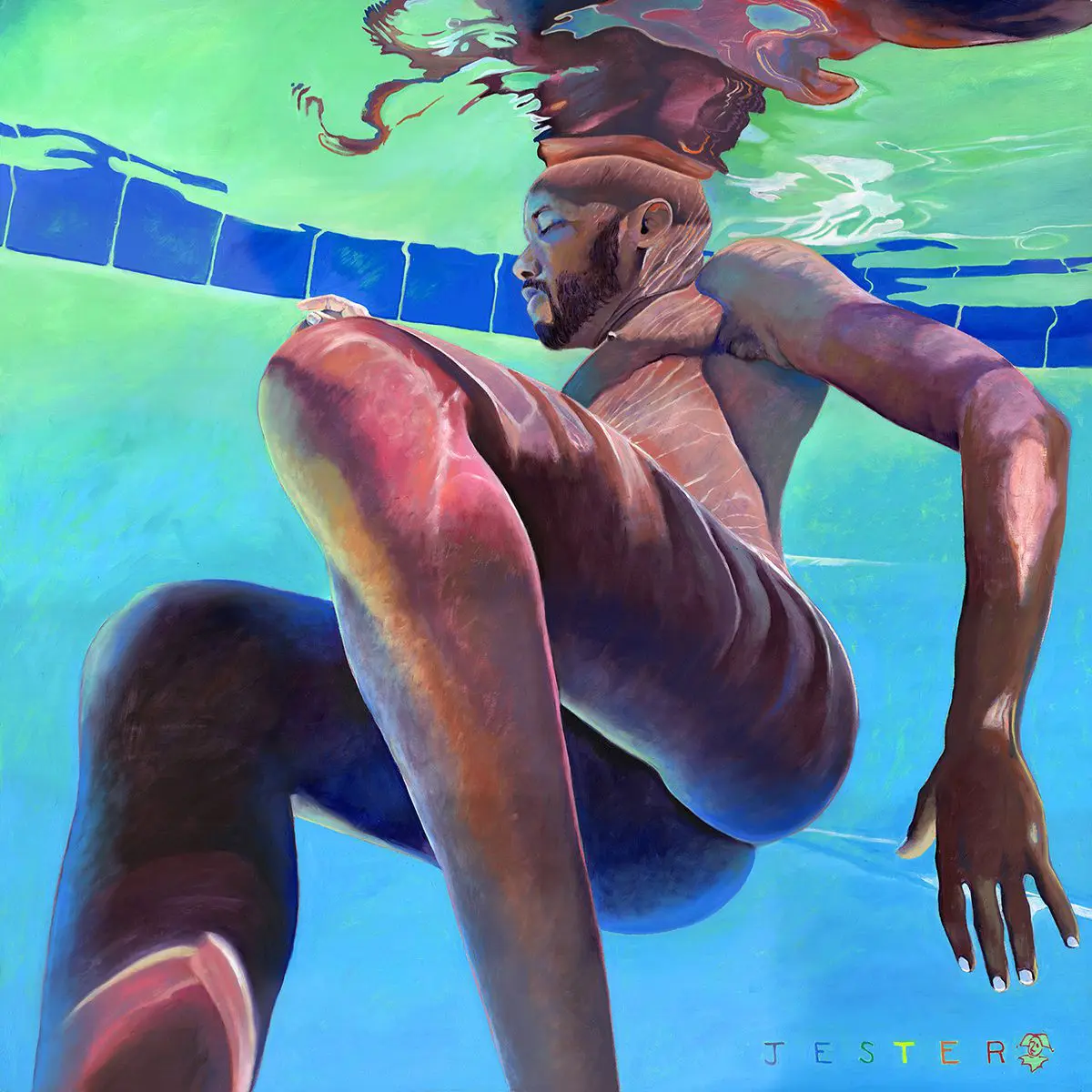 Jester’s meticulous handling of light and refraction blurs the boundary between realism and abstraction, inviting the viewer to contemplate themes of transformation, identity, and the ephemeral nature of self-awareness. The subject’s expression—serene, introspective—further amplifies the painting’s contemplative aura, as if suspended in both water and thought.