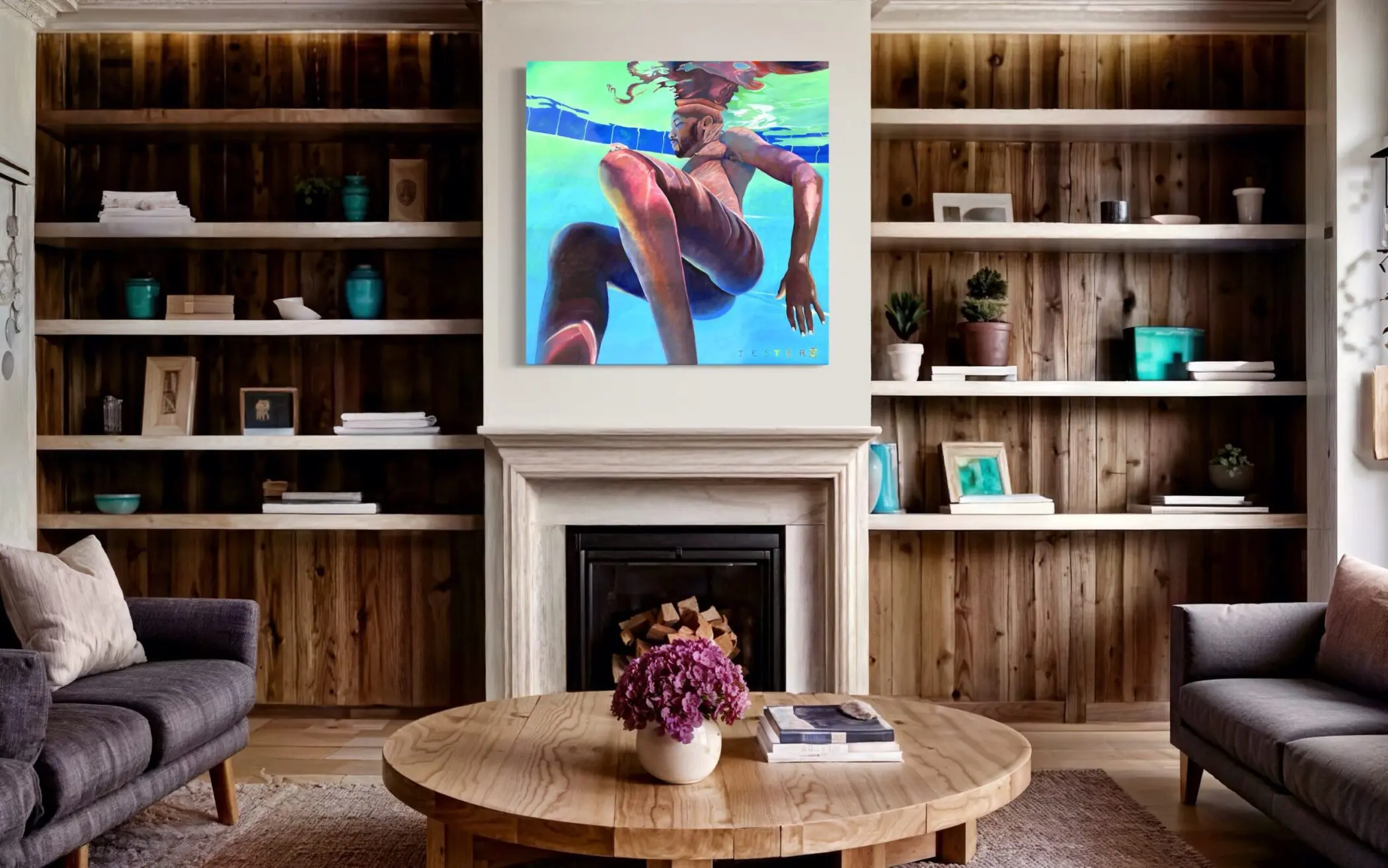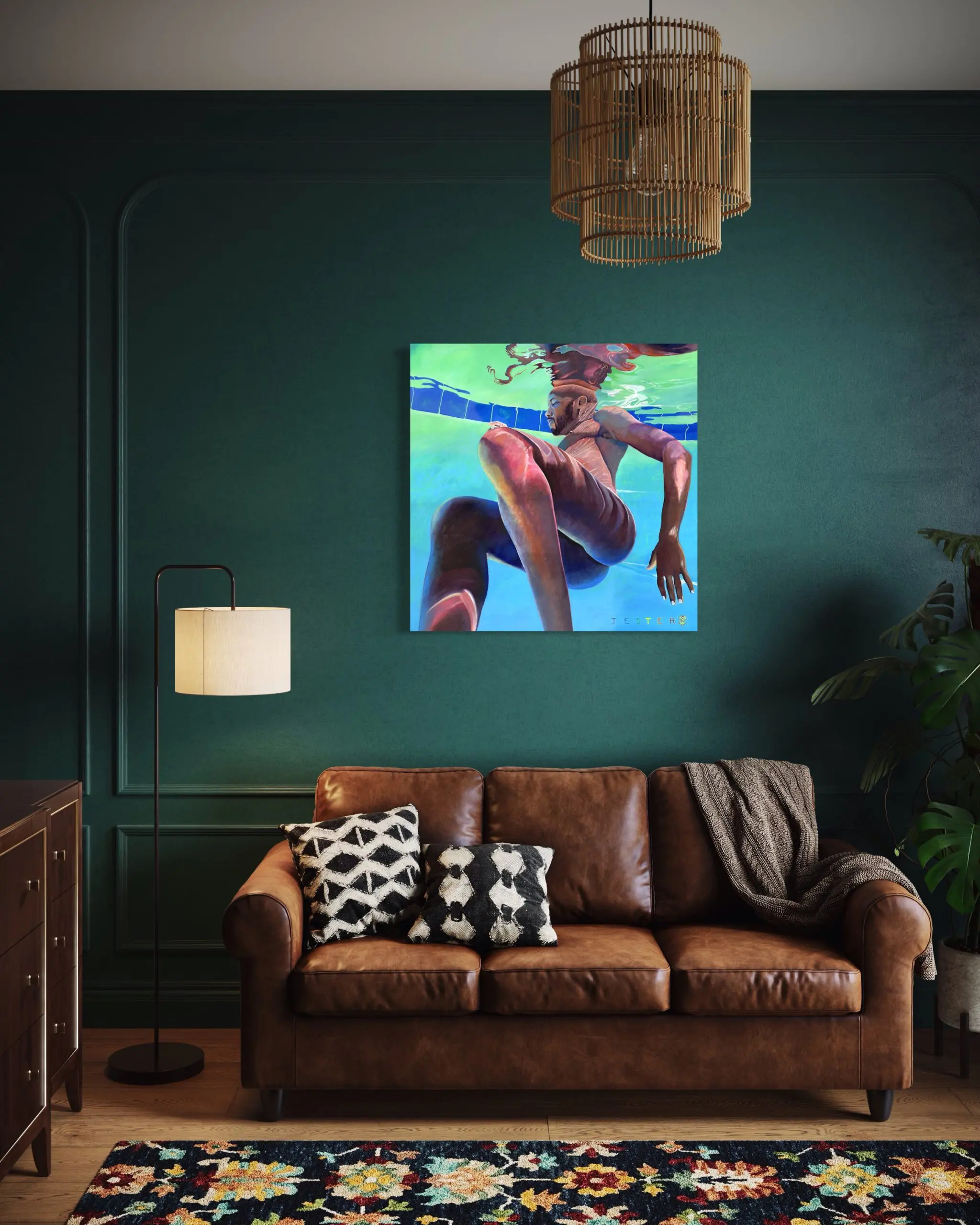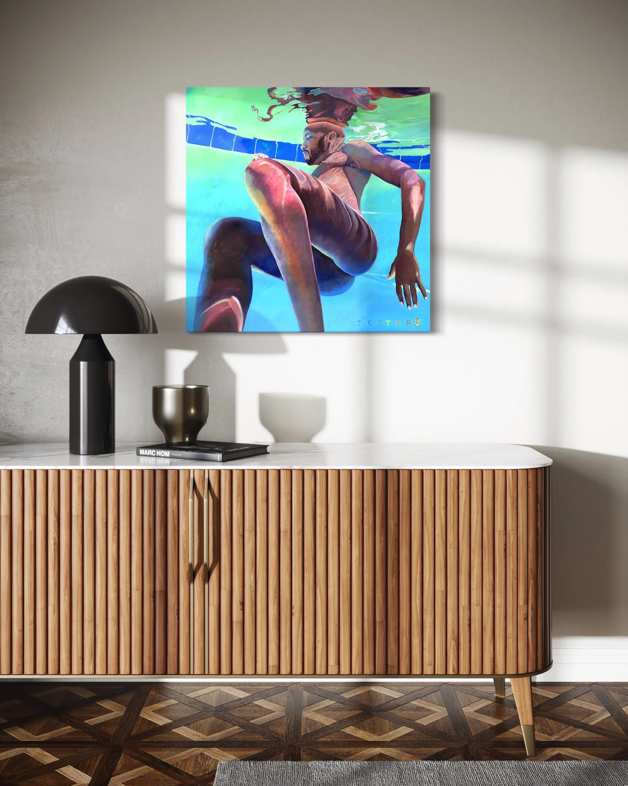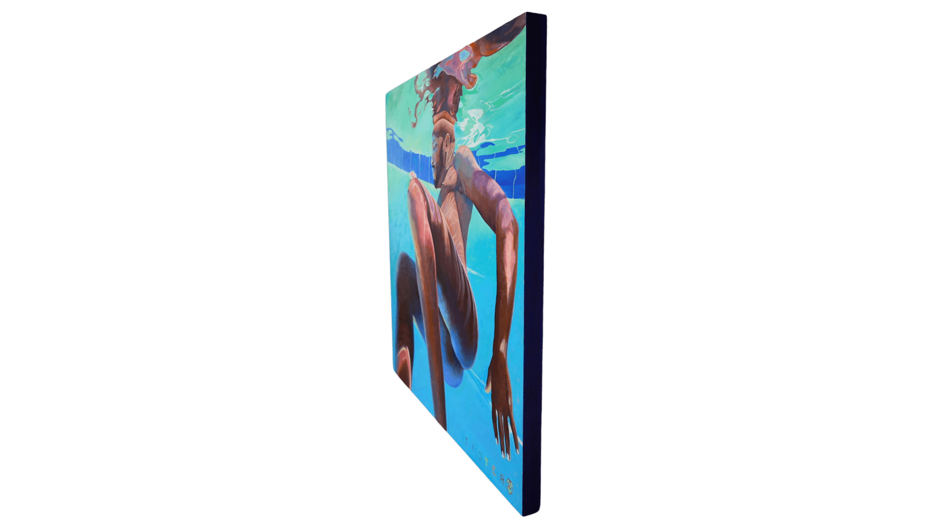 The rich interplay of warm and cool tones, with deep bronzes and shimmering blues, creates an almost sculptural quality, highlighting the dynamic tension between form and fluidity. The pool tiles, slightly warped by the water’s movement, ground the composition while reinforcing the illusion of depth. Above the surface, the figure’s reflection dissolves into a dreamlike, surreal abstraction, suggesting a duality—who we are versus how we appear, the conscious self versus the fragmented subconscious.