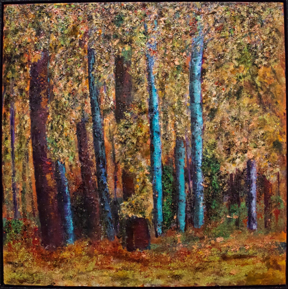 Mashian’s use of thick, expressive brushwork and shimmering materials enhances the organic movement of the scene. The golden foliage appears to glow, as if bathed in the soft afternoon light, while the deep blues and browns of the tree trunks add contrast, making the composition feel both structured and fluid. The bold streaks of turquoise add an element of the unexpected, giving the trees a dreamlike, almost surreal quality.