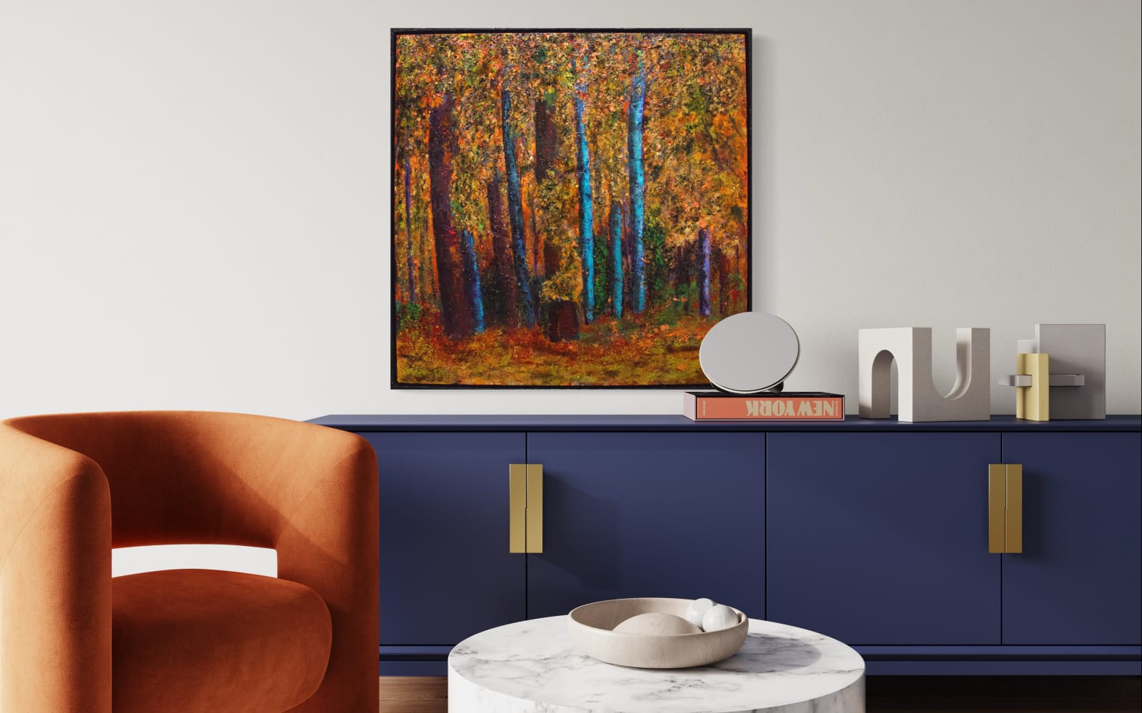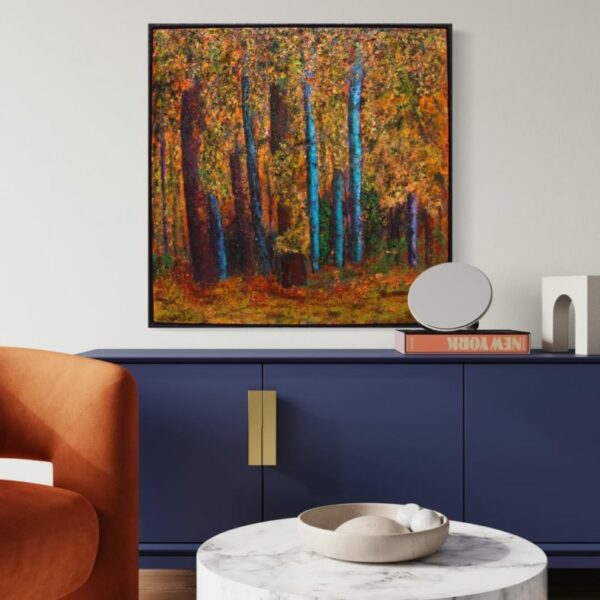 Whether placed in a contemporary home or a setting inspired by nature, “Orange Crush I” embodies the vibrancy and transformation of a forest at its peak.