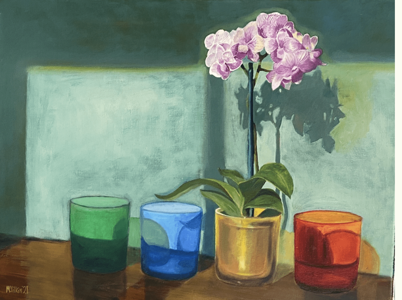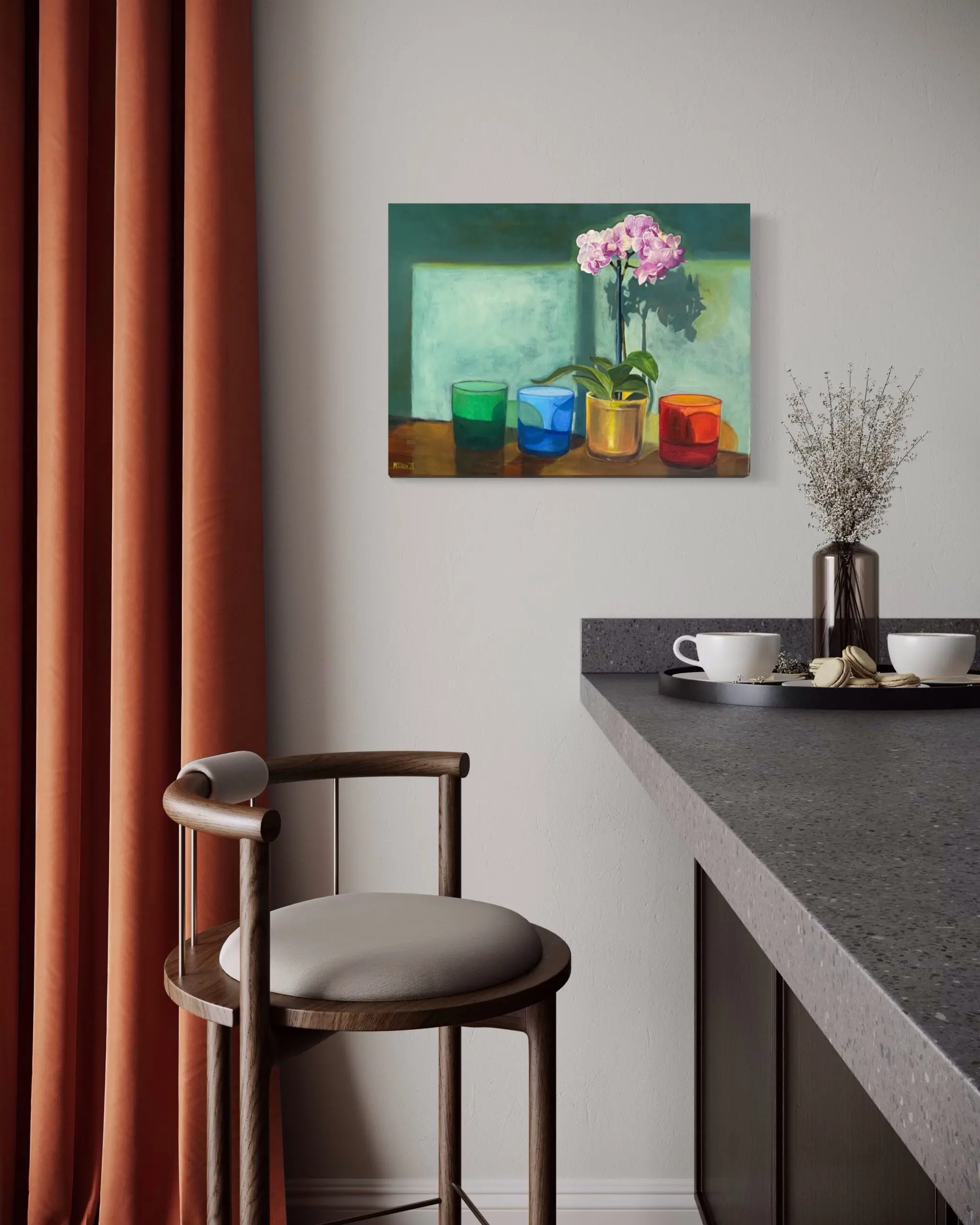 At the heart of the painting, a delicate orchid with lilac and blush petals stands as the focal point, its graceful form casting a crisp yet fluid shadow against a muted greenish-blue background. Positioned with intentional rhythm, four glass vessels—each distinct in color—align in a procession of transparency and reflection, allowing the soft diffusion of natural light to create an intricate play of depth, luminosity, and movement.