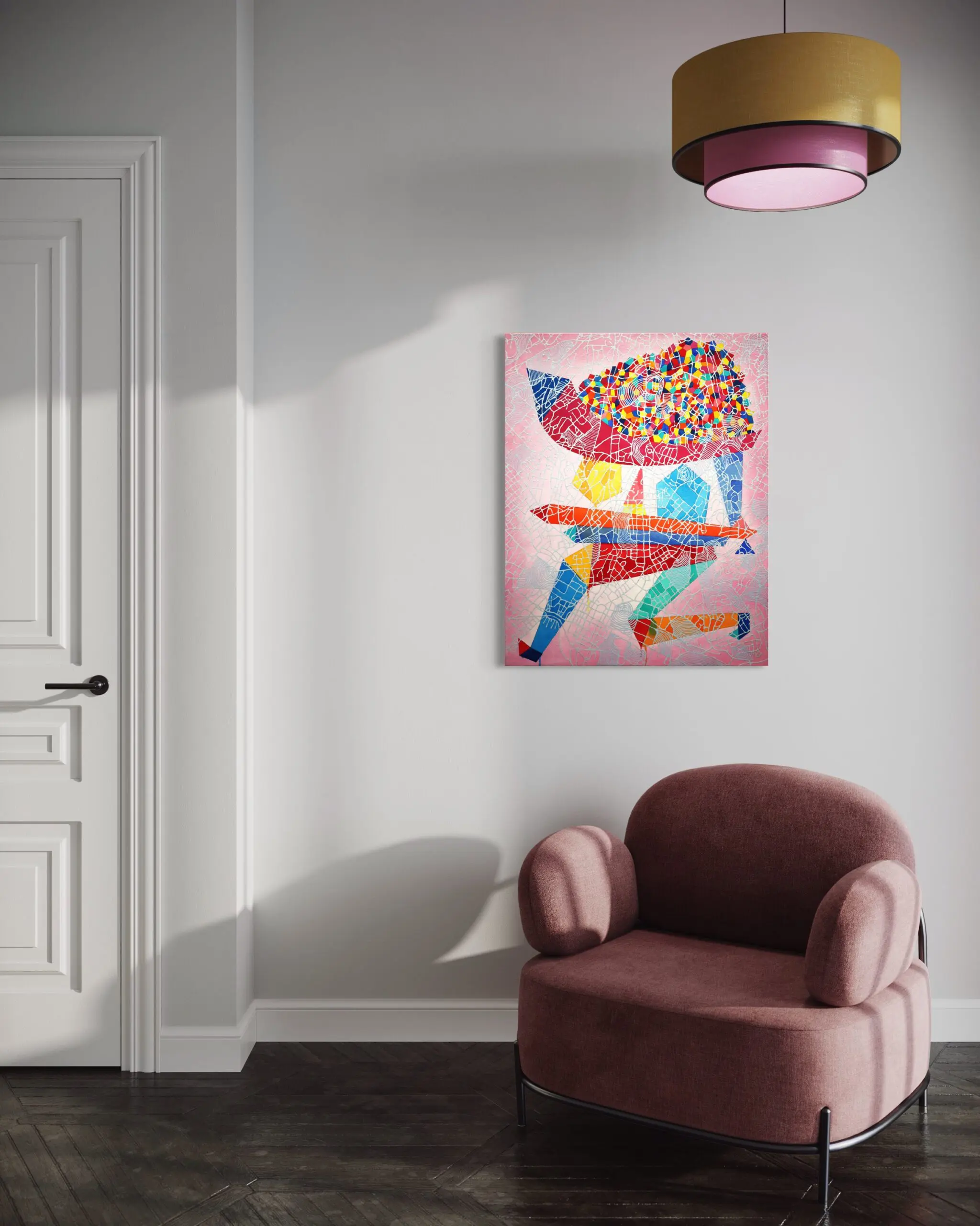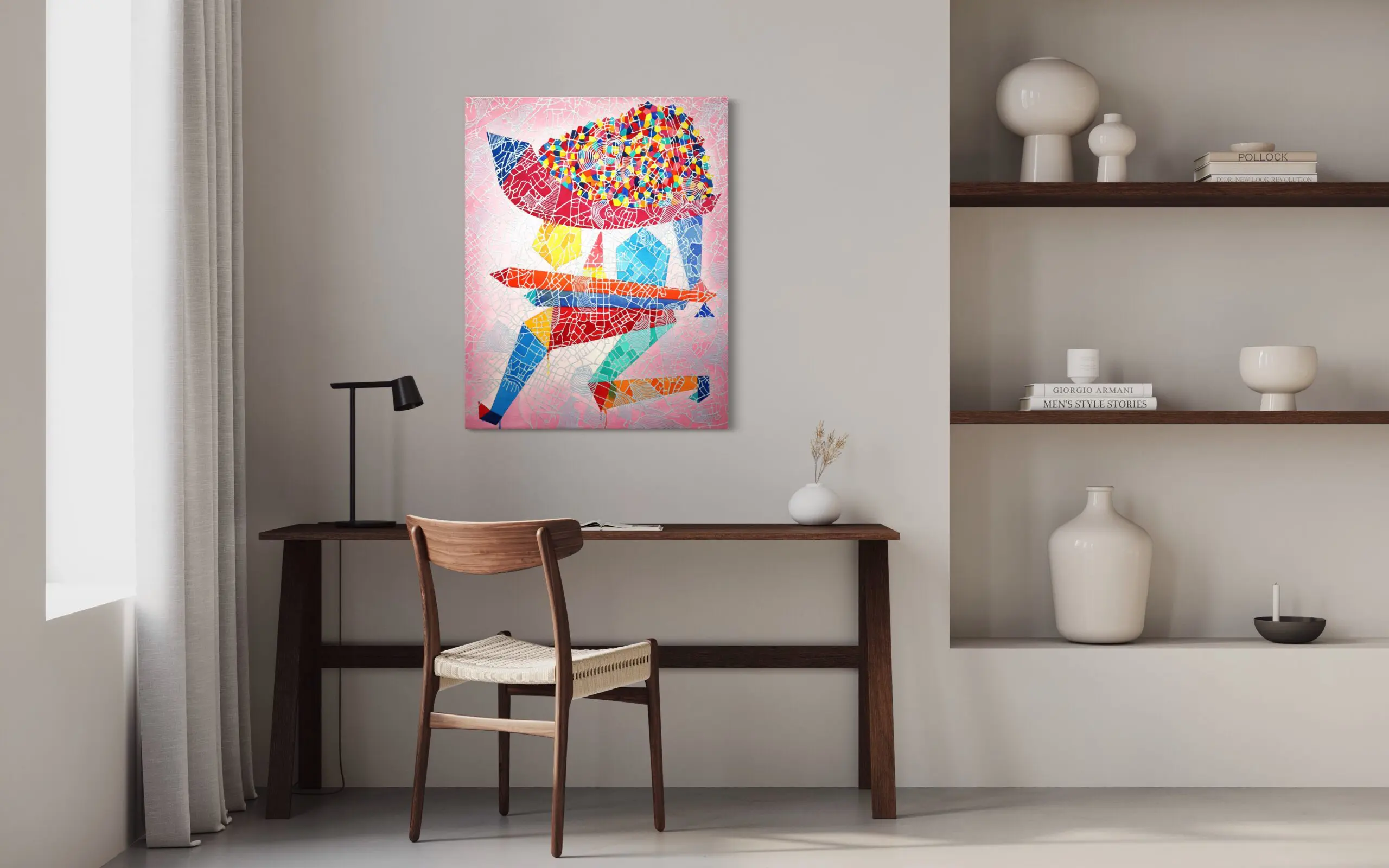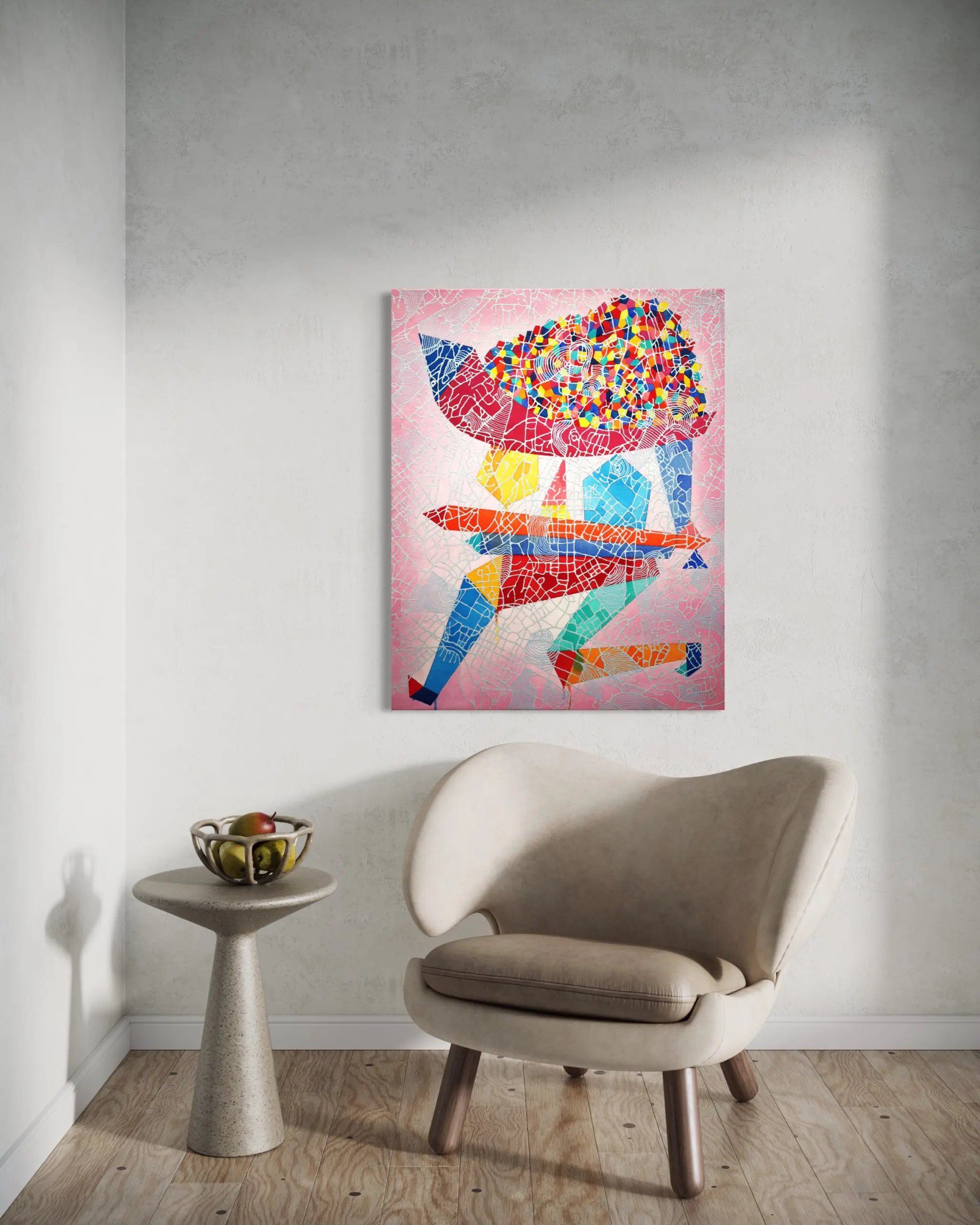 In this artwork, a dynamic geometric figure, comprised entirely of vividly colored shapes, appears to be in a state of animated movement. It simultaneously bears the weight of a substantial cluster of multicolored dots atop what could be interpreted as its head. The artist has intricately woven into the composition a grid reminiscent of a city map, adding another layer of complexity.