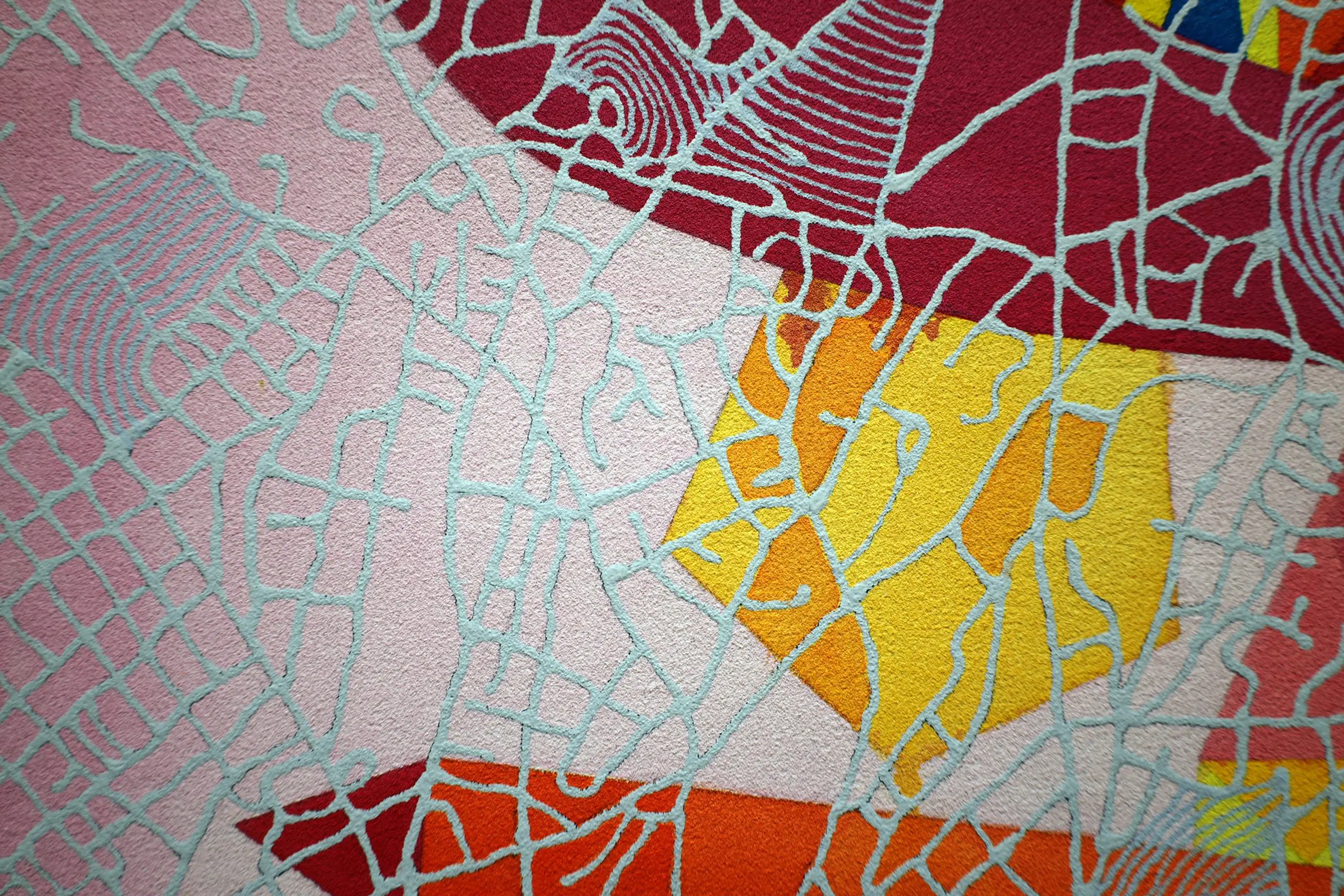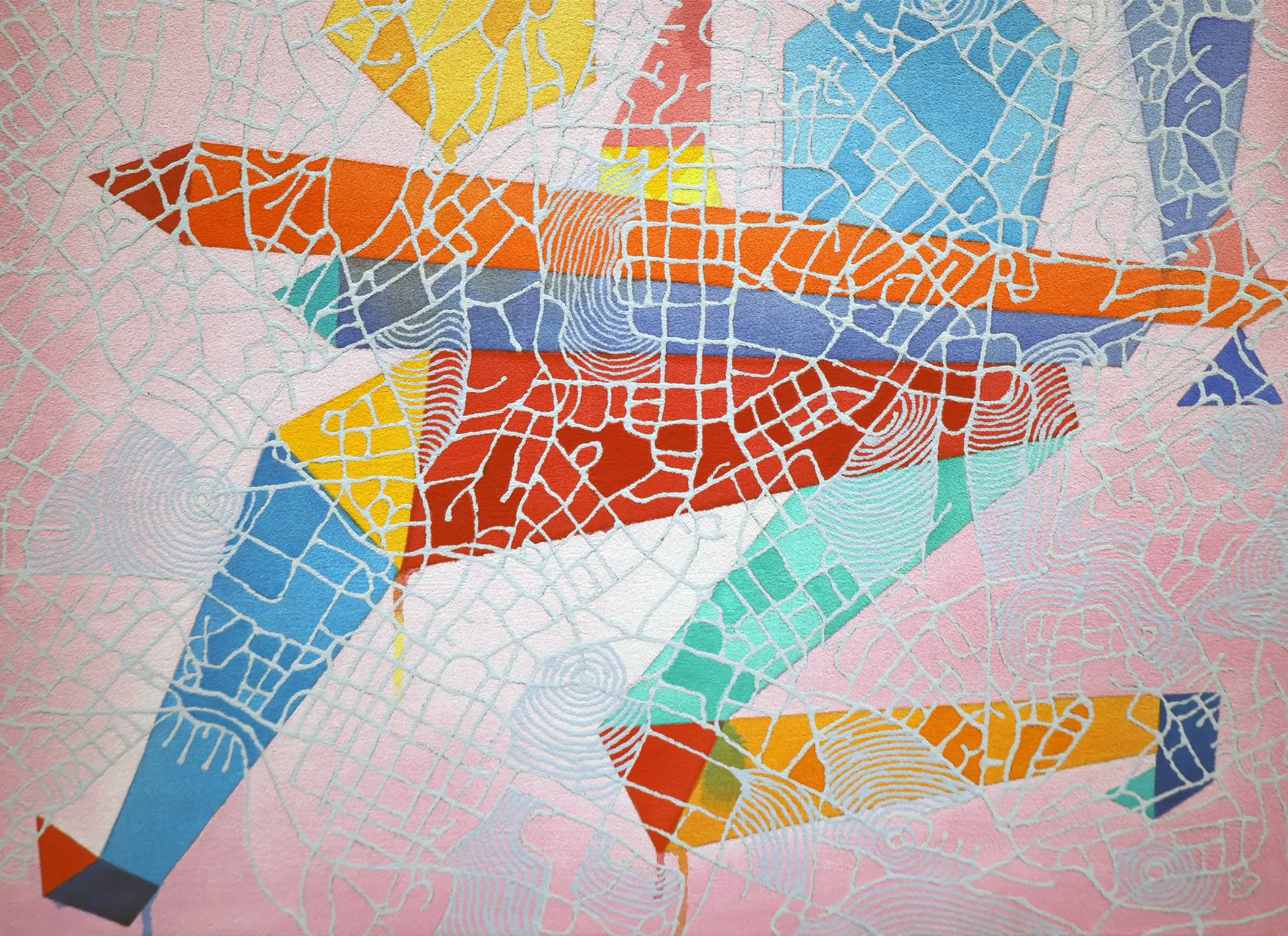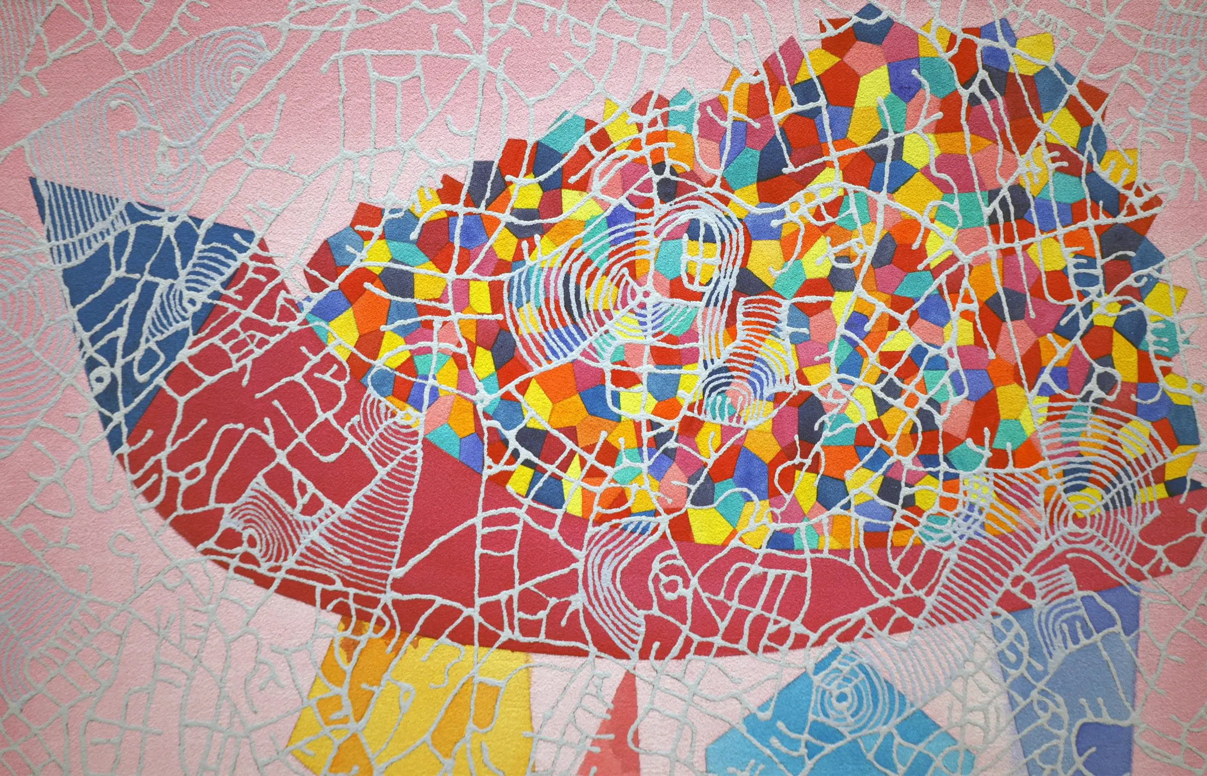 In this artwork, a dynamic geometric figure, comprised entirely of vividly colored shapes, appears to be in a state of animated movement. It simultaneously bears the weight of a substantial cluster of multicolored dots atop what could be interpreted as its head. The artist has intricately woven into the composition a grid reminiscent of a city map, adding another layer of complexity.