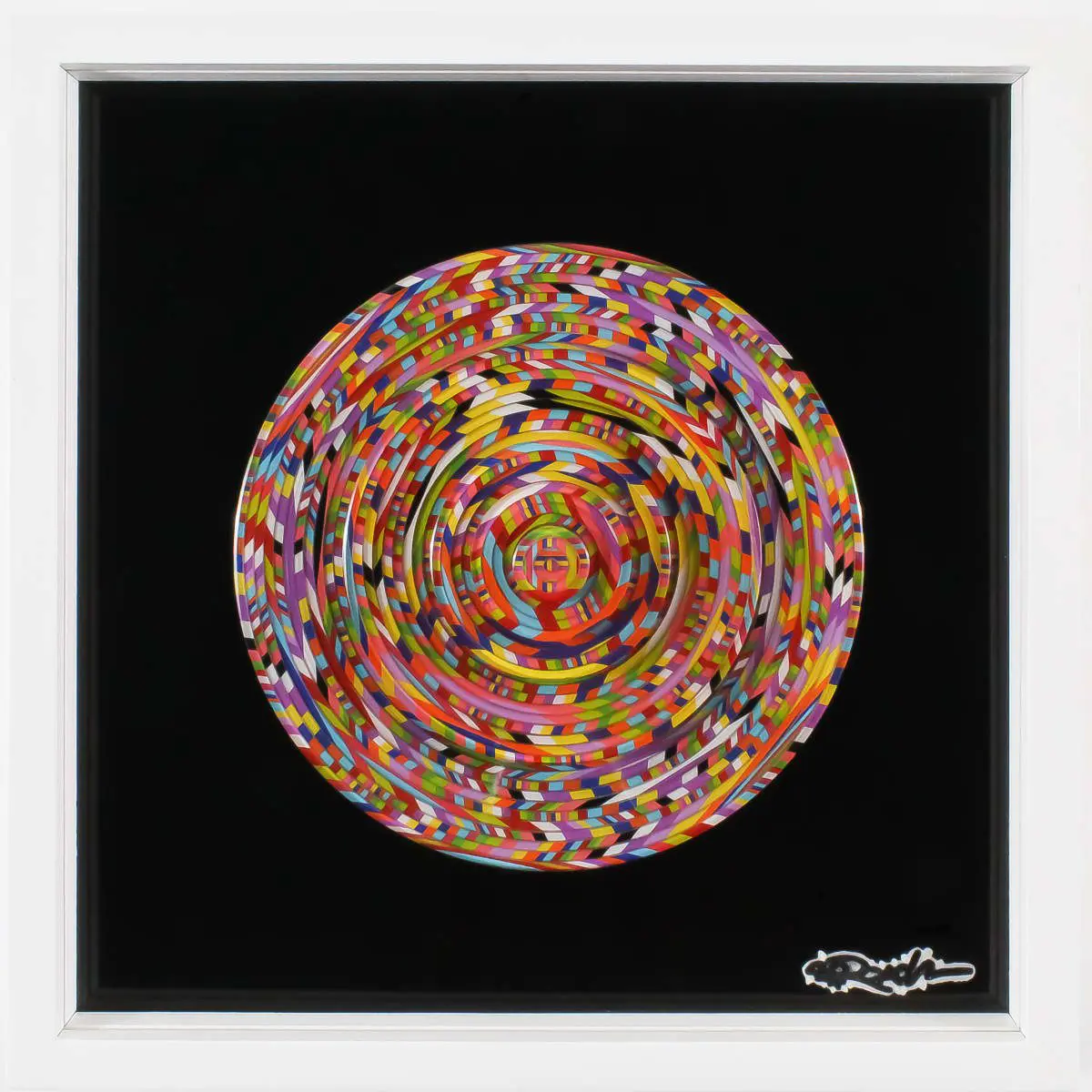 “I’m intoxicated by my own senses and find joy in creating art that can easily confuse the eye and play tricks on the mind. My work explores the connection between art, science, and soul, with pieces that blur the line between painting and sculpture. Each piece is inspired by nature with notable influences from the op art & psychedelic movement of the 1960s.