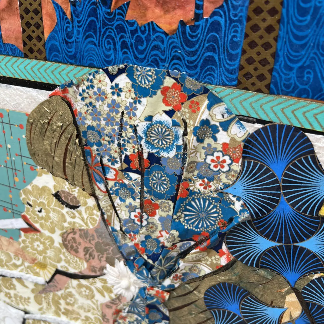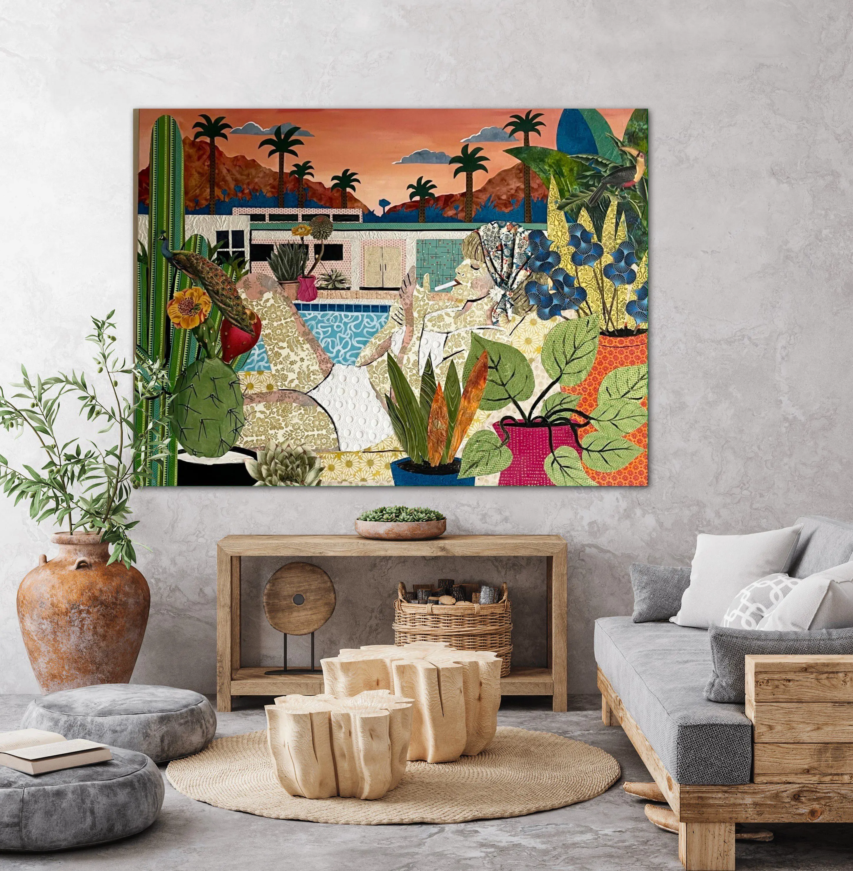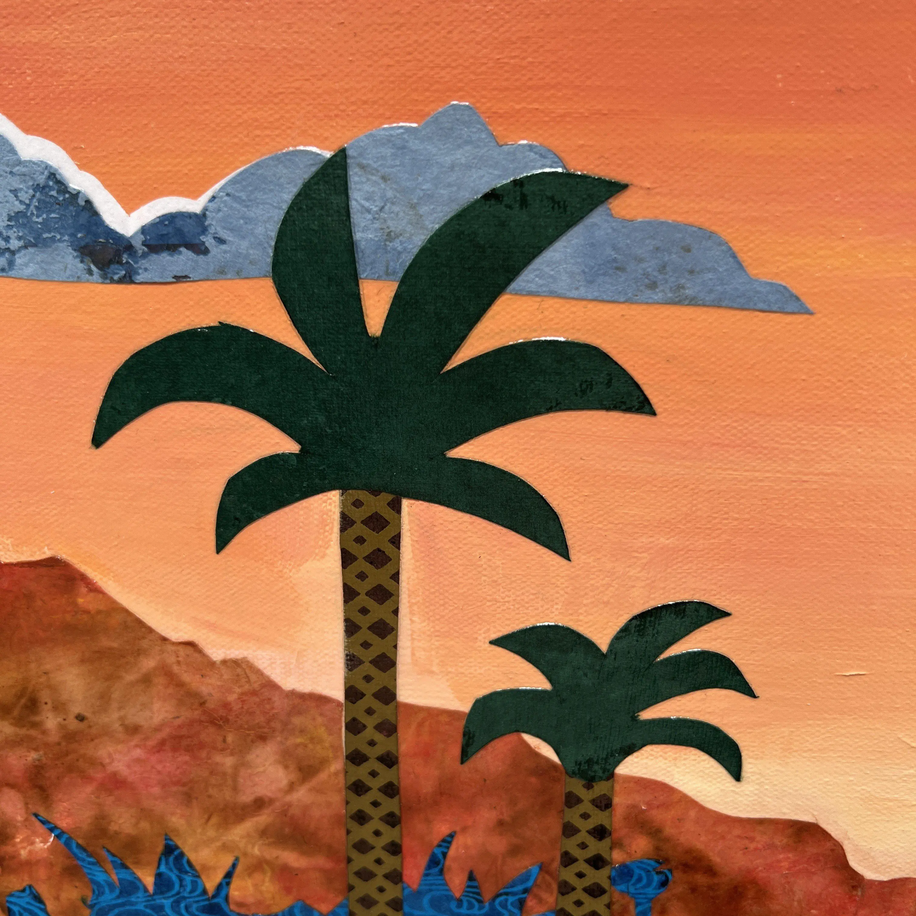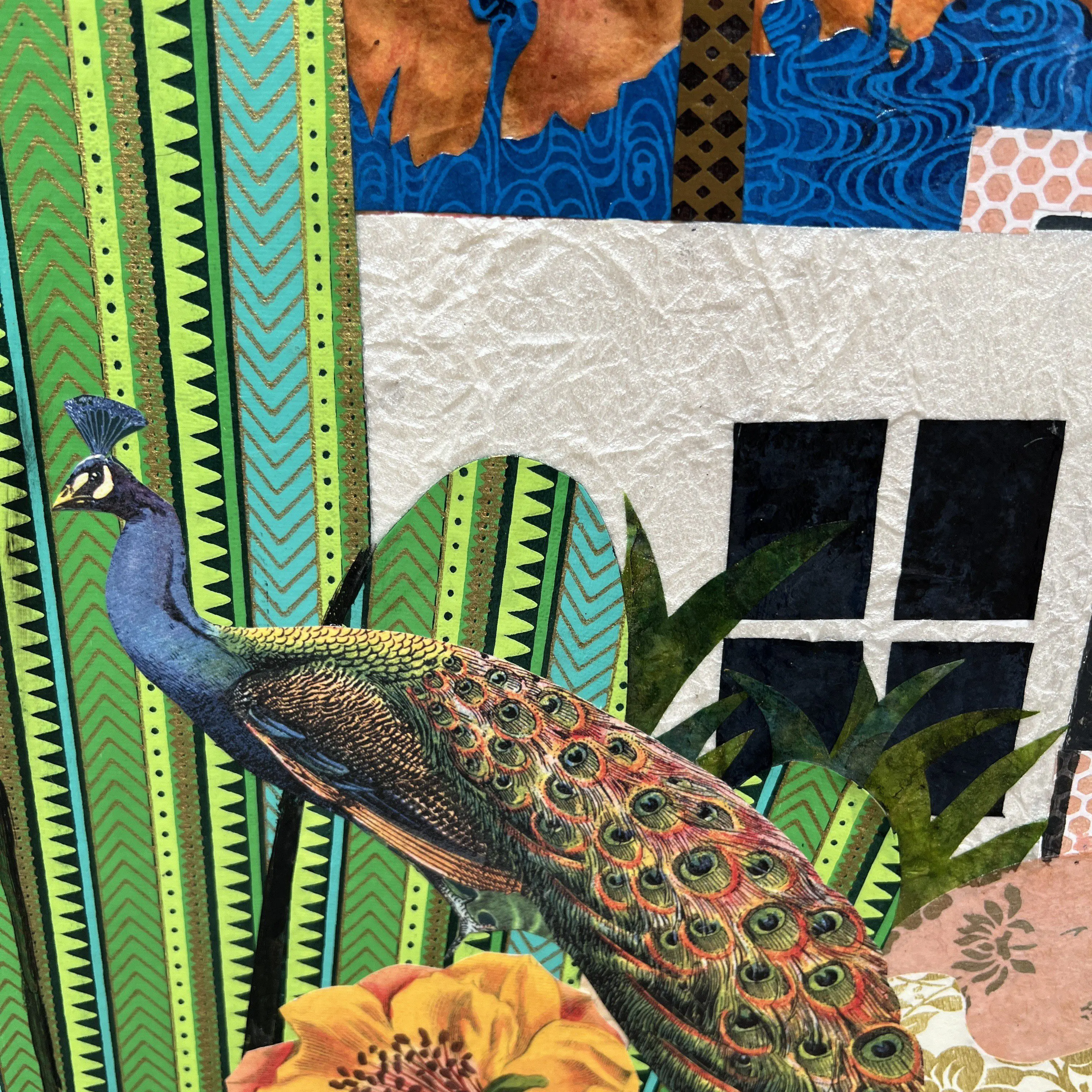 This horizontal 36 inch high and 48 inch original mixed media painting on canvas is stretched and ready to hang. Layers of patterned collage elements and acrylic paint bring this artwork to life. The layering and unique texture of colorful clippings and geometrical designs create a window looking into a luxurious escape perfect for any home or office. The sides of the artwork are painted and it does not require framing. It is signed and titled by the artist on the back of the artwork.
