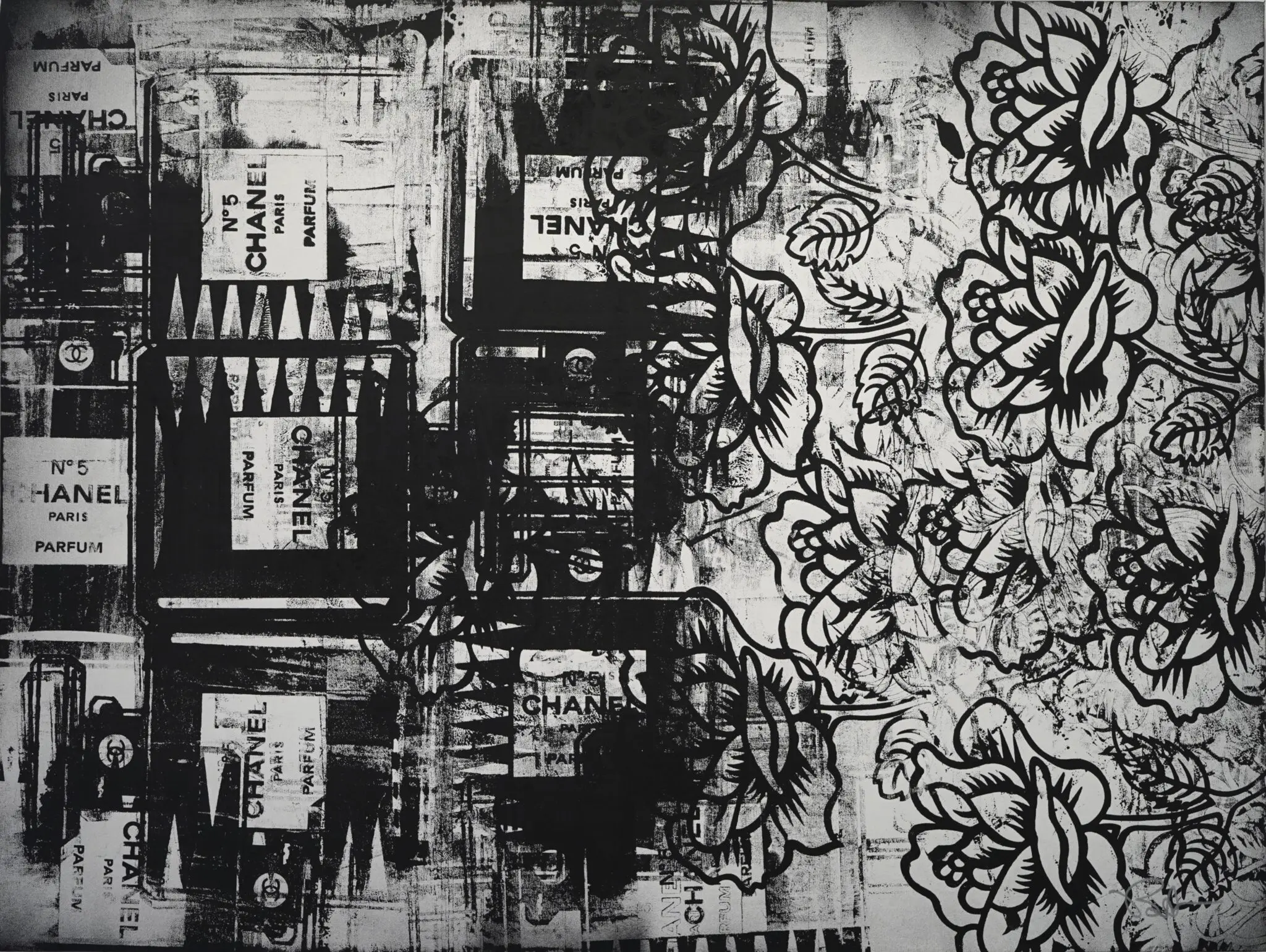 While Morris’ earlier pieces relied on tightly rendered graphic contour and visual immediacy, this new body of work introduces layered surfaces and a more process-driven approach that challenges the traditional flatness associated with Pop Art. Where artists such as Andy Warhol and James Rosenquist emphasized reproduction and mechanical precision, Morris advances contemporary pop art by allowing the image to accumulate and expand. The Chanel bottle, influenced by Coco Chanel’s camellia motif and long-standing association with luxury culture, dissolves into a field of repeated roses that oscillate between abstraction and representation.