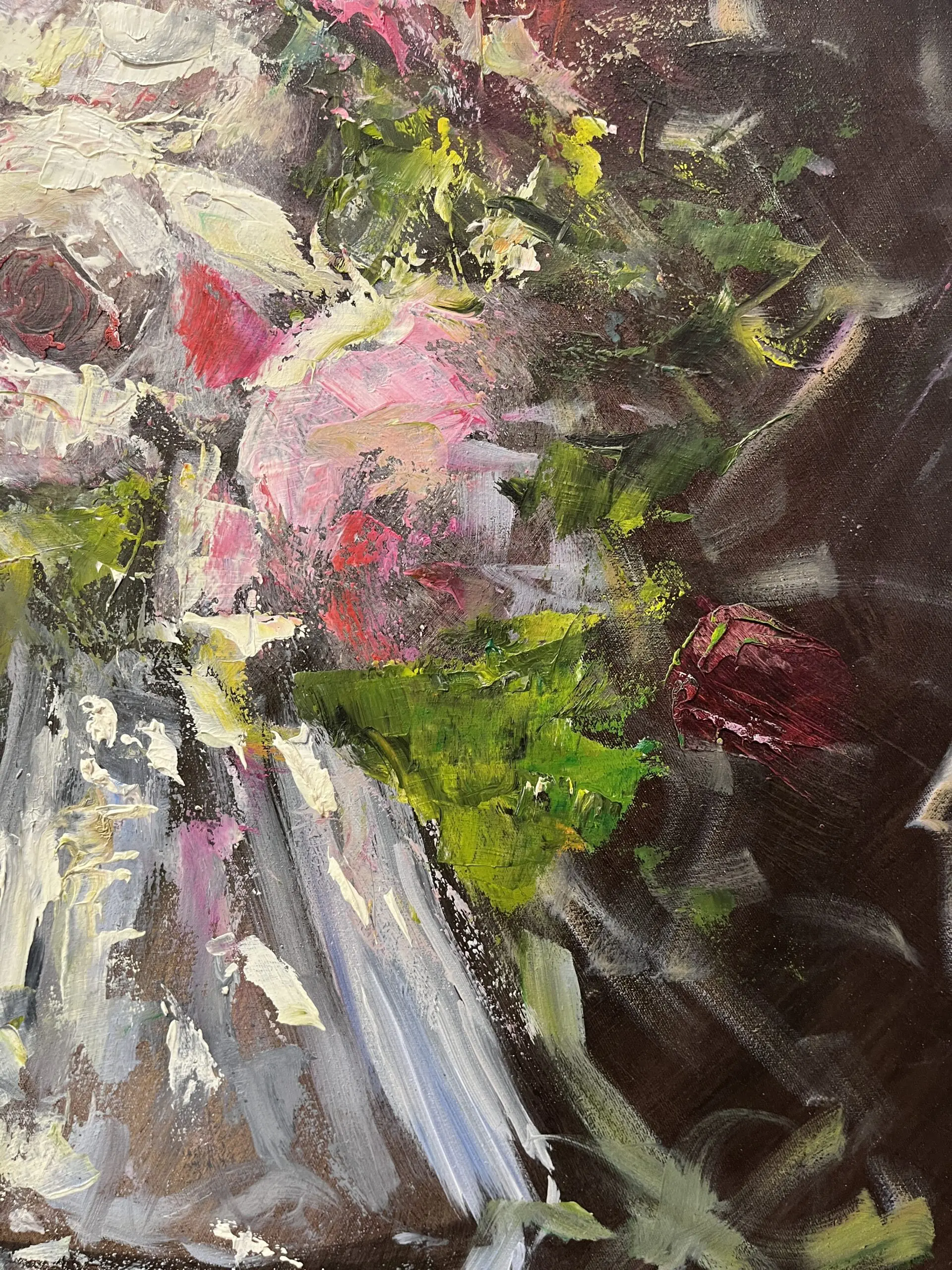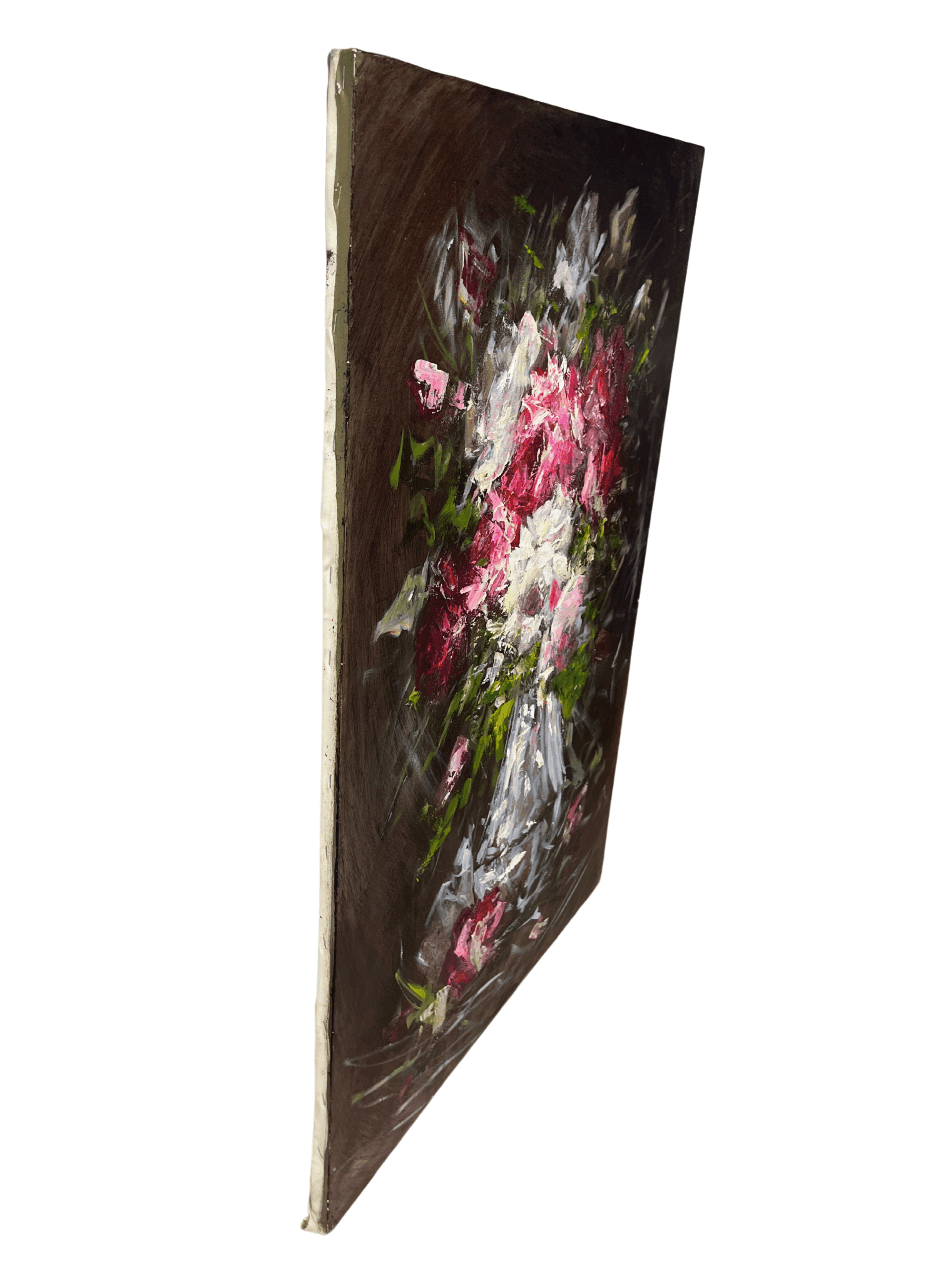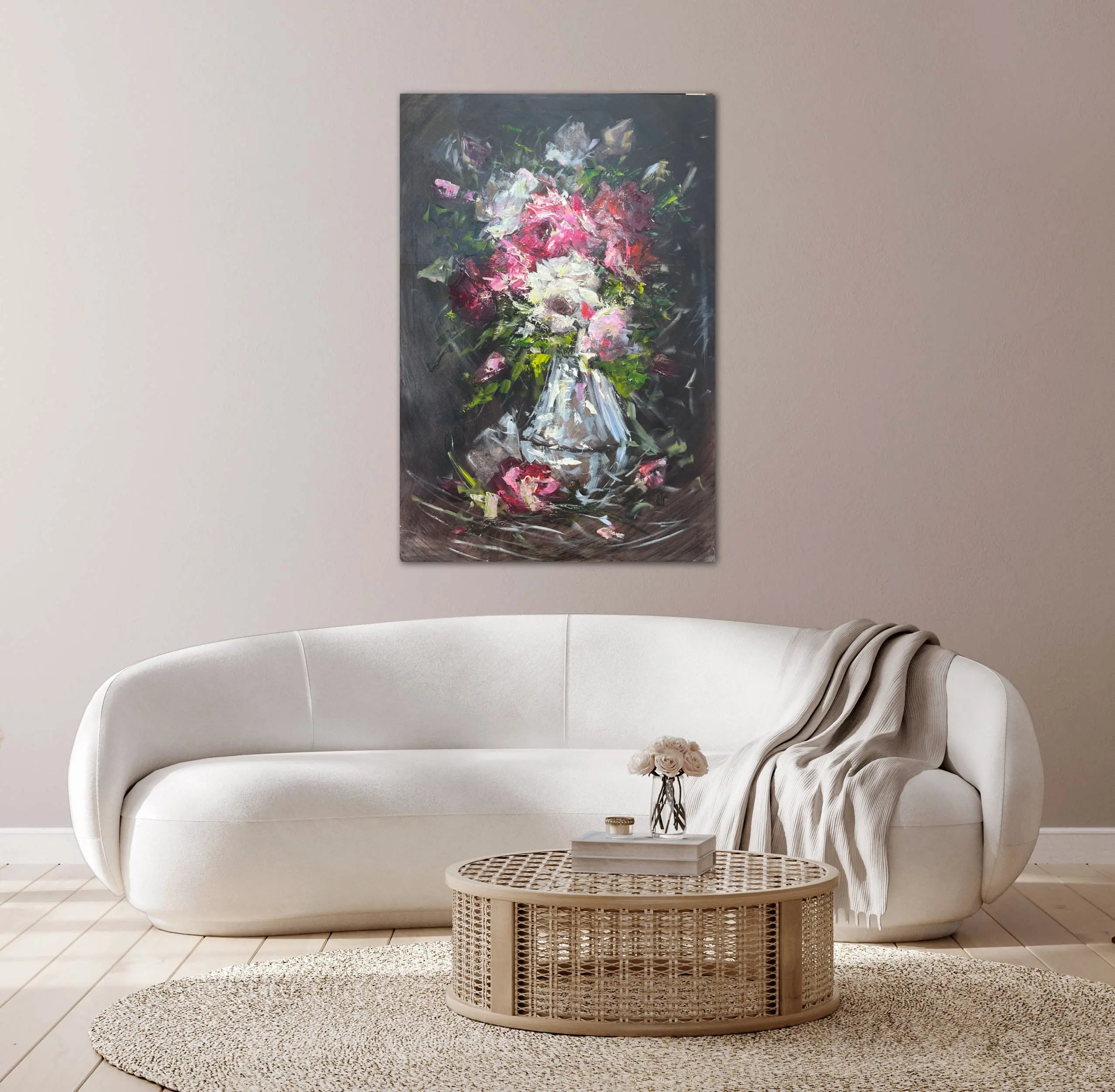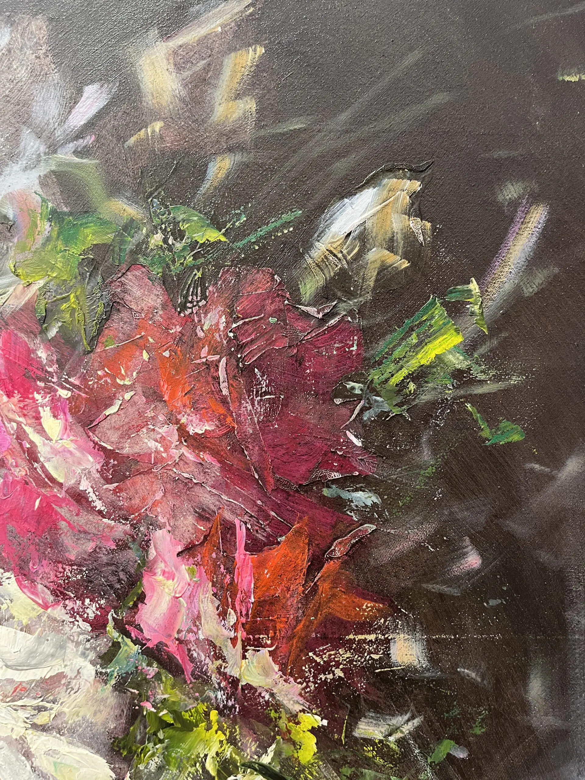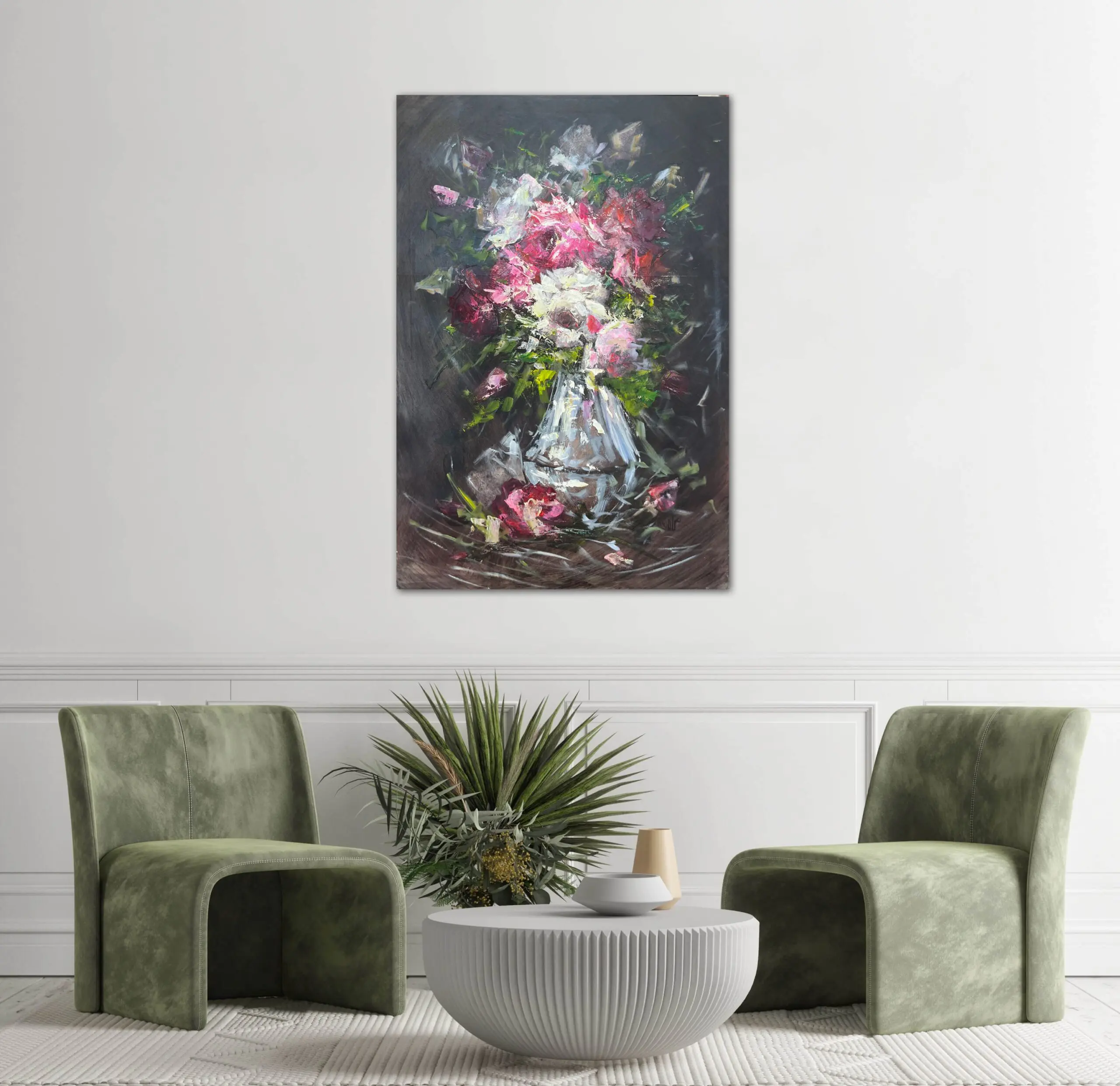 With its dynamic interplay of realistic and abstract elements, this painting invites viewers to explore the boundaries between perception and imagination. It evokes a sense of wonder and invites contemplation, as the viewer’s gaze is drawn to the intricate details of the falling petals and the expressive strokes that breathe life into the vase. It is a true testament to the artist’s ability to capture the beauty of nature while embracing the freedom of artistic expression.