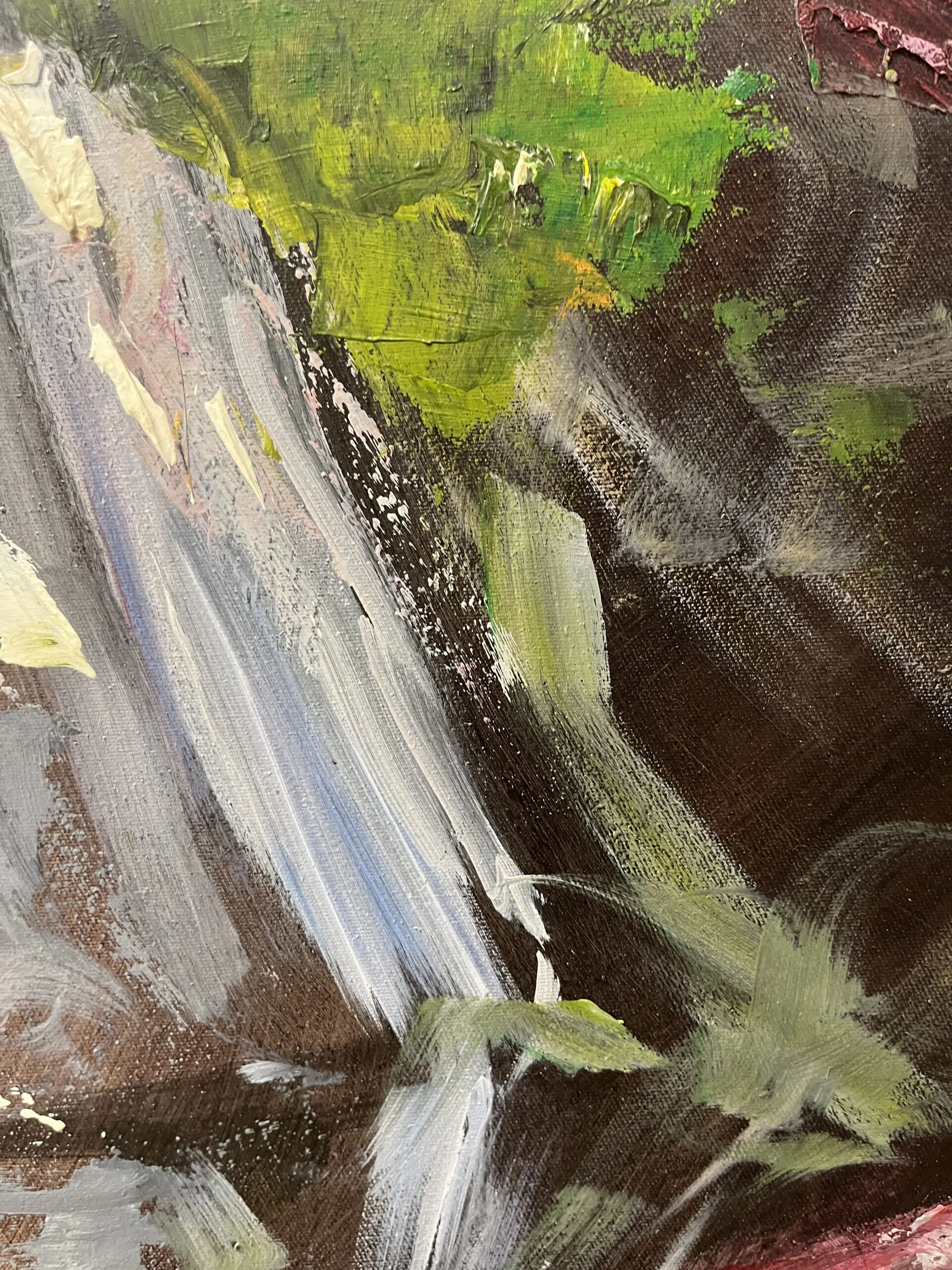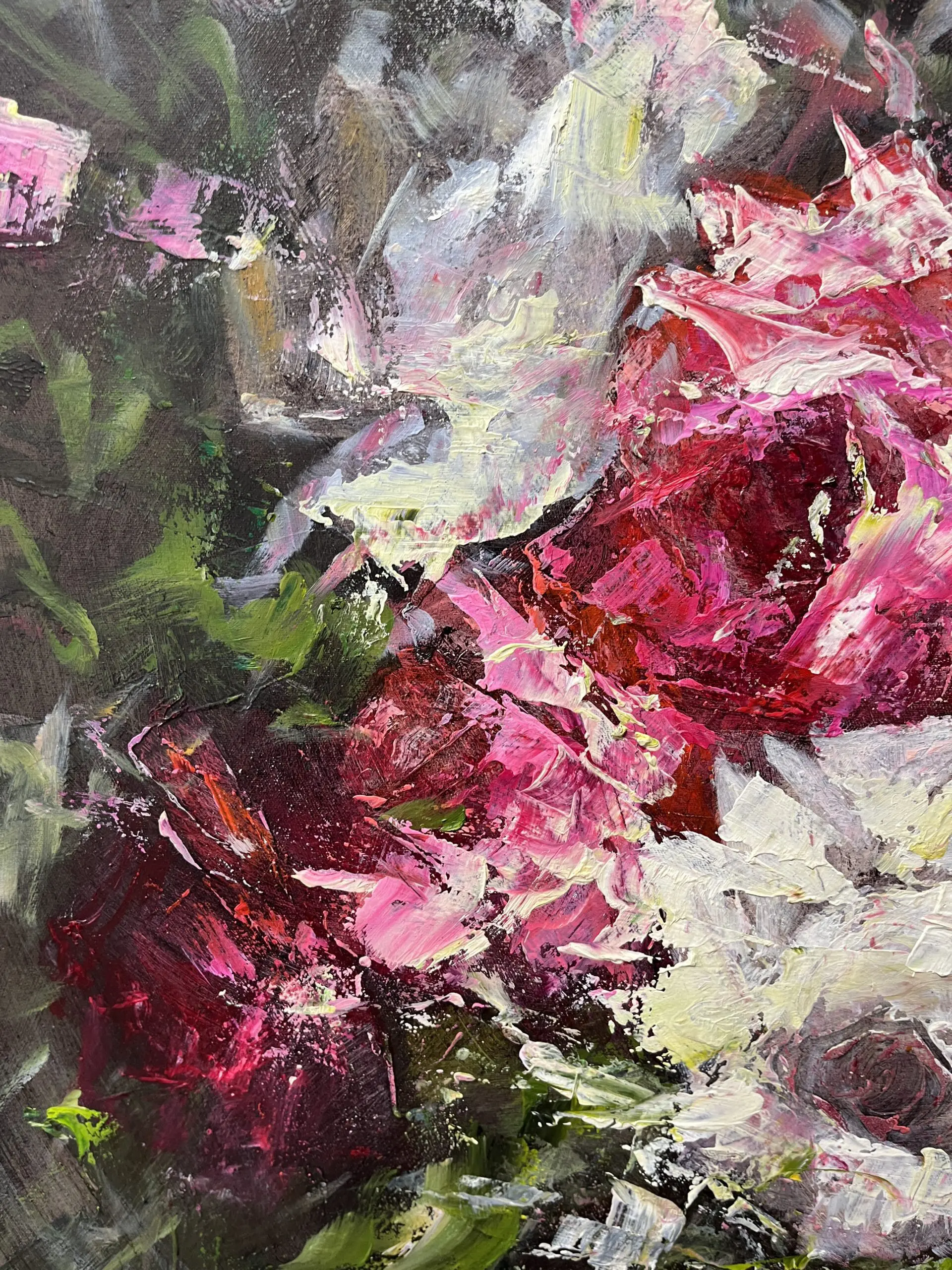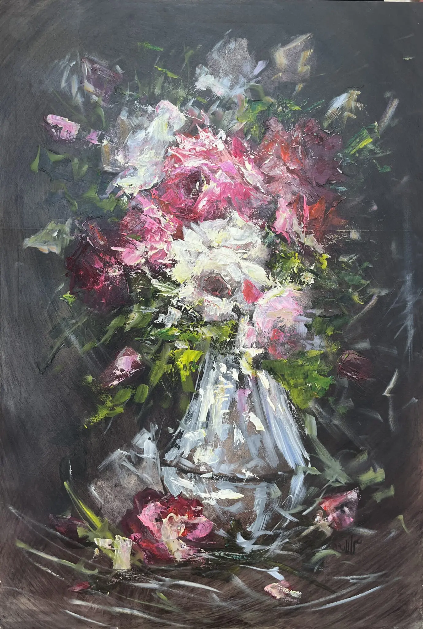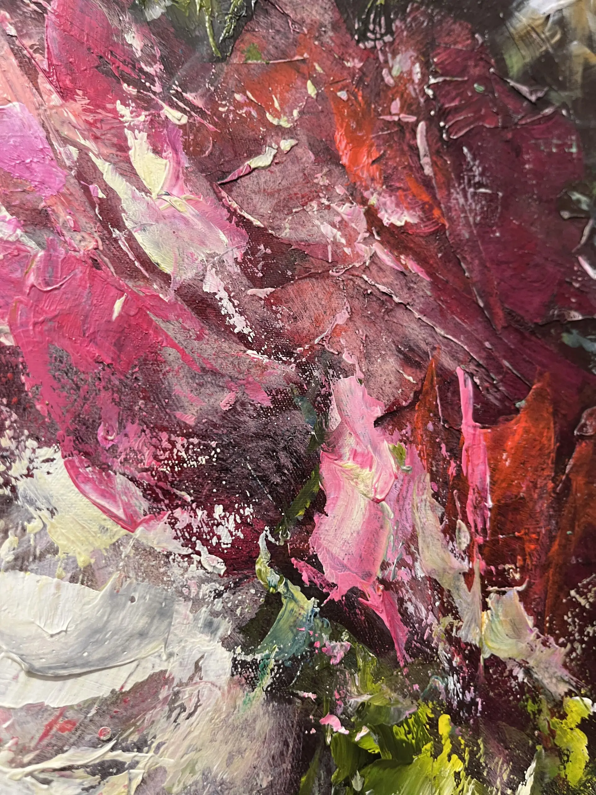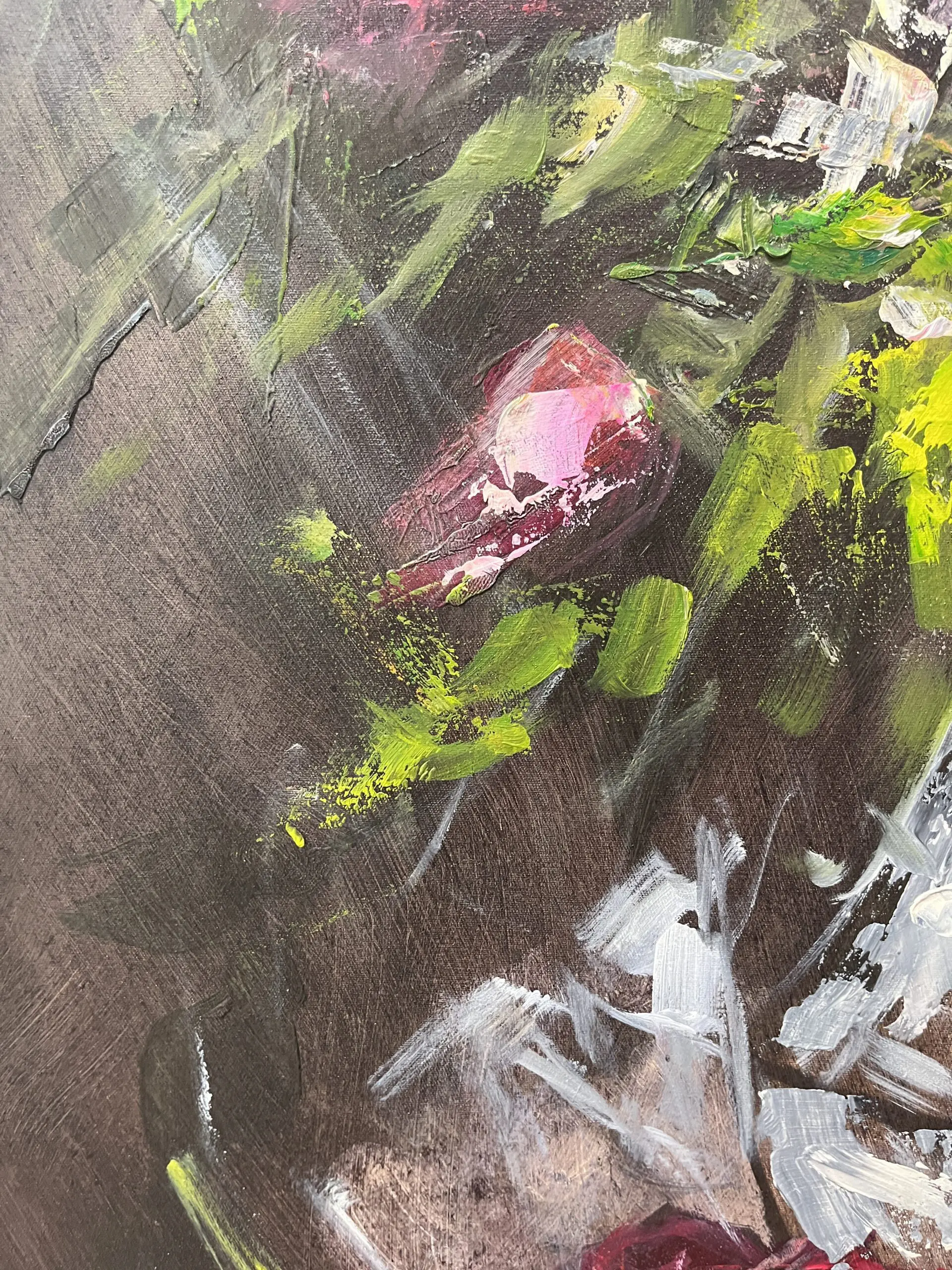 With its dynamic interplay of realistic and abstract elements, this painting invites viewers to explore the boundaries between perception and imagination. It evokes a sense of wonder and invites contemplation, as the viewer’s gaze is drawn to the intricate details of the falling petals and the expressive strokes that breathe life into the vase. It is a true testament to the artist’s ability to capture the beauty of nature while embracing the freedom of artistic expression.