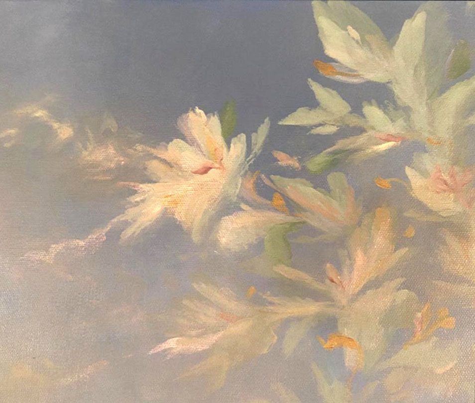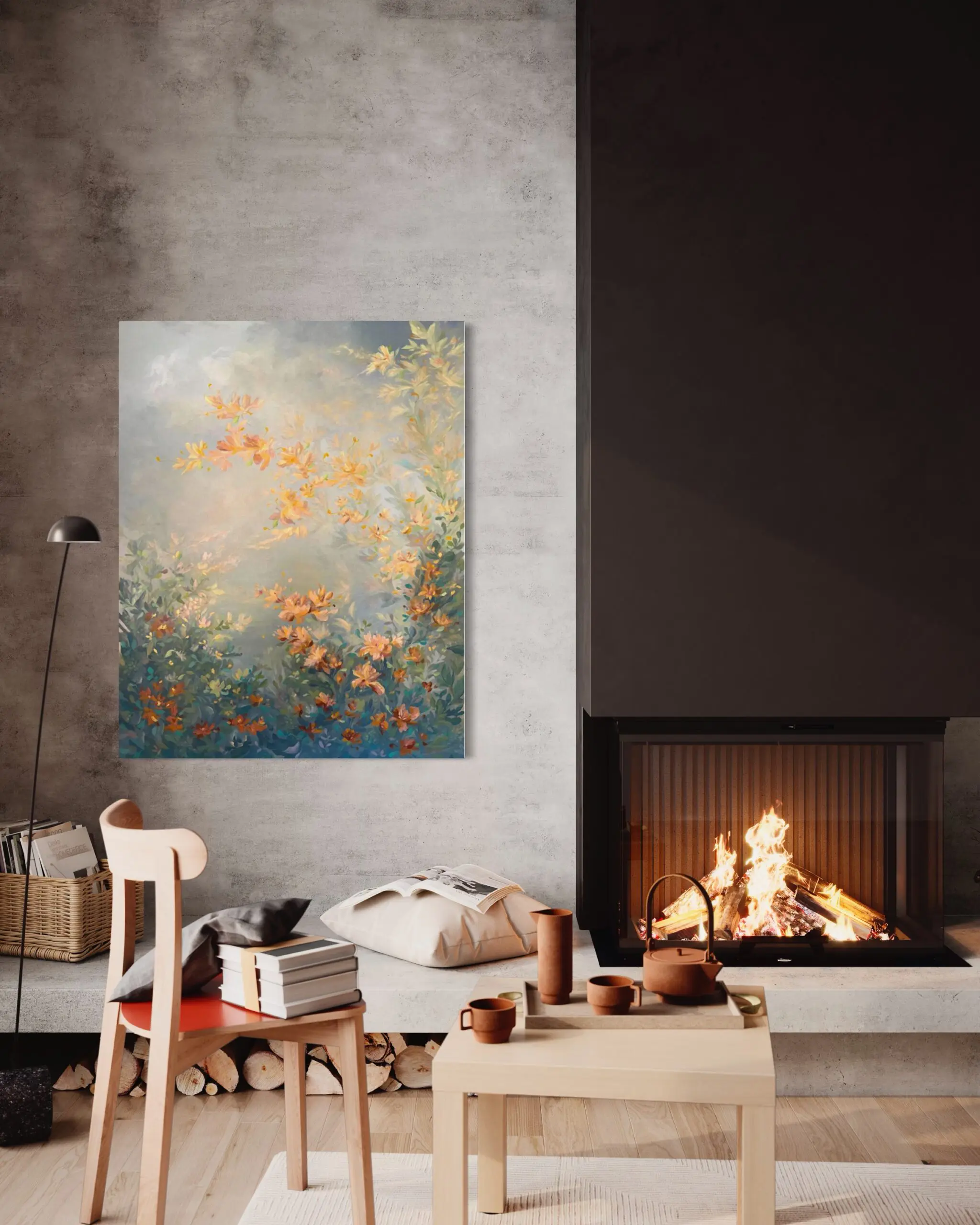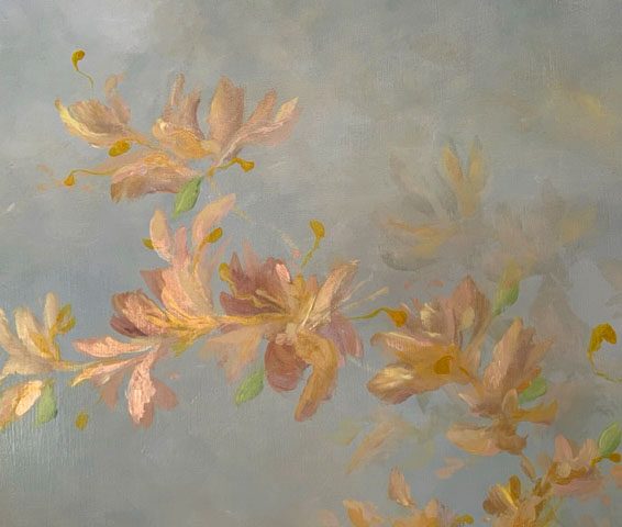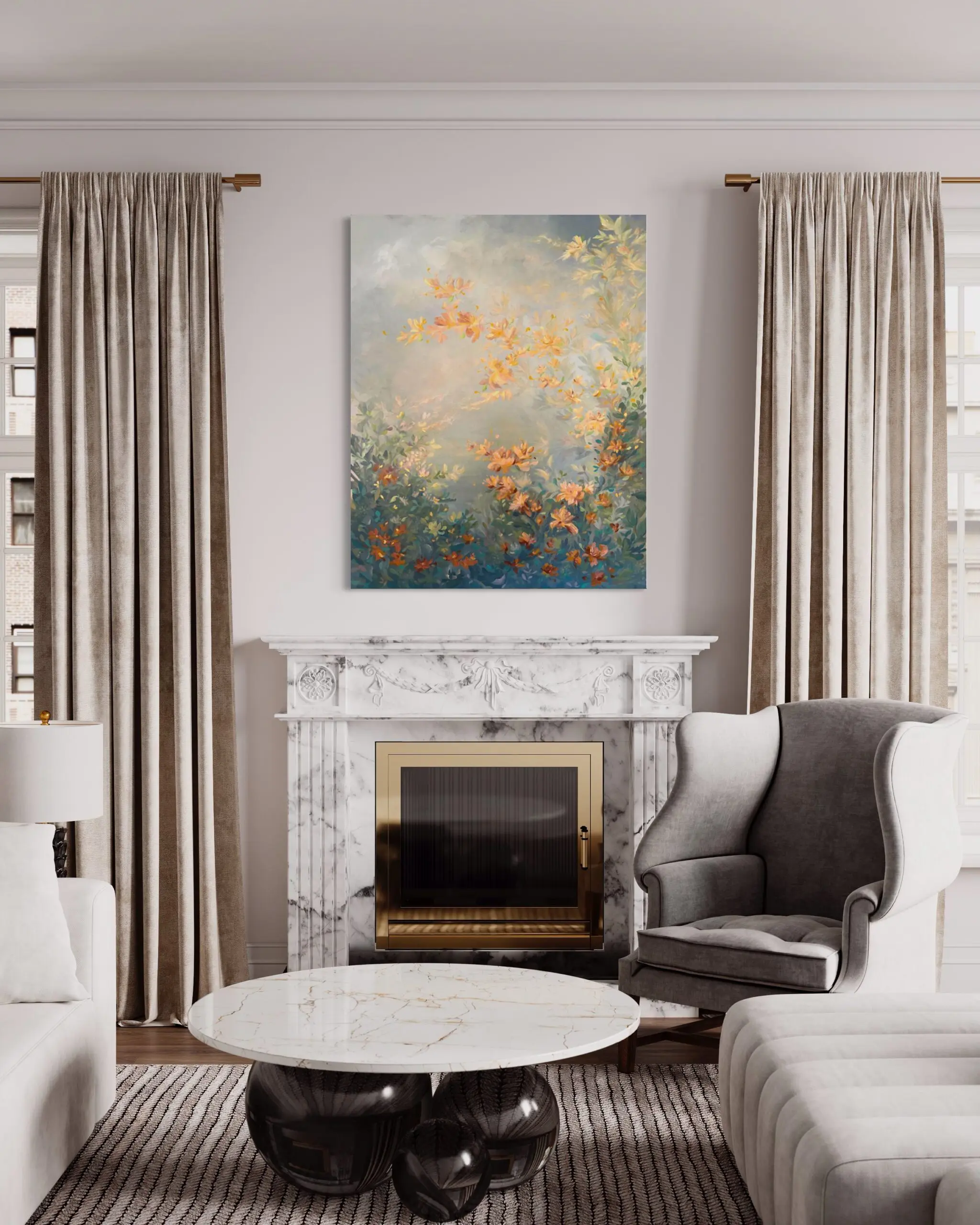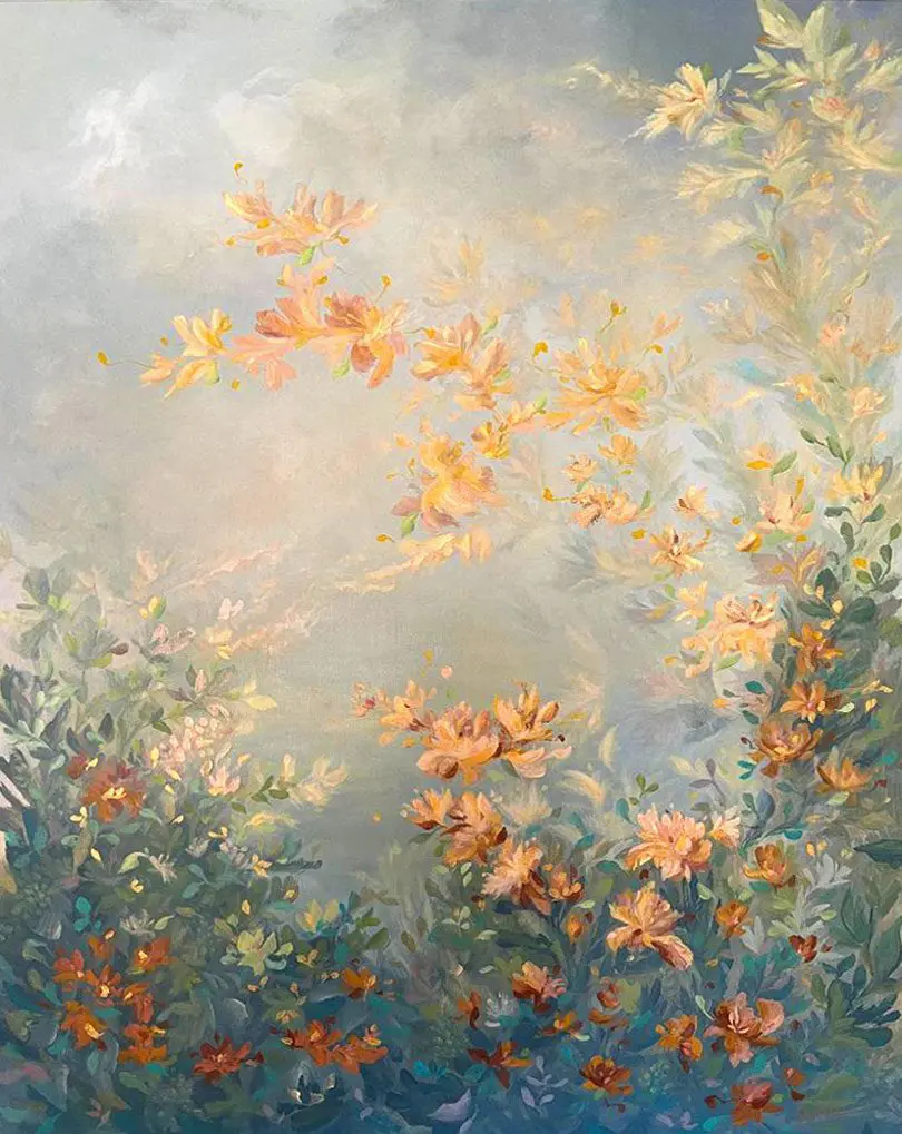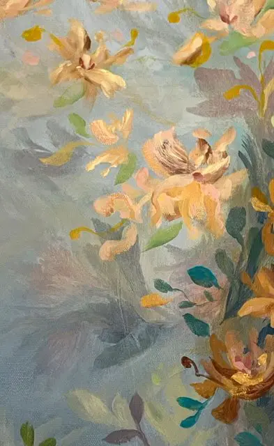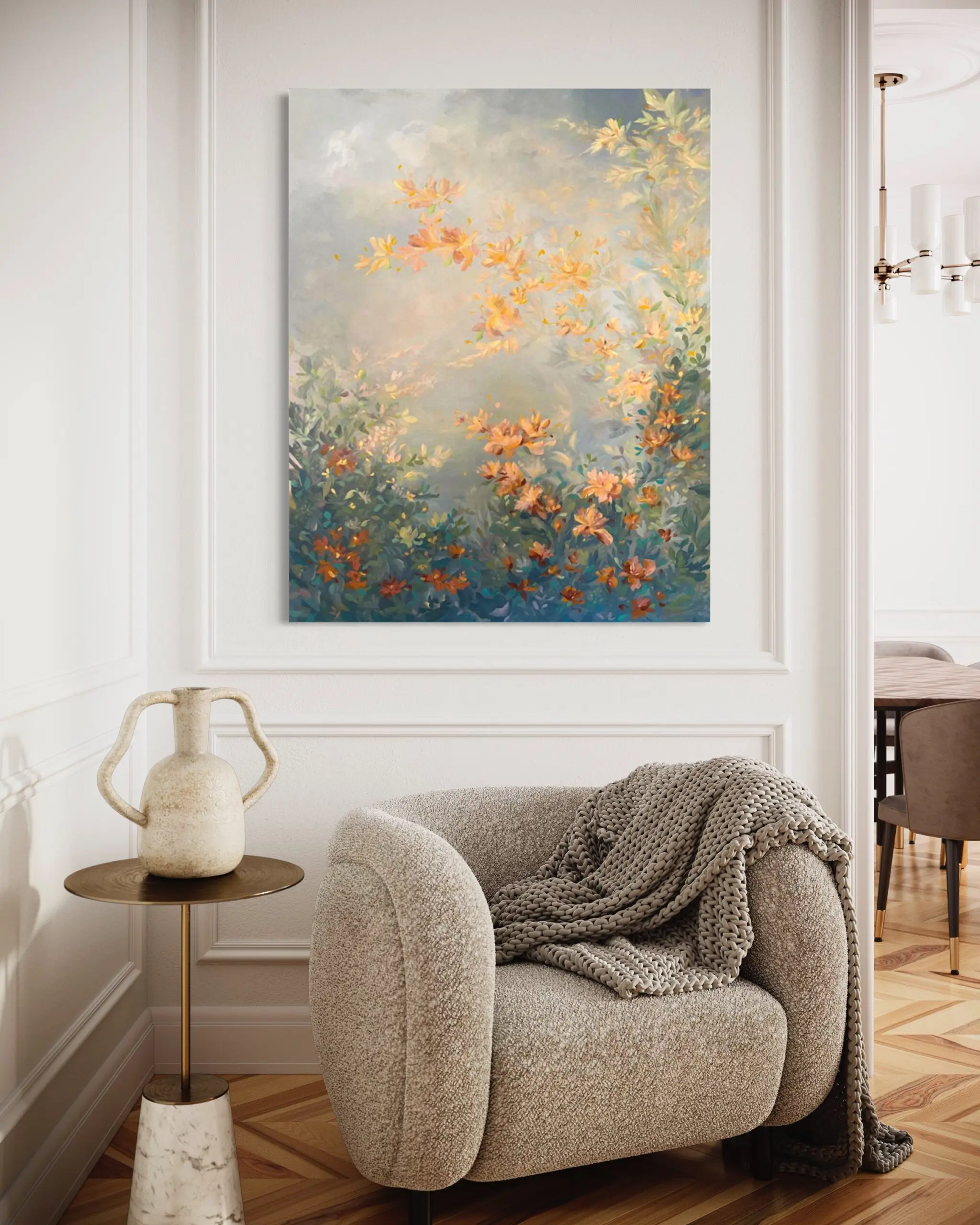 Perpetual Wonder by Jill Daniels is a floral masterpiece that captures the essence of softness and femininity, transporting the viewer into a world of serene beauty. The painting’s canvas is awash in a delicate blend of creamy oranges and beiges, gently cascading like the first light of dawn on a tranquil morning. Against this soothing backdrop, a harmonious interplay of colors and forms and turquoise strokes unfold, accentuating the individuality of each blossom.The central motif of the painting consists of a profusion of exquisite florals, their petals delicately rendered with playful brushstrokes that dance and twirl, as if celebrating their own existence.
