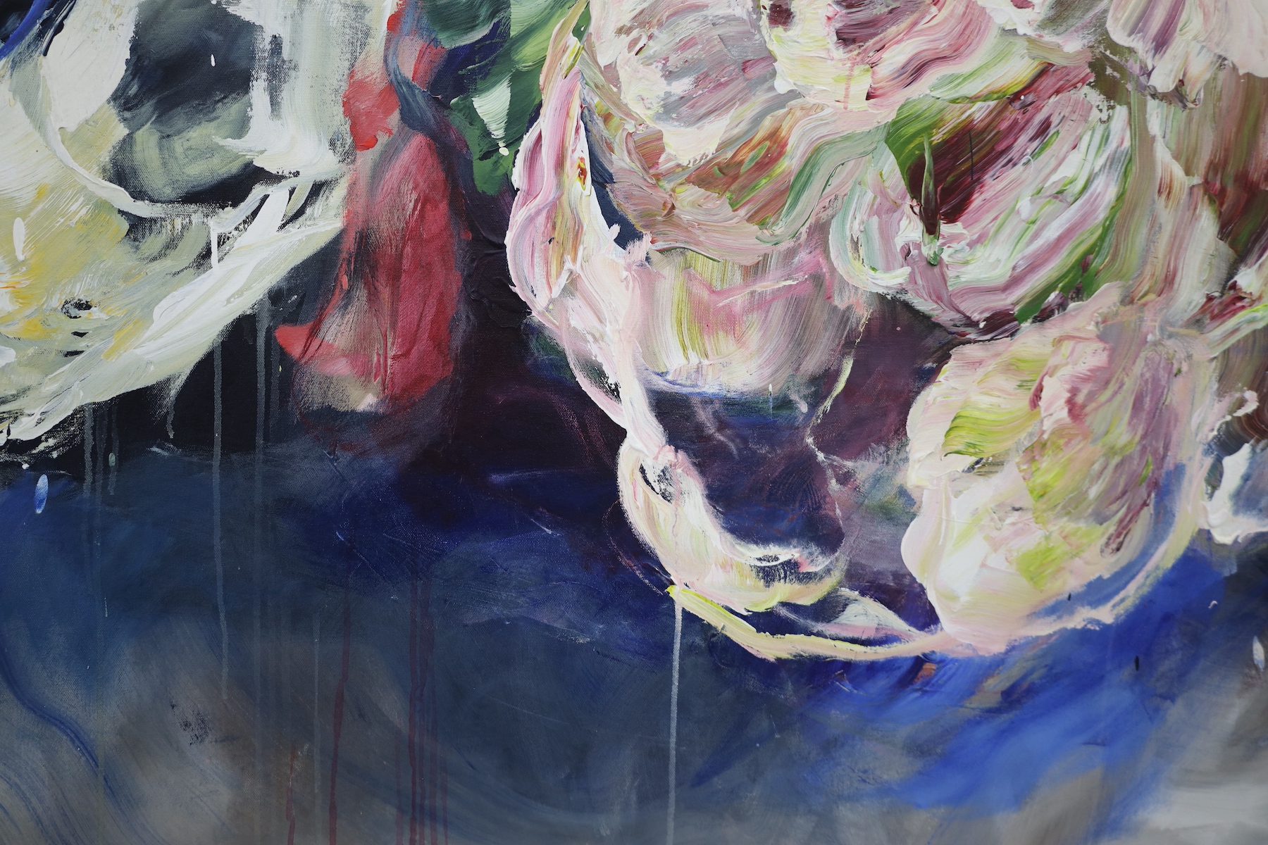 This vibrant painting features suggestive roses, each petal adorned with a unique combination of multicolors—green, fuchsia, white, and yellow—creating a sense of lively unity. The roses appear cuddled together at the center of the canvas, forming a tight cluster that radiates warmth and connection. The vibrant yellows of the petals contrast sharply with deep reds and blues, hinting at another bouquet just behind, ready to emerge. This layering creates depth and intrigue.