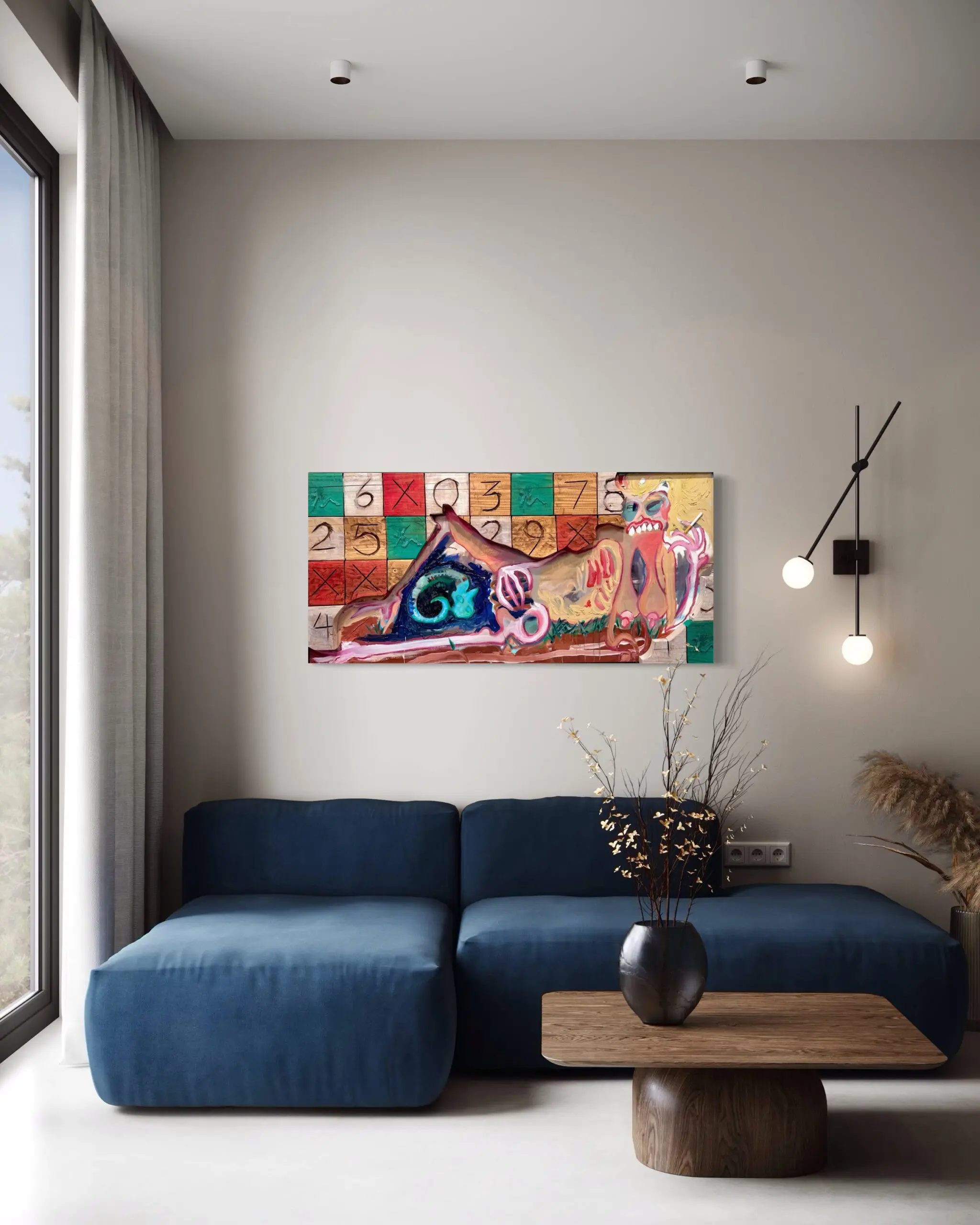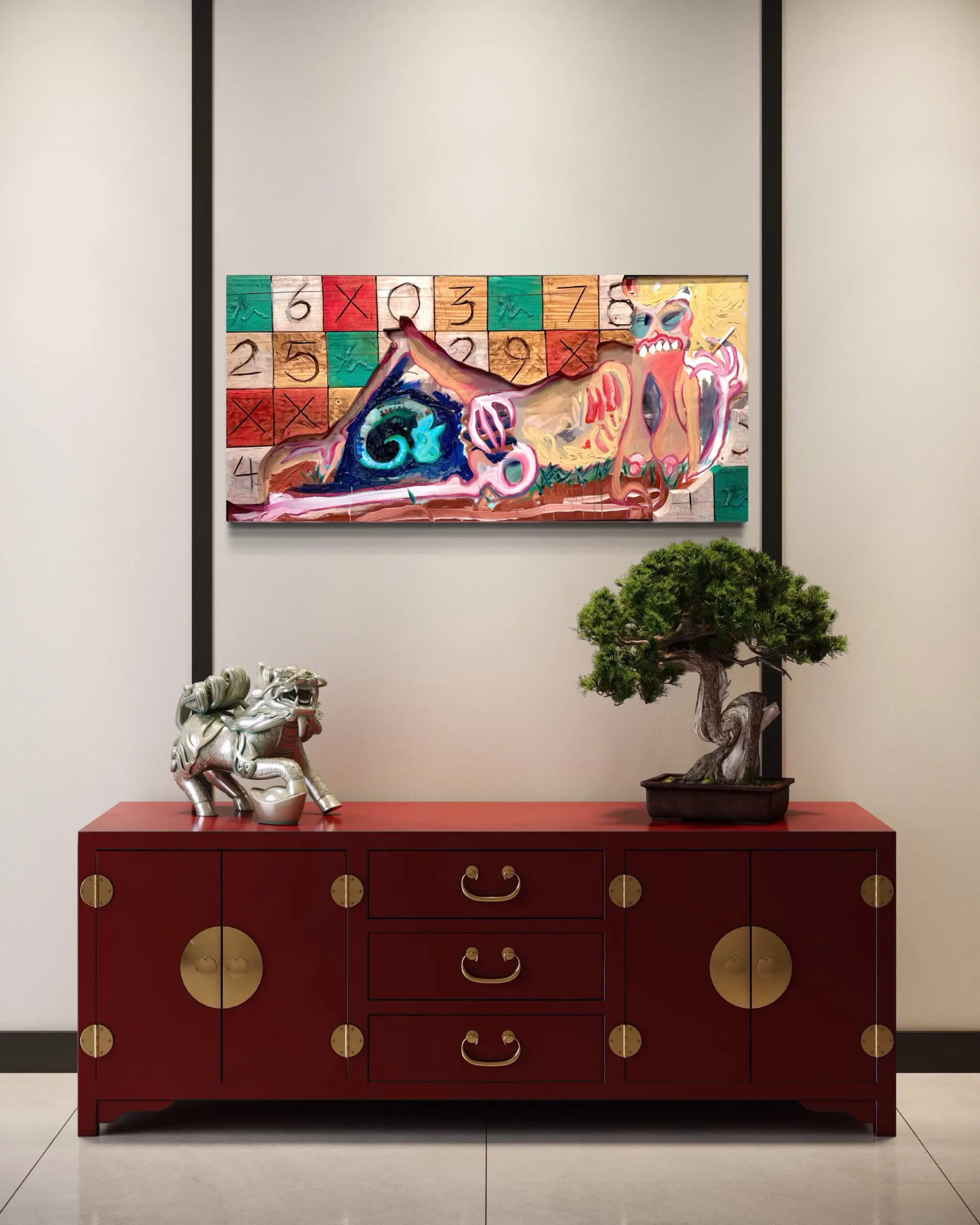 “Pine Box Keno with Tired Pussy” is a raw, unapologetic portrait of addiction, apathy, and the absurdity of routine escape. Rendered with a mix of dark humor and unsettling tenderness, the piece stages a figure reclined in her self-made shrine—a pine box casino altar—lit only by the flickering promises of neon jackpots. Numbers litter the scene like a patchwork shroud, forming the quilt of her coffin, each digit a failed prayer or fading thrill.