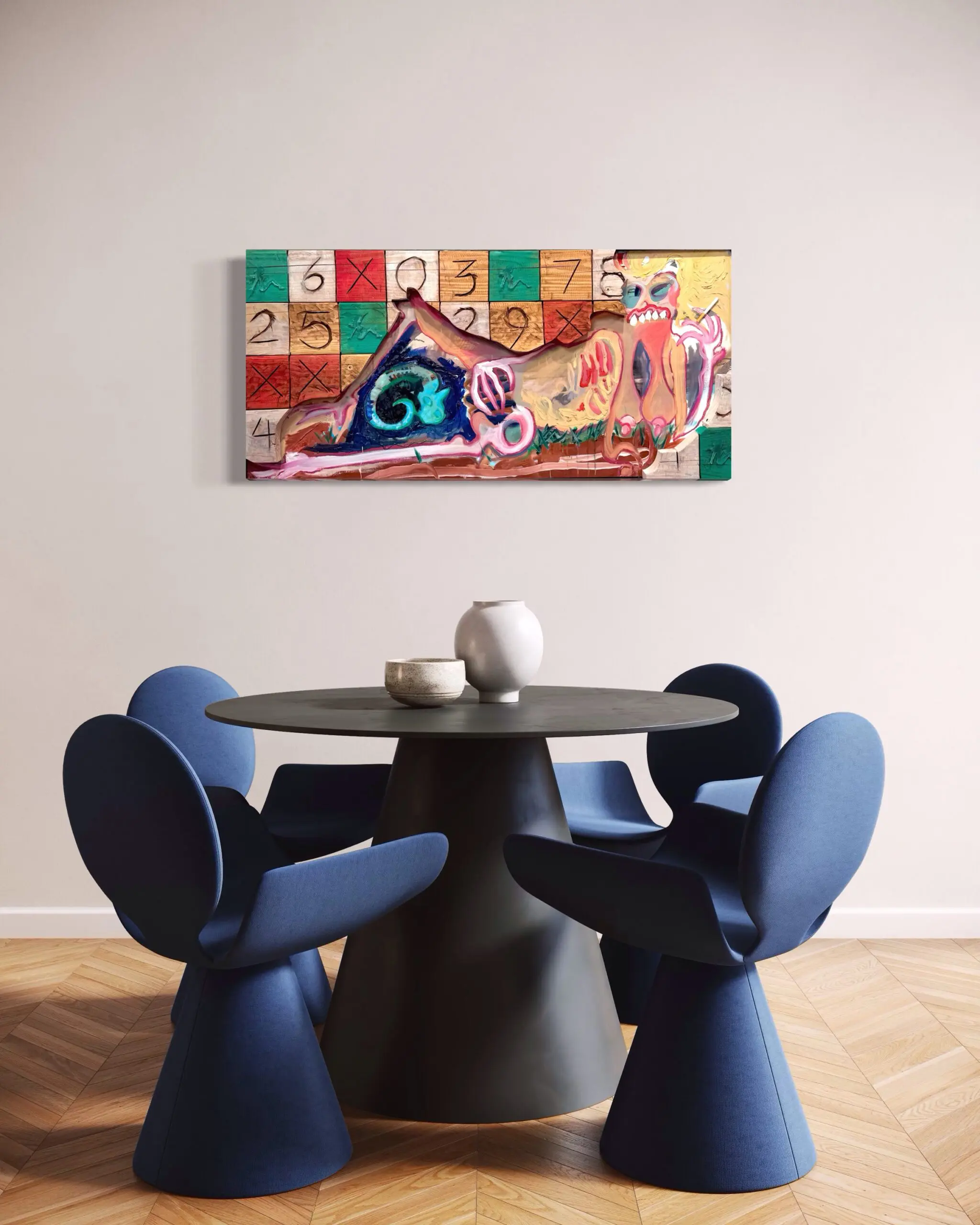 Oil, Acrylic, Resin, Cigarette on Canvas with Carved Wood Elements (Framed)