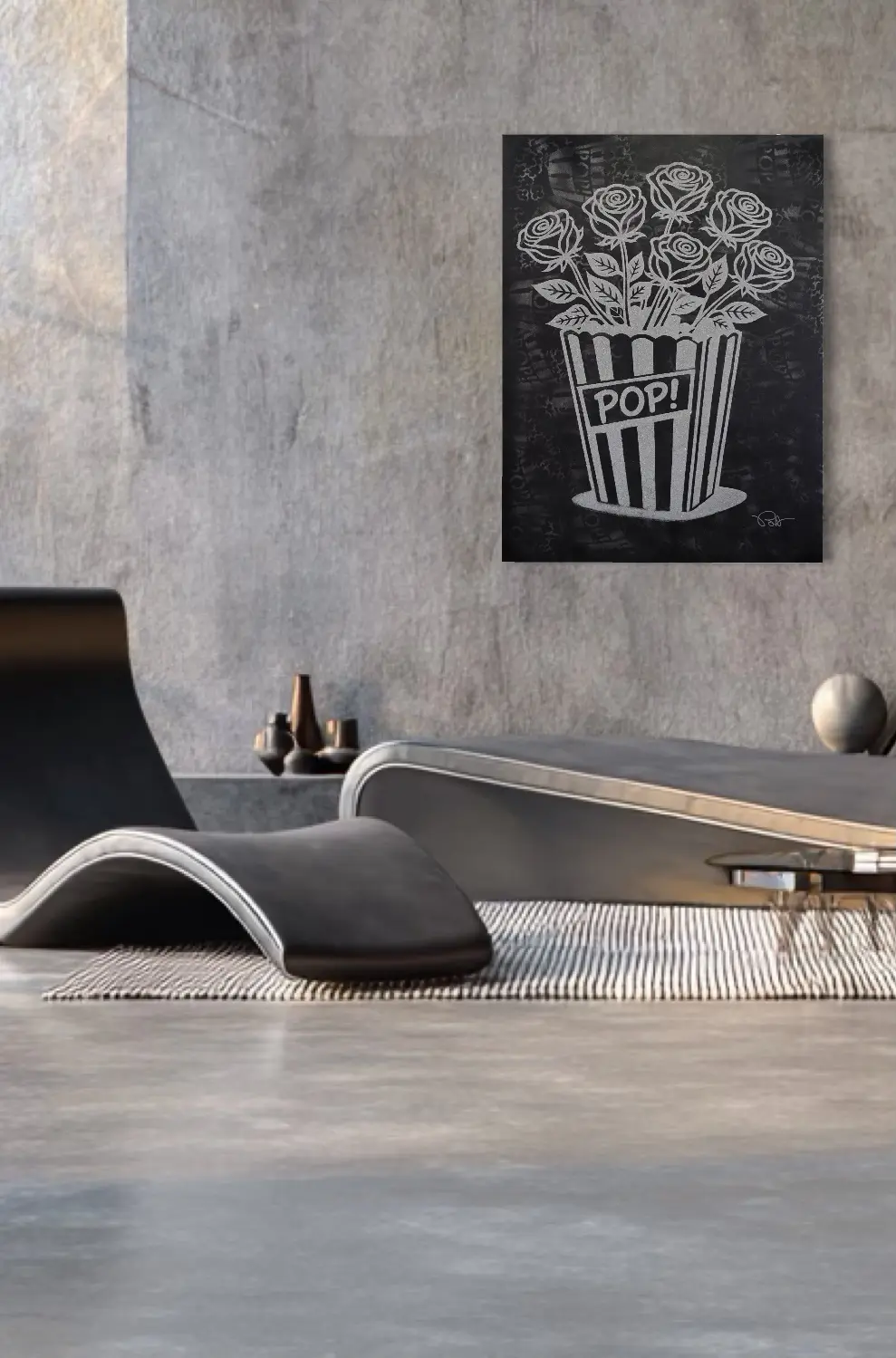 The signature popcorn box, long embedded in Morris’ pop vocabulary, is reimagined as a vessel overflowing with roses. Inspired by a ceramic popcorn vase created by the artist’s daughter, the composition merges pop culture iconography with personal narrative. The result is both celebratory and intimate. The floral lace-like background introduces ornamental density, recalling the serial repetition of Andy Warhol, while pushing contemporary pop art painting toward greater abstraction and materiality.