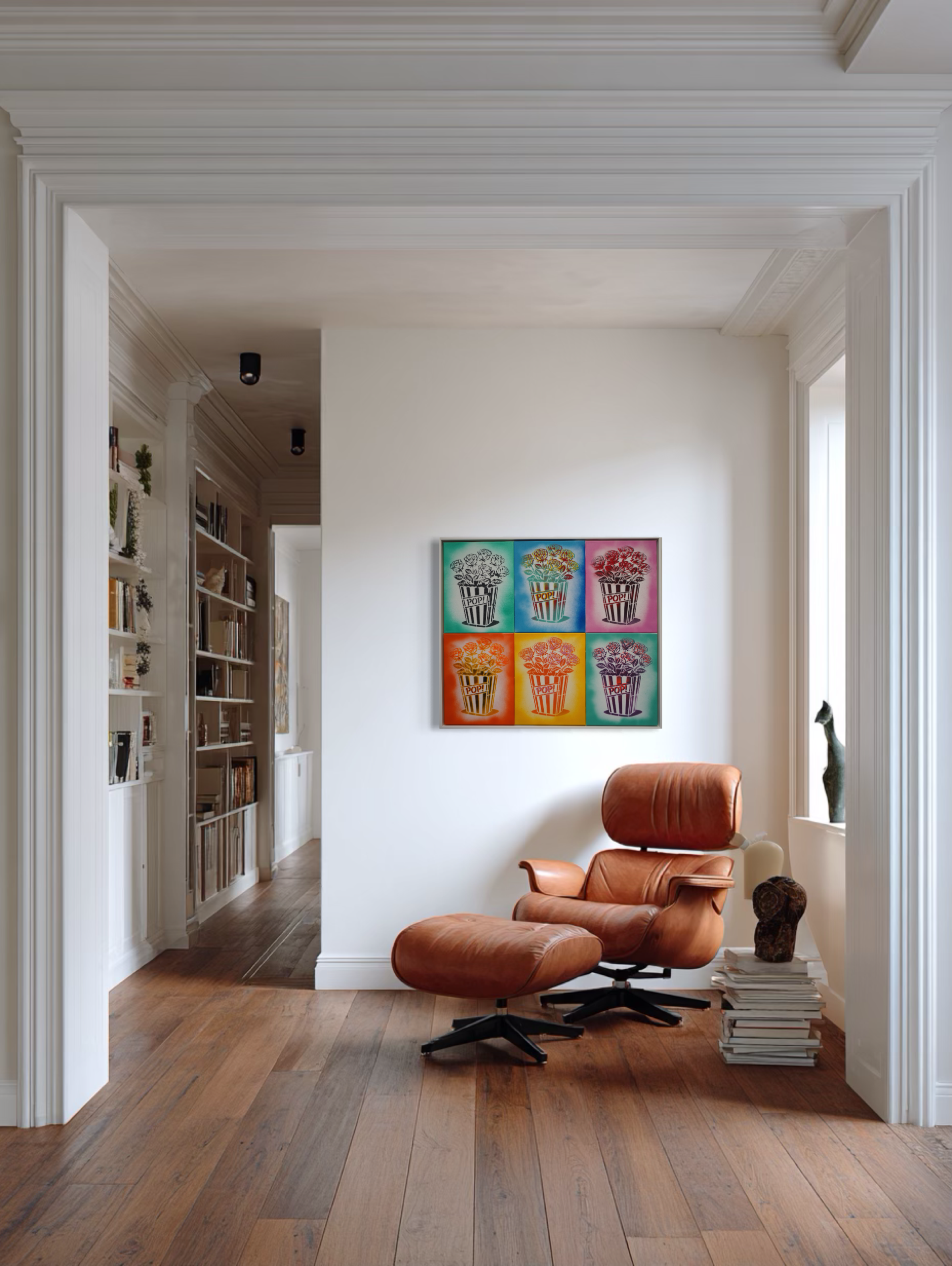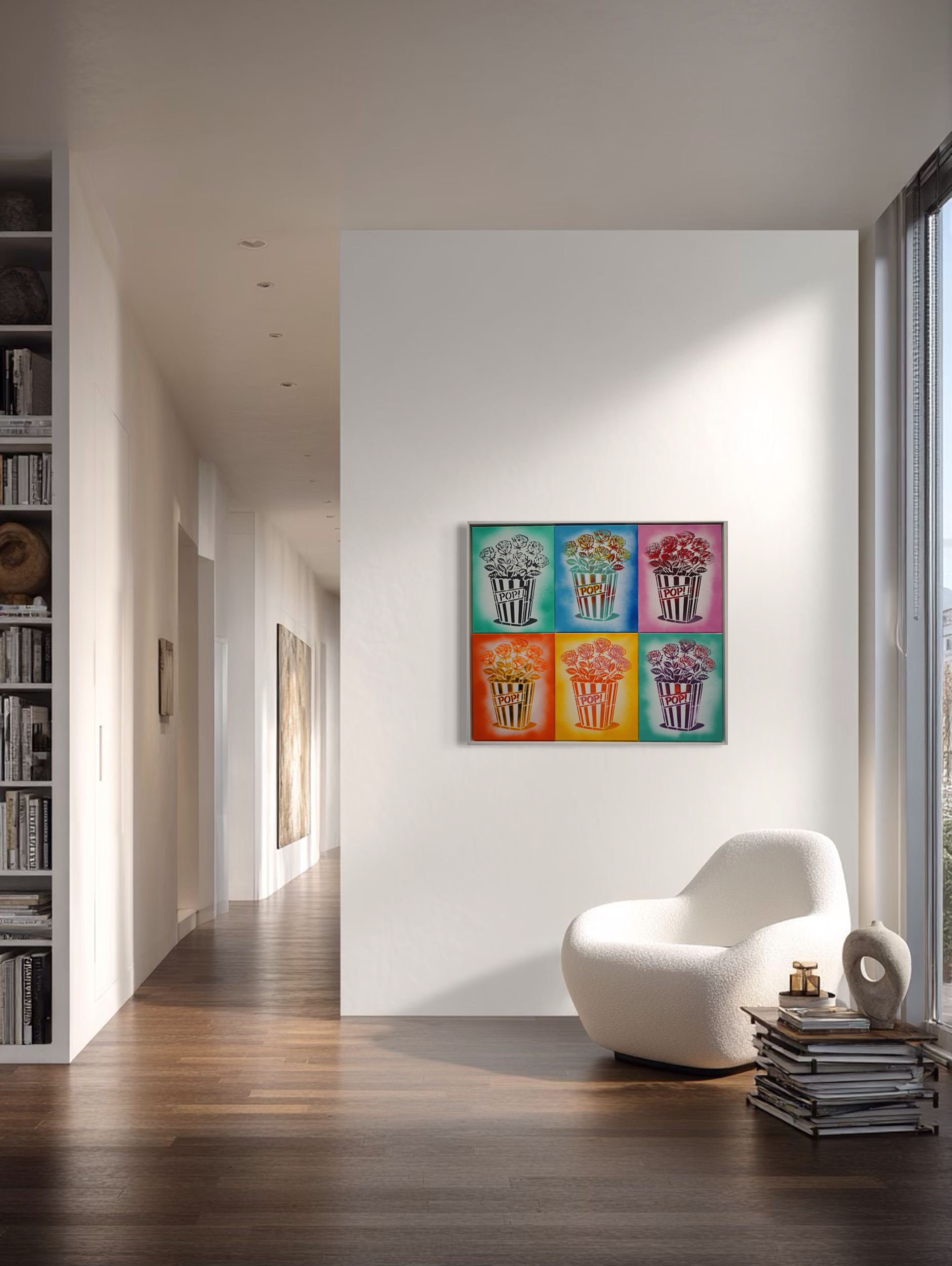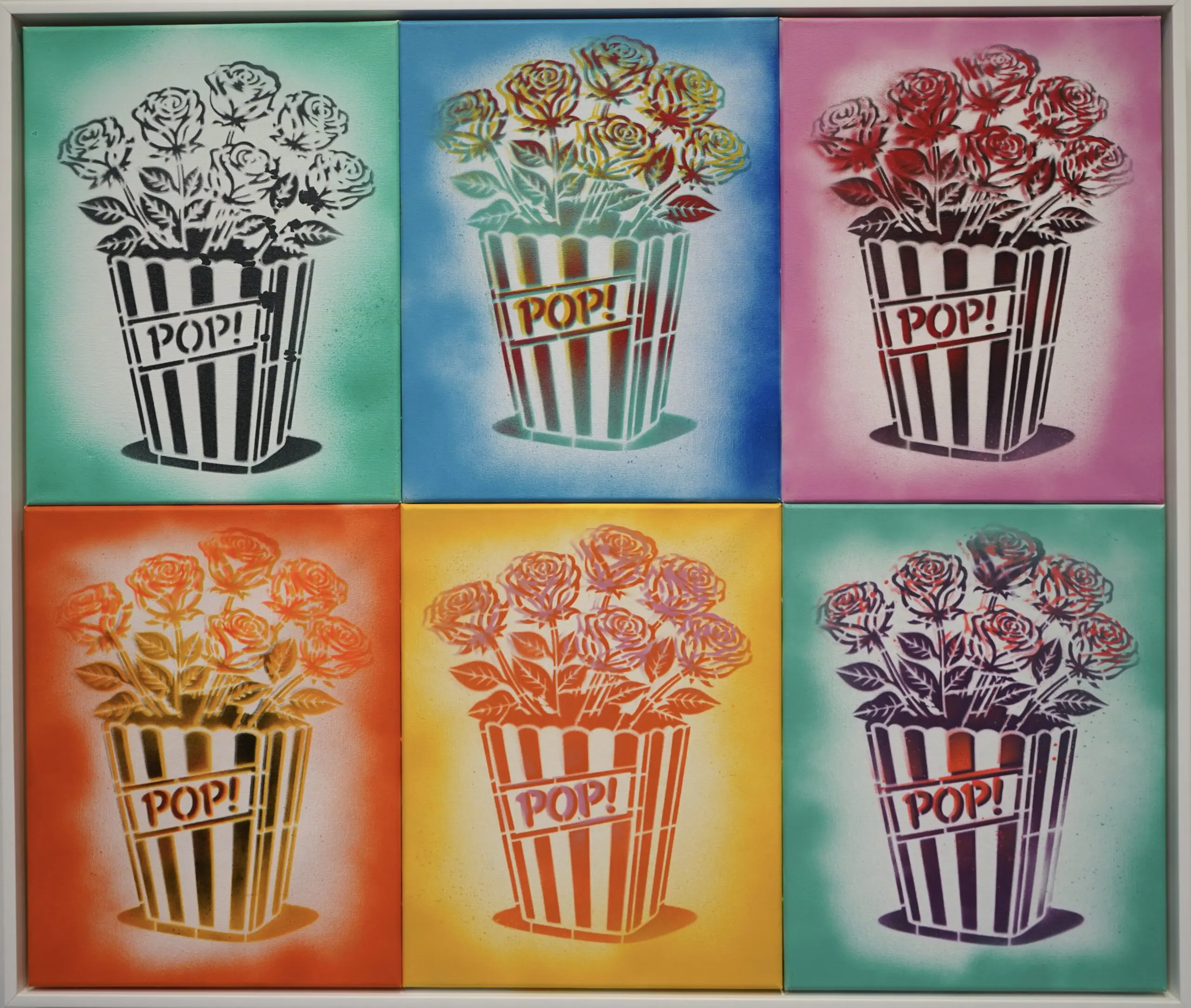 Pop Roses! is presented as part of Burton Morris’ solo exhibition Icons in Bloom at MASH Gallery. The work belongs to the artist’s Pop! x Bang! series, where his signature popcorn box icon is reimagined and filled with roses across multiple color variations. Inspired by a moment of childhood imagination in which Morris’ daughter transformed a popcorn-shaped vessel into a vase for flowers, the work merges the visual language of cinema culture with the romantic symbolism of the rose, bringing together entertainment, beauty, and luxury within a single emblem.