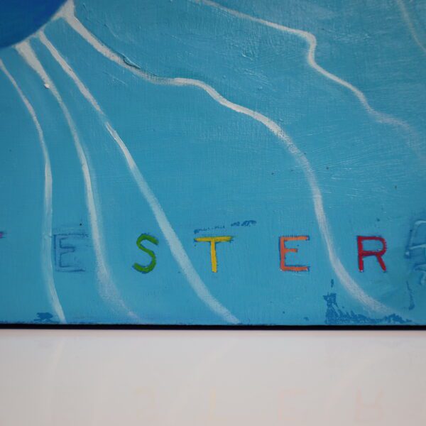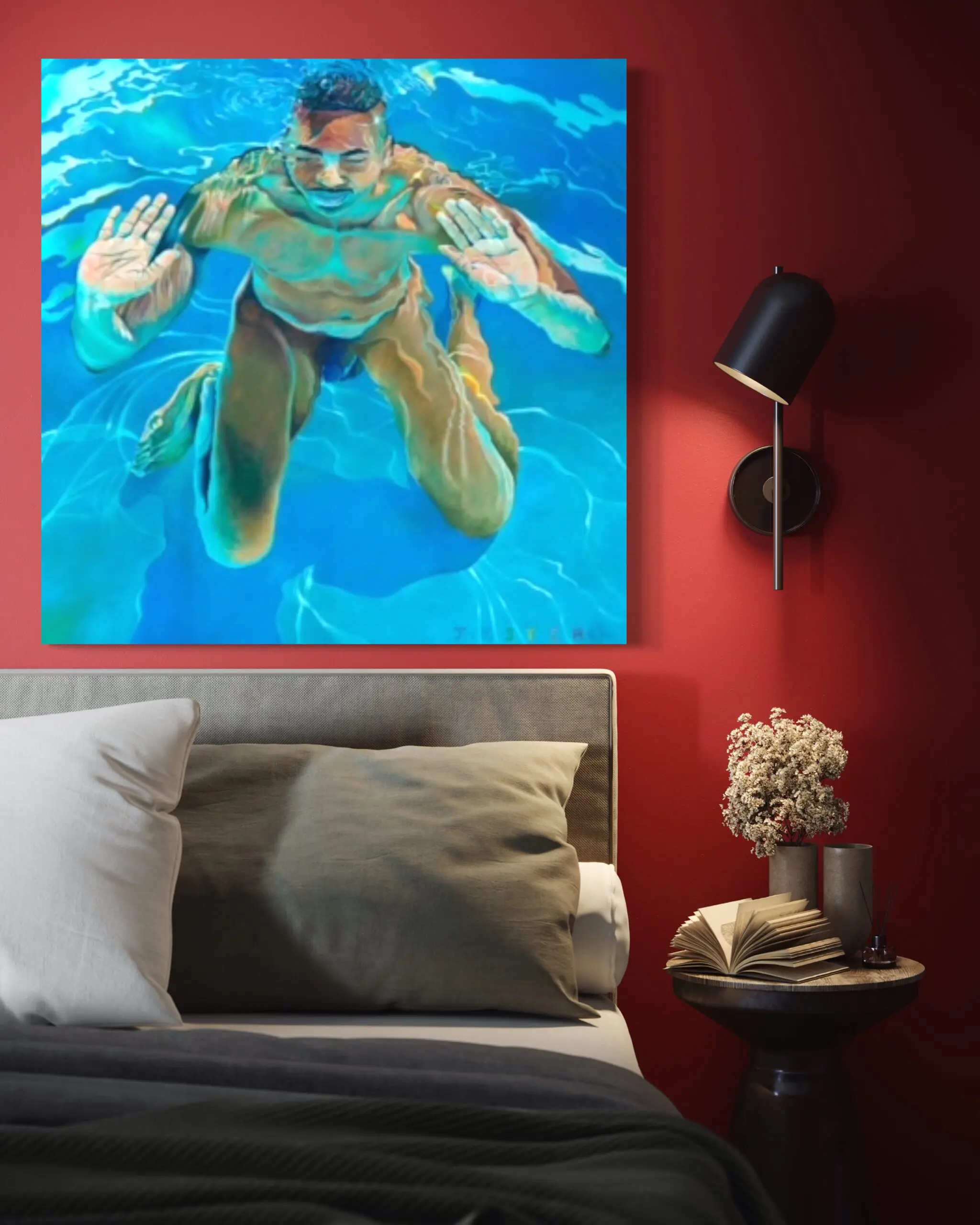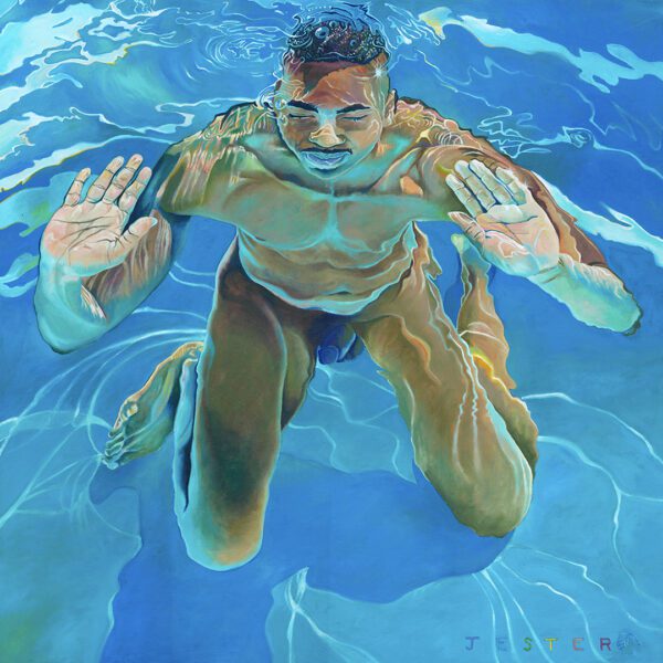 David Jester’s “Prayers” is a depiction of buoyancy, transformation, and the distortions of self through water’s fluid lens. A figure rises toward the surface, hands outstretched as if pressing against an invisible barrier, their body illuminated by the play of light refracting through the pool’s depths. The painting captures a moment of liminality, where the boundary between submersion and emergence, reality and abstraction, body and environment becomes blurred.