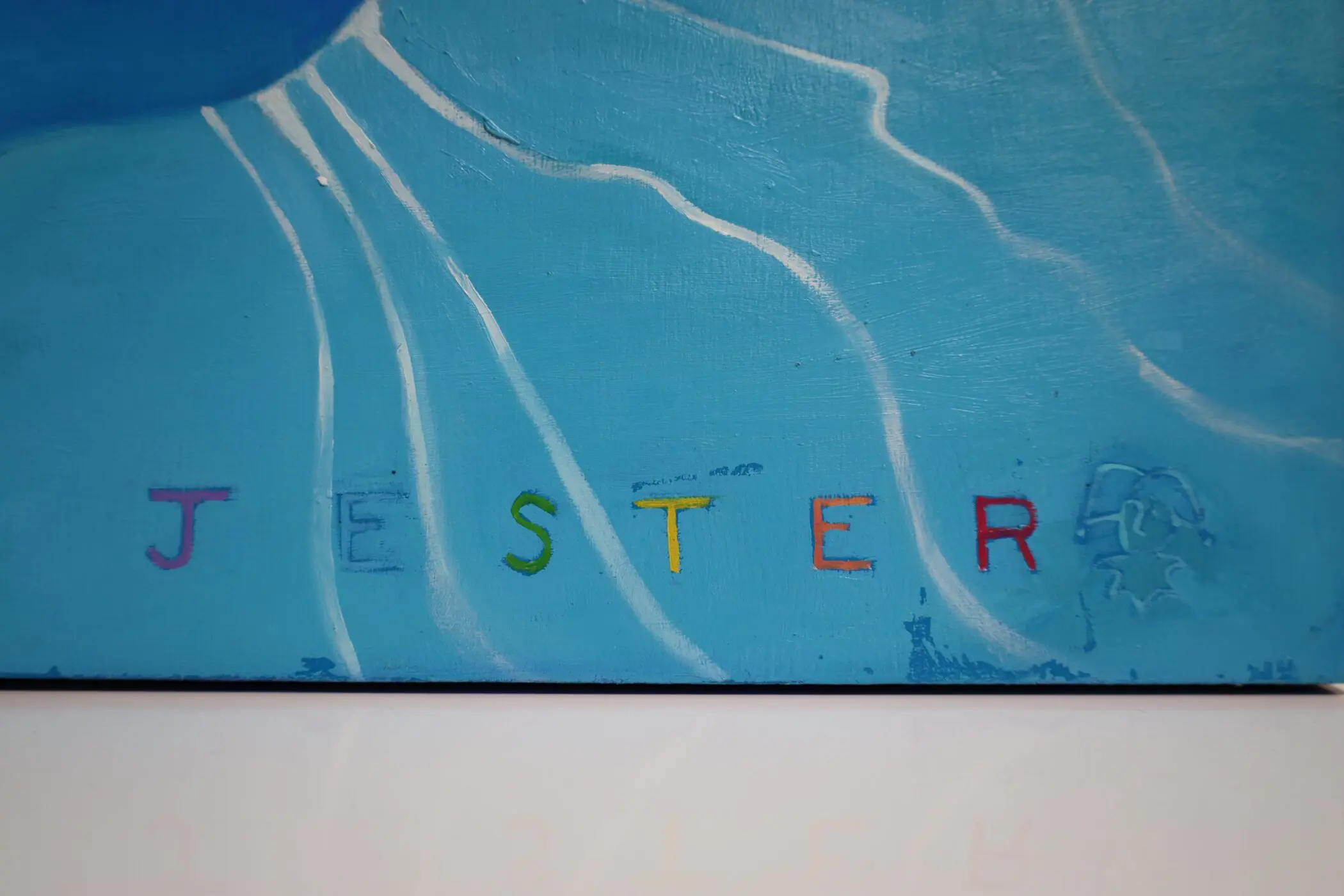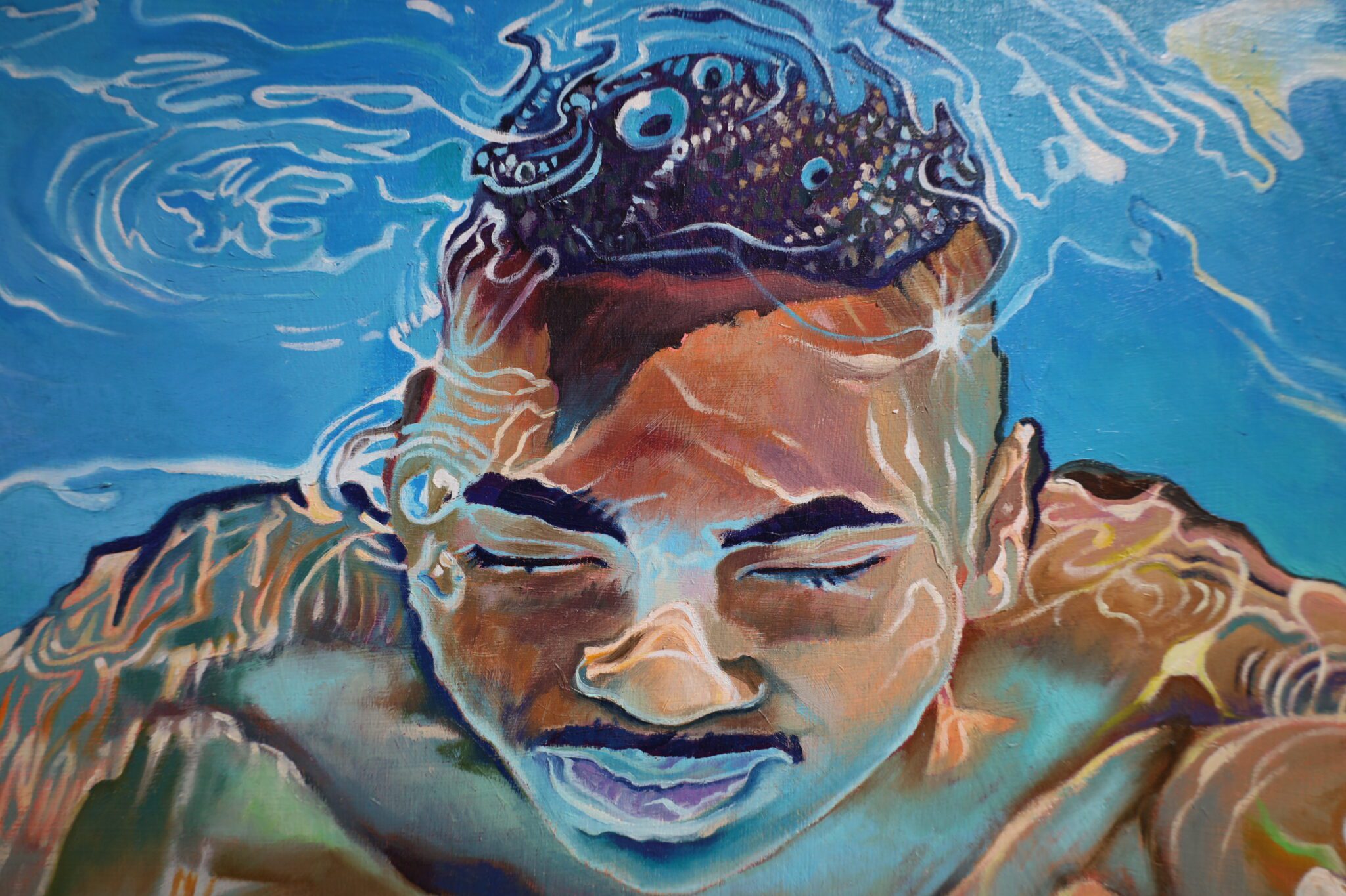 The subject’s serene expression suggests surrender, joy, or contemplation, while the refracted patterns of light and the shimmering ripples evoke a sense of rhythmic movement, making the painting feel almost kinetic. The contrast between sharp realism and fluid abstraction recalls the work of Alyssa Monks and Eric Zener, yet Jester’s execution is distinctly his own—imbued with an energy that is both intimate and universal.