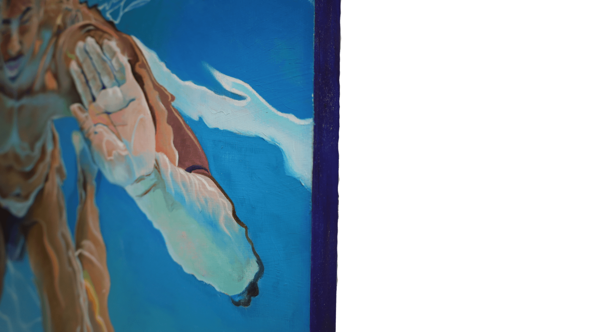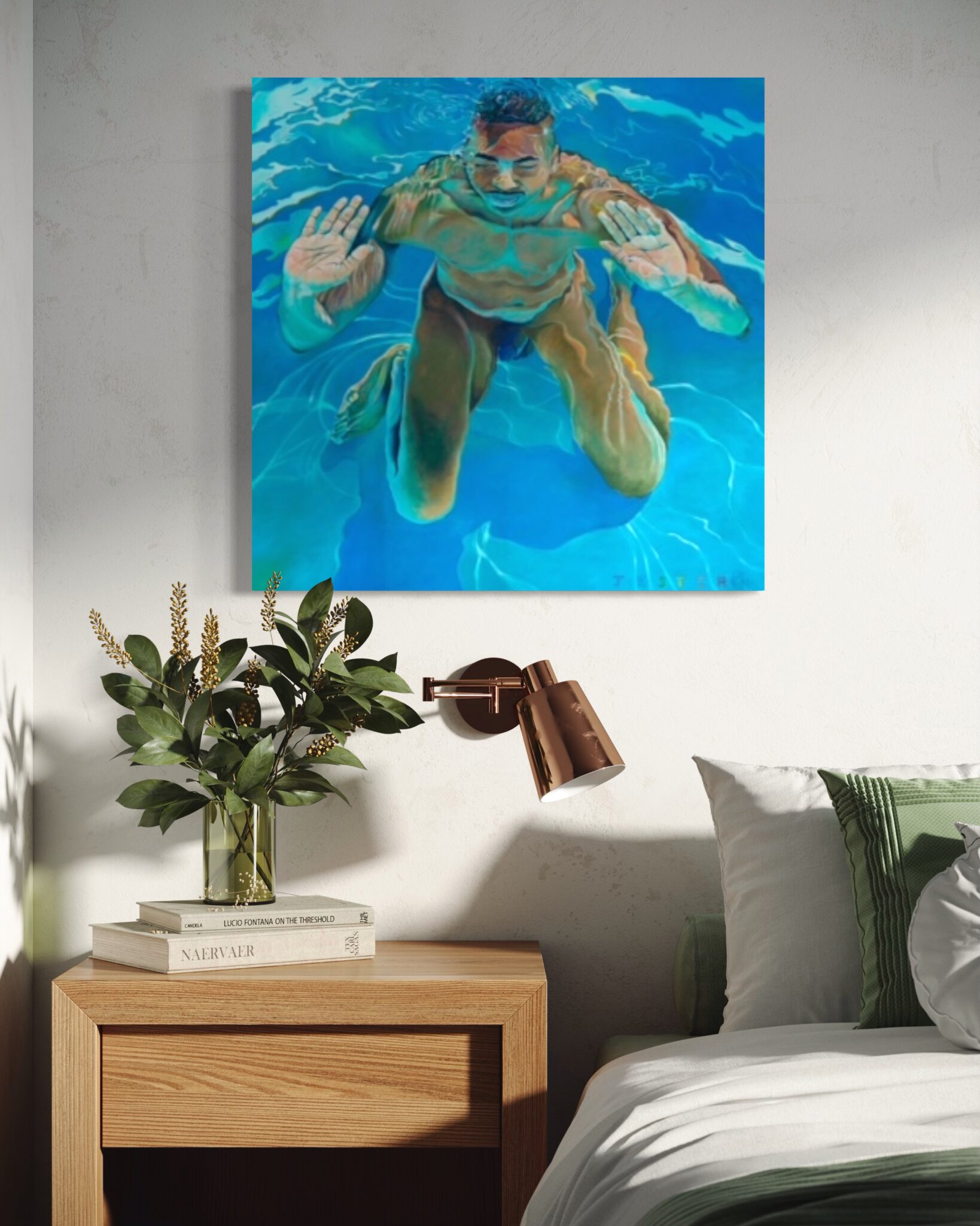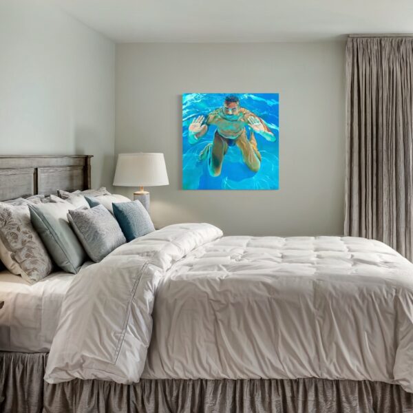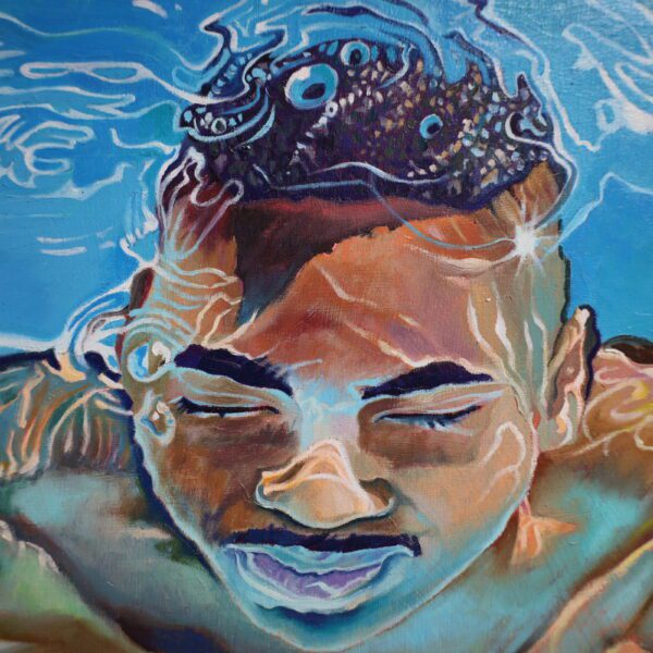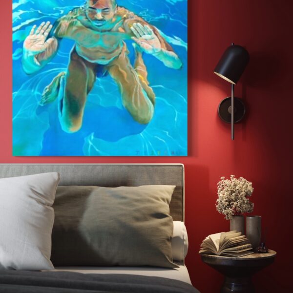 Jester’s masterful use of light and reflection heightens the tension between solidity and fluidity. The interplay of sunlit ripples across the figure’s skin, casting liquid gold and deep sapphire shadows, transforms flesh into an ever-shifting, ephemeral form. The distortion of the face, subtly warped by the water’s movement, reinforces the painting’s exploration of identity and perception—how we see ourselves versus how we are seen through the lenses of water, movement, and light.