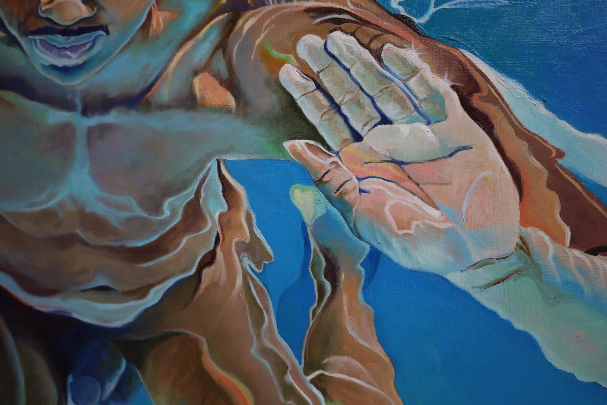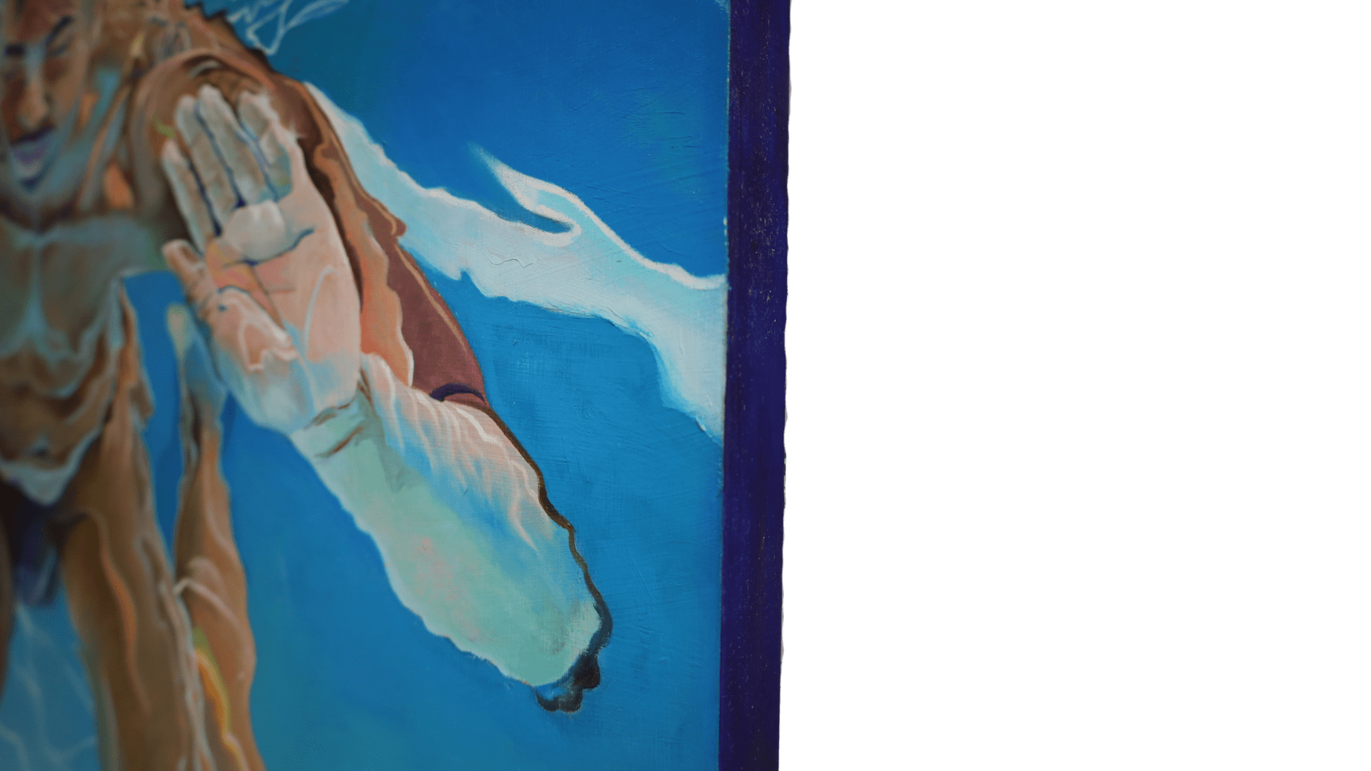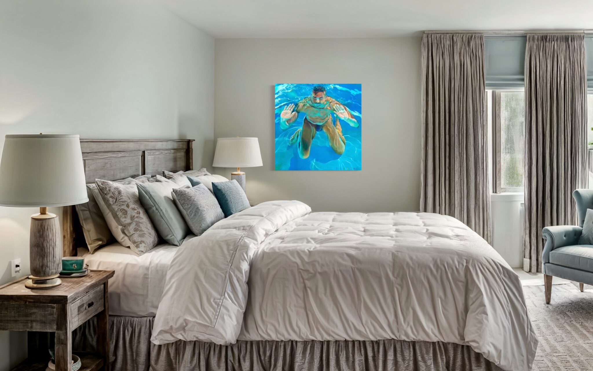Jester’s masterful use of light and reflection heightens the tension between solidity and fluidity. The interplay of sunlit ripples across the figure’s skin, casting liquid gold and deep sapphire shadows, transforms flesh into an ever-shifting, ephemeral form. The distortion of the face, subtly warped by the water’s movement, reinforces the painting’s exploration of identity and perception—how we see ourselves versus how we are seen through the lenses of water, movement, and light.