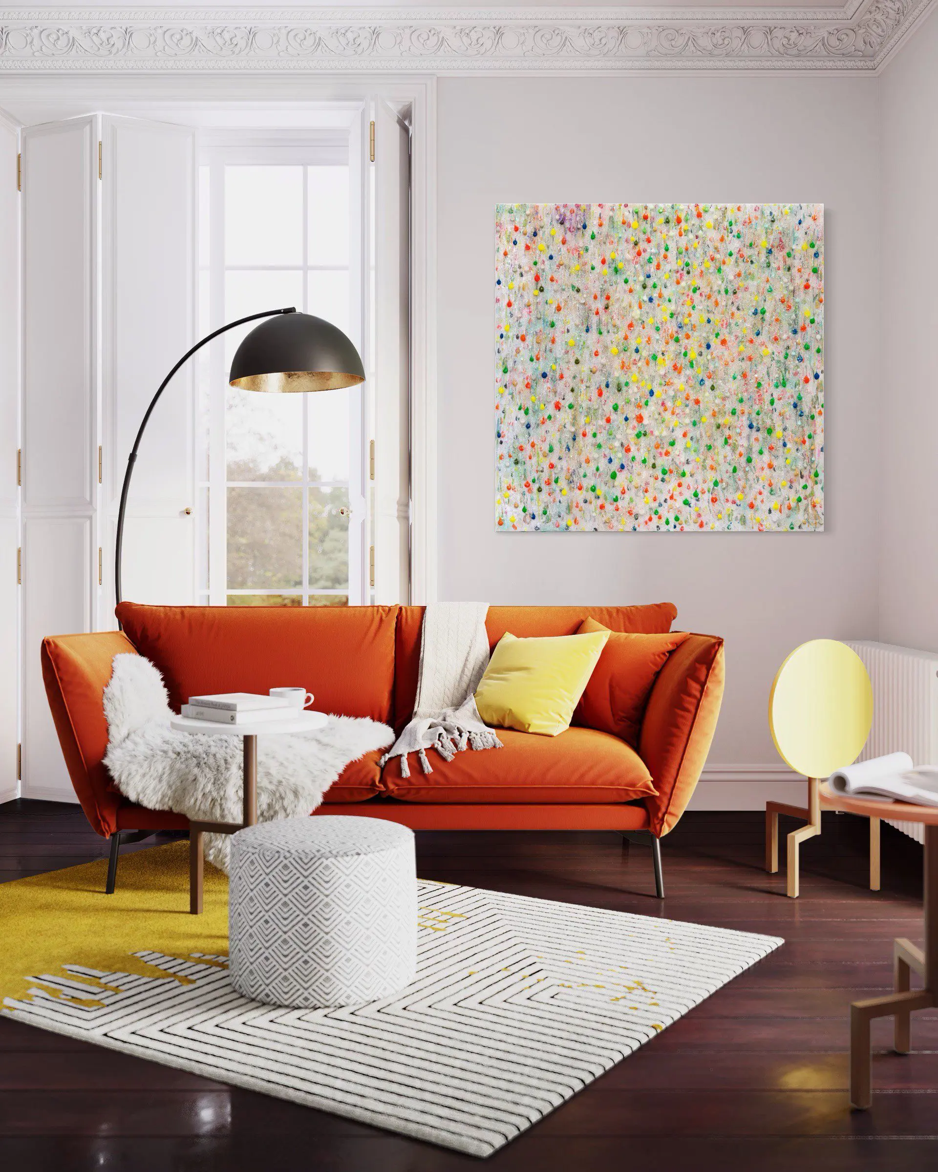 Despite its structured repetition, “Rain Dance I” remains organic and free-flowing. The scattered placement of color ensures the piece never feels rigid, reinforcing the idea that this isn’t a controlled pattern, but a dance—an unpredictable, joyful celebration of motion.