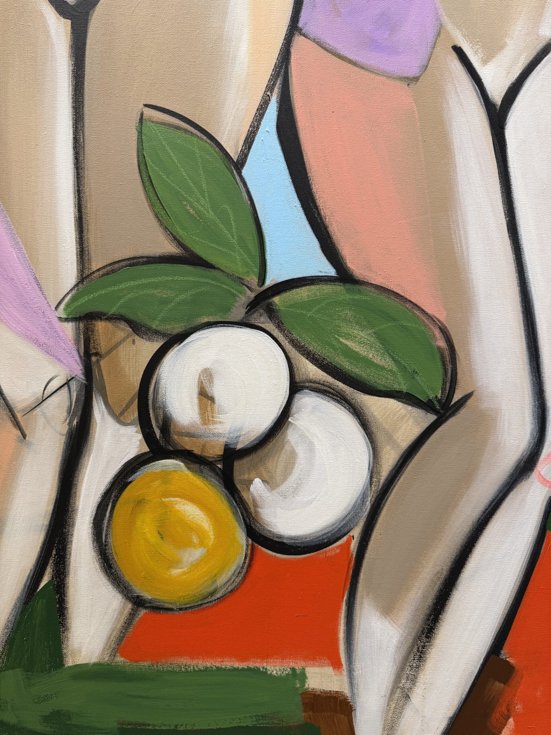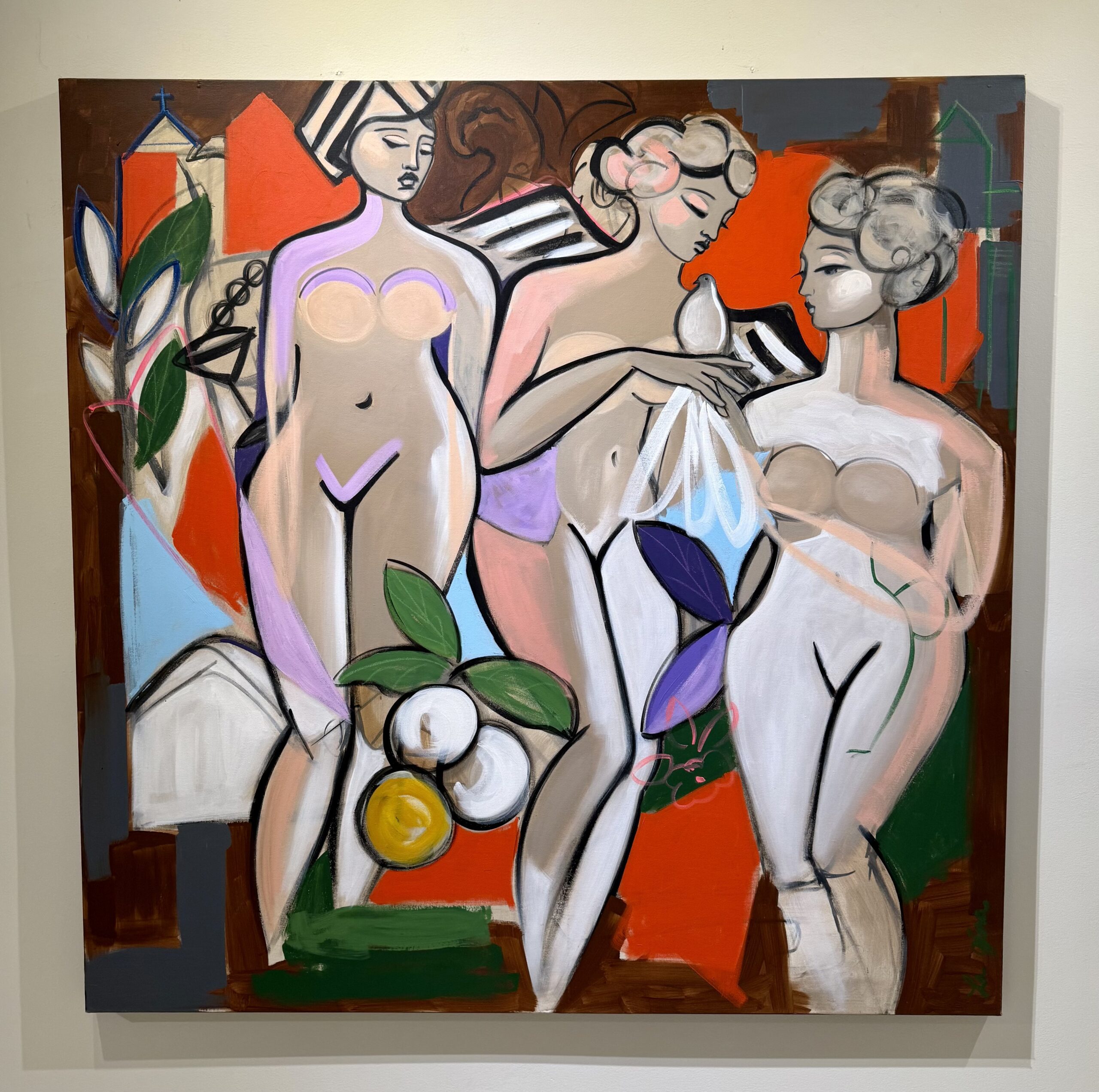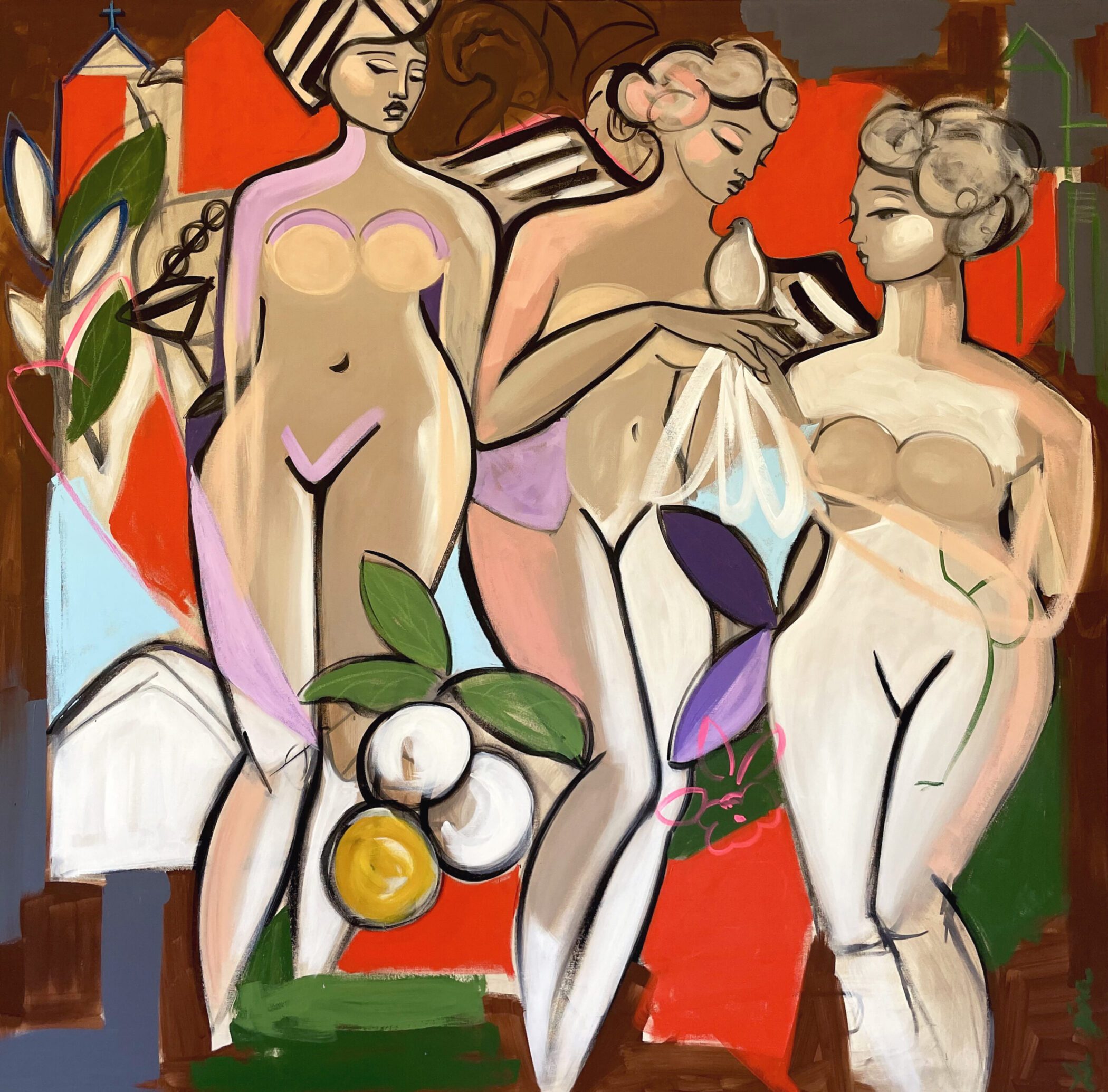 Symbolic elements—fruit, flowers, and a delicate dove—appear throughout the composition, reinforcing themes of fertility, growth, and spiritual awakening. The presence of a red church in the background hints at cultural and religious traditions, framing the figures within a narrative of sacred rites and ancestral knowledge. Their sculptural hair and flowing garments recall the grandeur of classical frescoes, yet the artist’s fragmented, modernist approach disrupts historical expectations, positioning the figures in a realm that is both timeless and urgent.