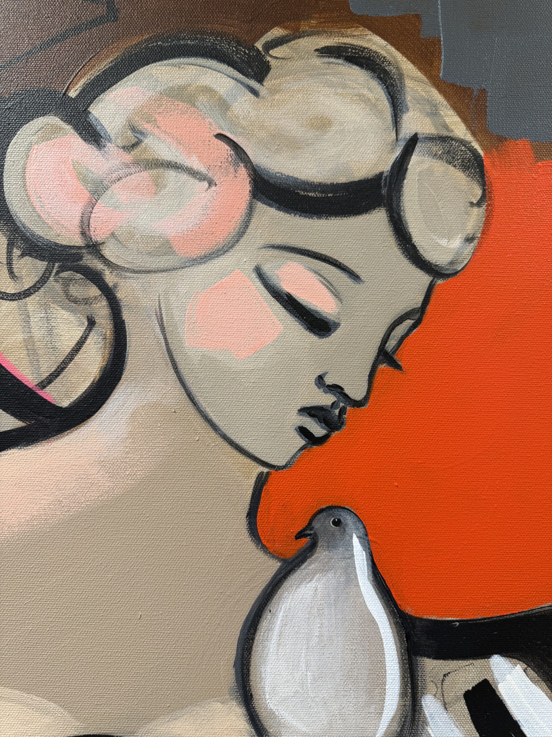 The artist’s expressive use of color heightens the painting’s emotional depth—earthy browns and greens ground the composition in nature and tradition, while flashes of red and orange introduce energy, vibrancy, and the pulse of transformation. The interplay of soft curves with angular, geometric forms creates a rhythmic dynamism, reflecting the ever-evolving journey of femininity and self-discovery.