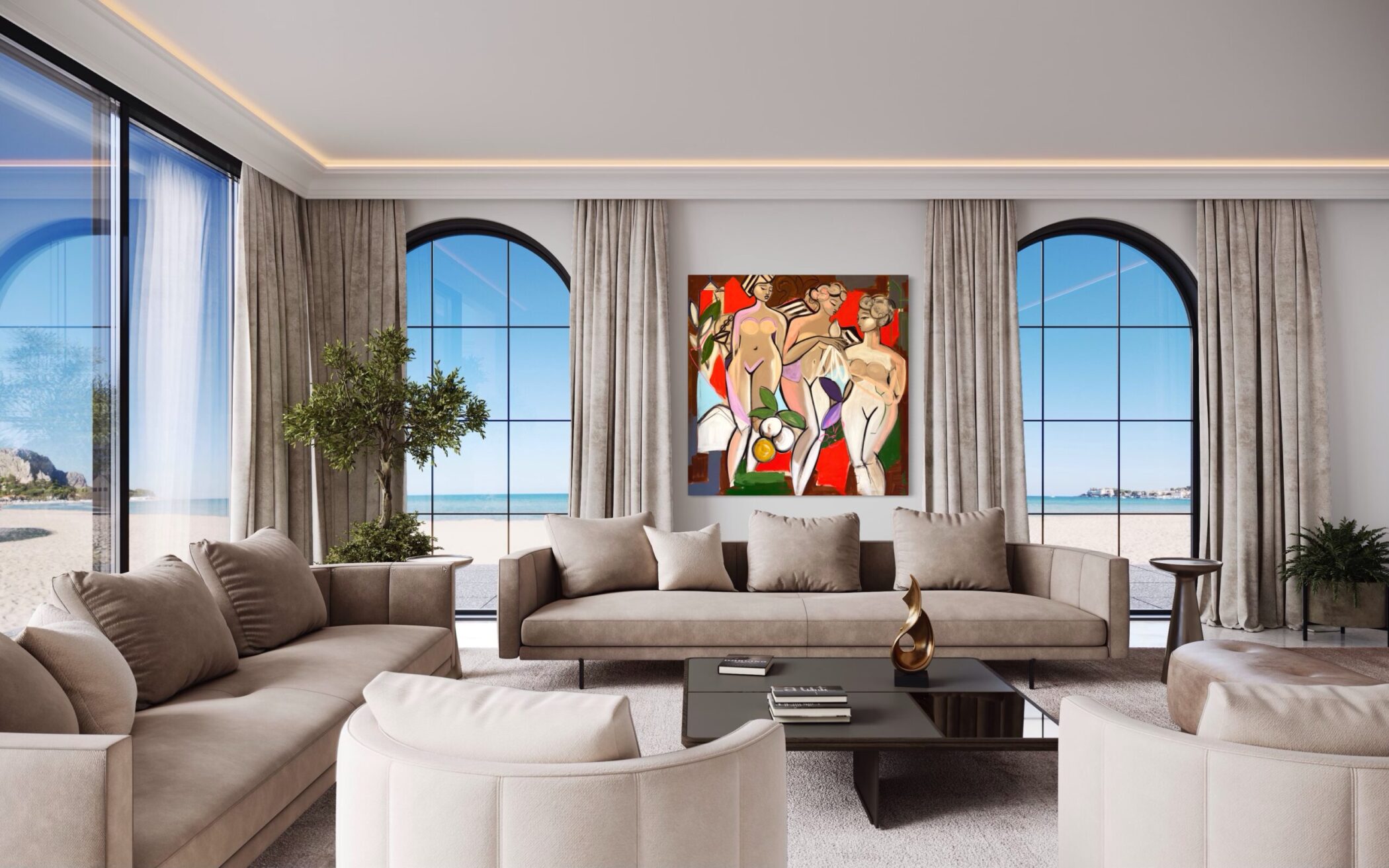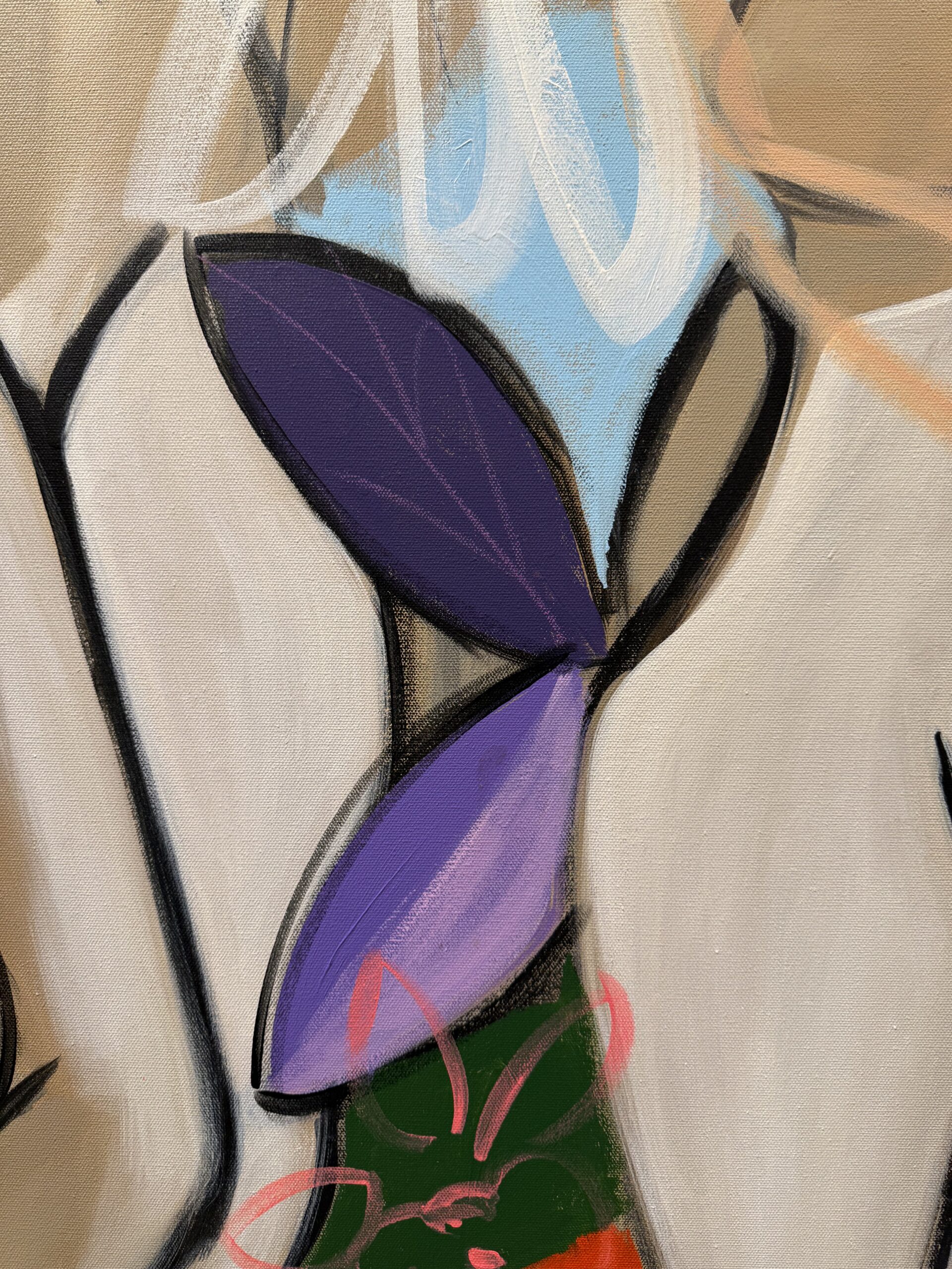 “Rite of Passage” is a powerful figurative composition, where classical influences merge with modern abstraction to explore themes of womanhood, transformation, and spiritual evolution. The artist crafts a richly symbolic tableau, evoking a sense of ancient ceremony and sacred tradition, while infusing the piece with contemporary energy and abstraction.