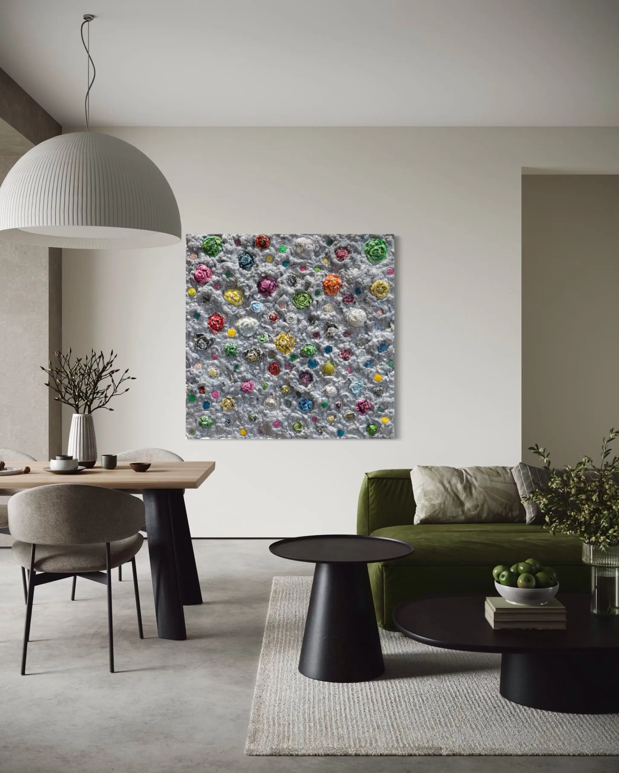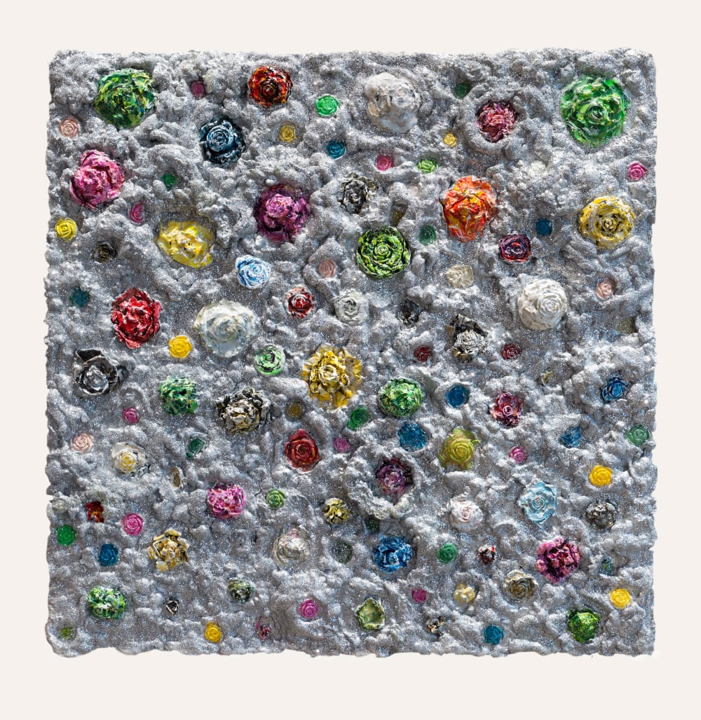 Each individual rose, crafted in a variety of materials and colors, acts as a microcosm of texture and hue. The vibrant yellows, reds, greens, and blues stand out against the silver-gray backdrop, creating a sense of movement and playfulness. The meticulous placement of these blooms, arranged in an undulating, non-linear pattern, gives the painting an almost musical cadence—like a constellation of flowers suspended in time. The contrast between soft and hard, organic and synthetic, suggests a deeper commentary on endurance—how beauty persists and adapts even in the most unexpected environments.
