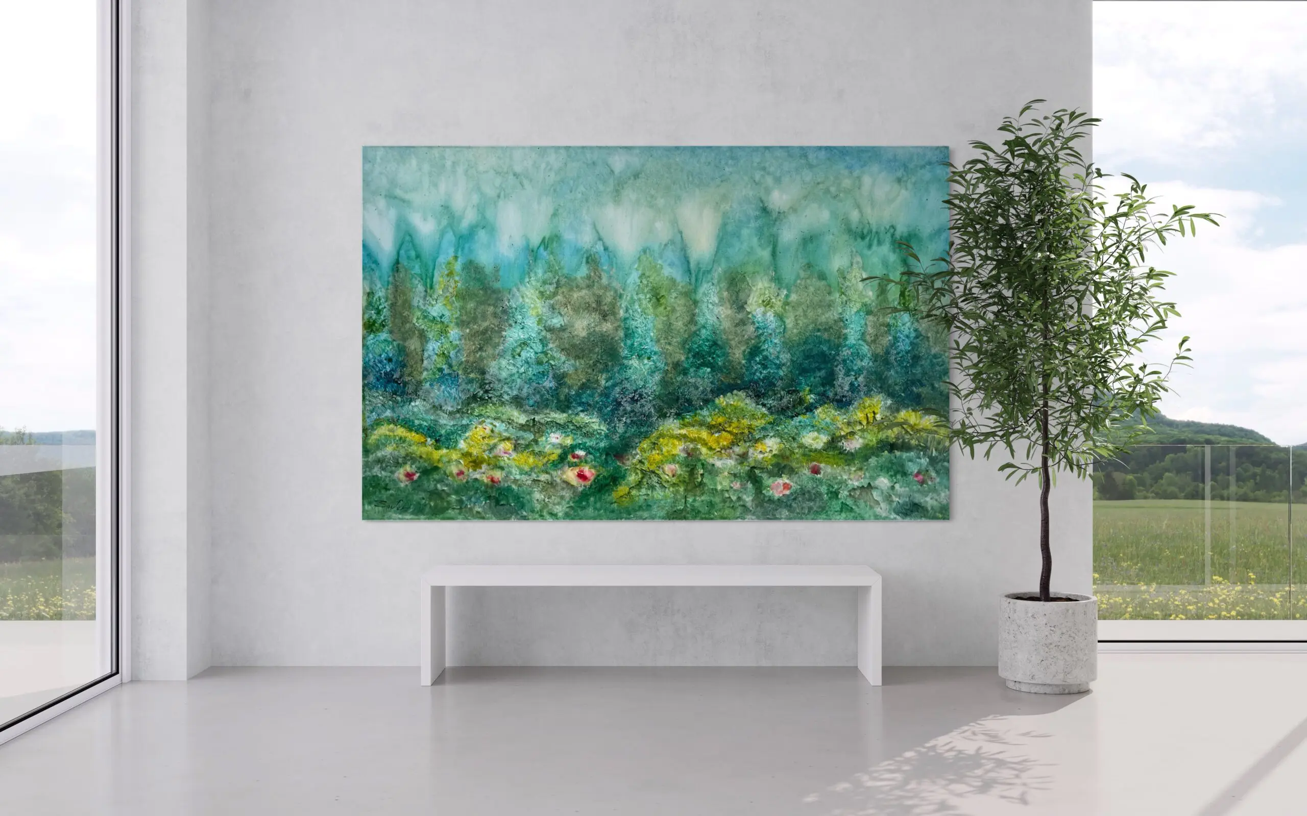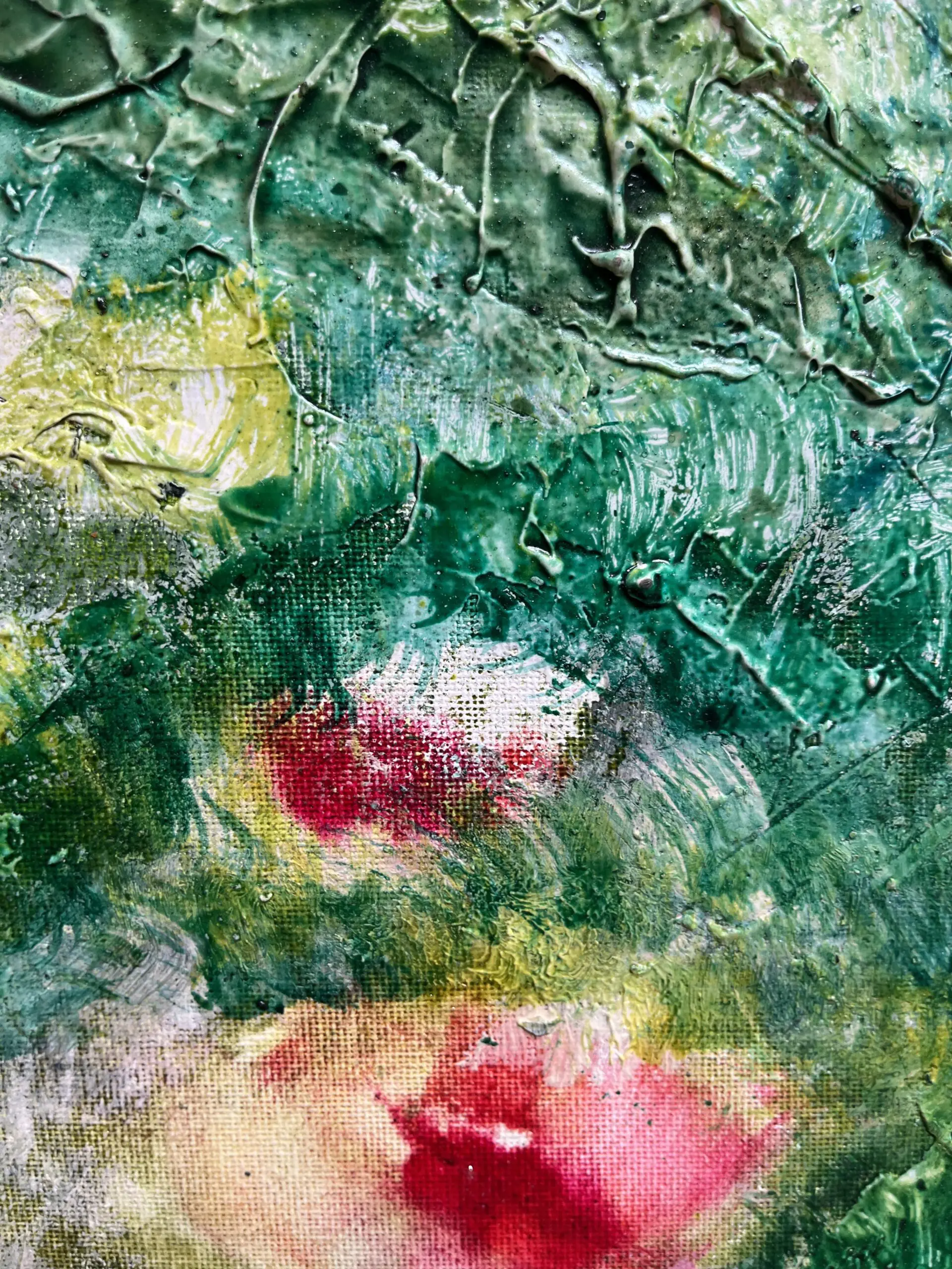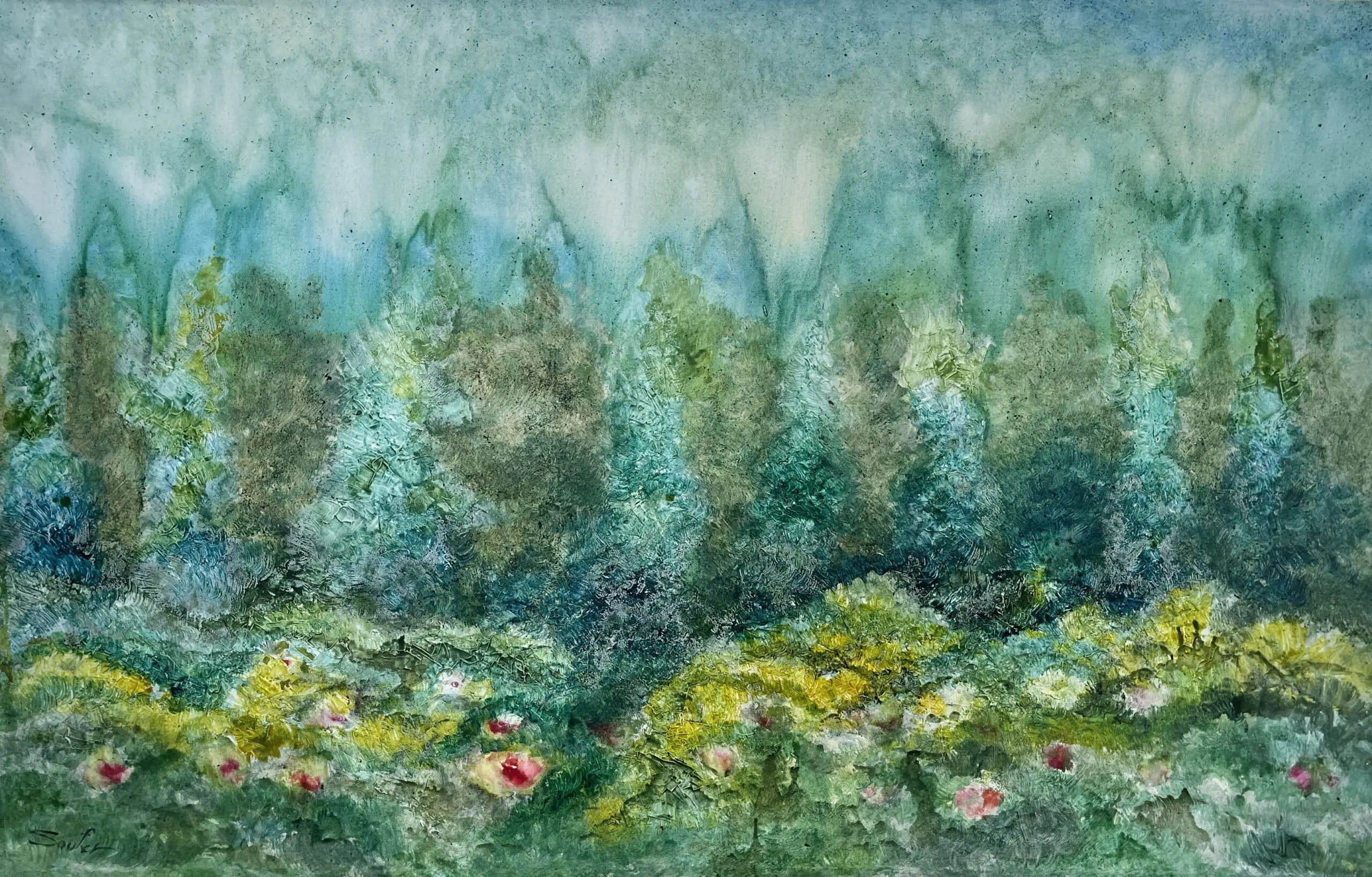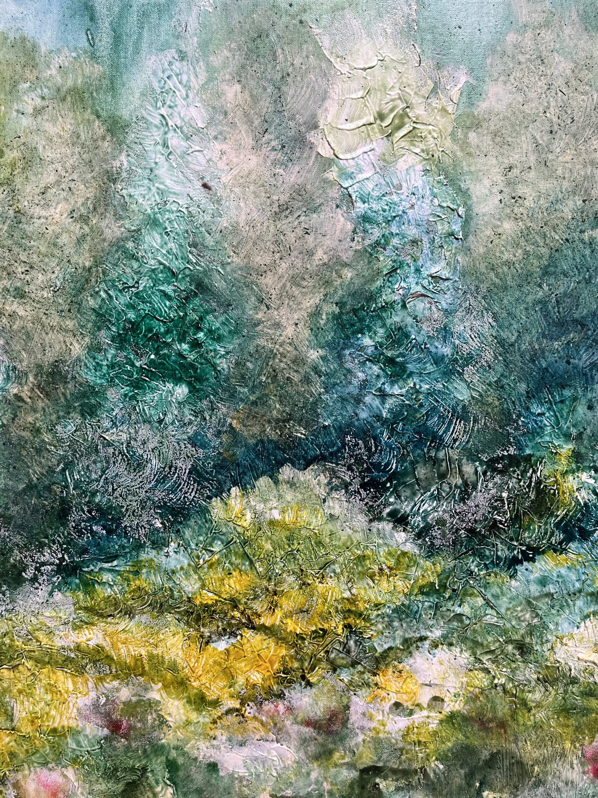 In the foreground, the artist employs more pronounced brushstrokes to depict trees and flowers. This technique creates a striking contrast between the softness of the background and the defined details in the foreground.