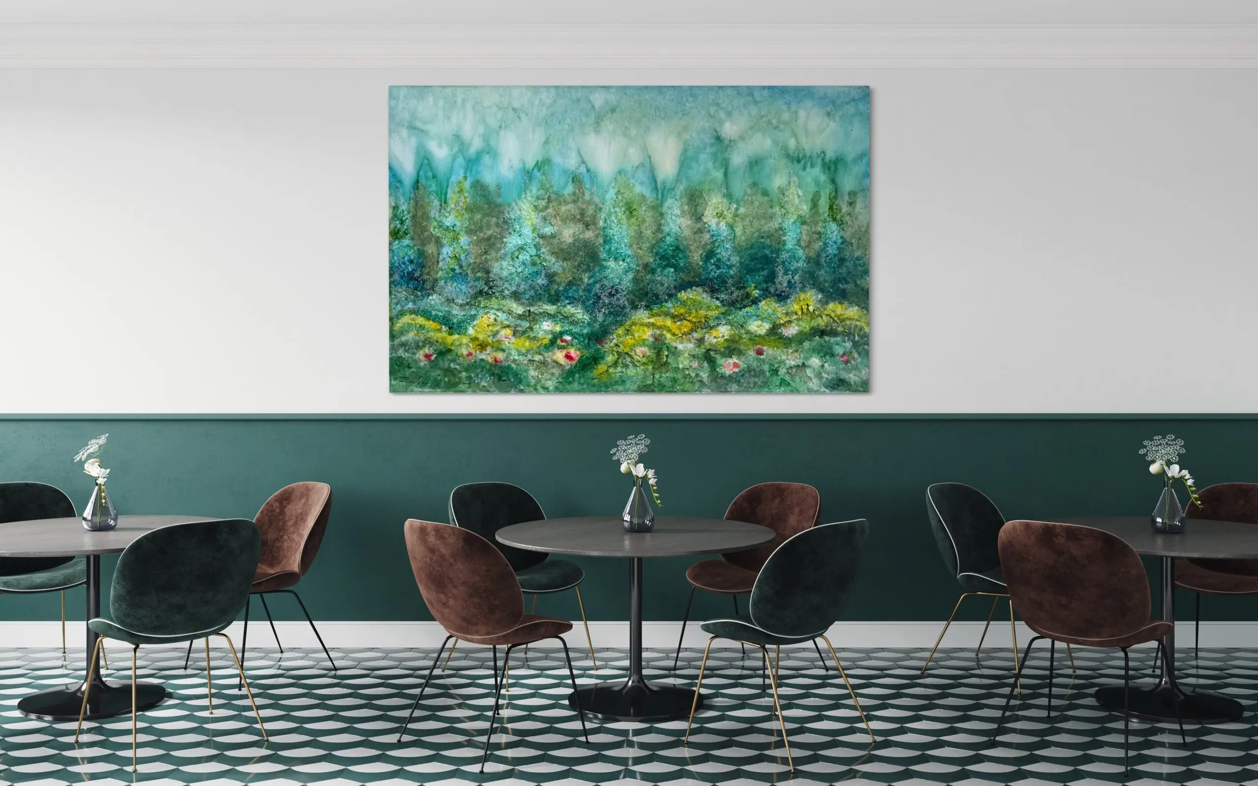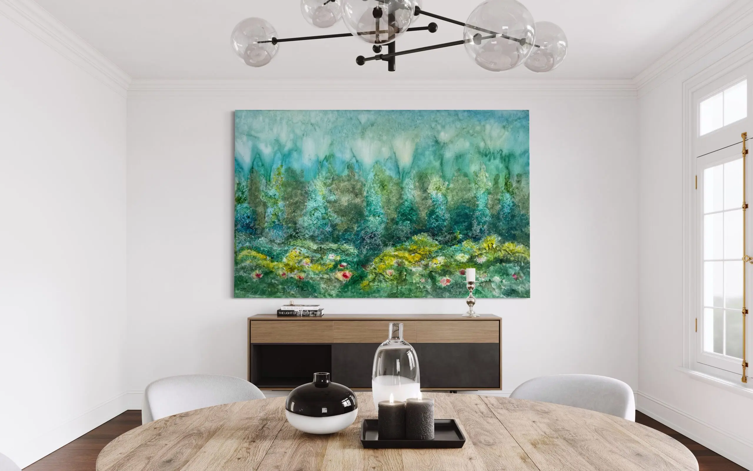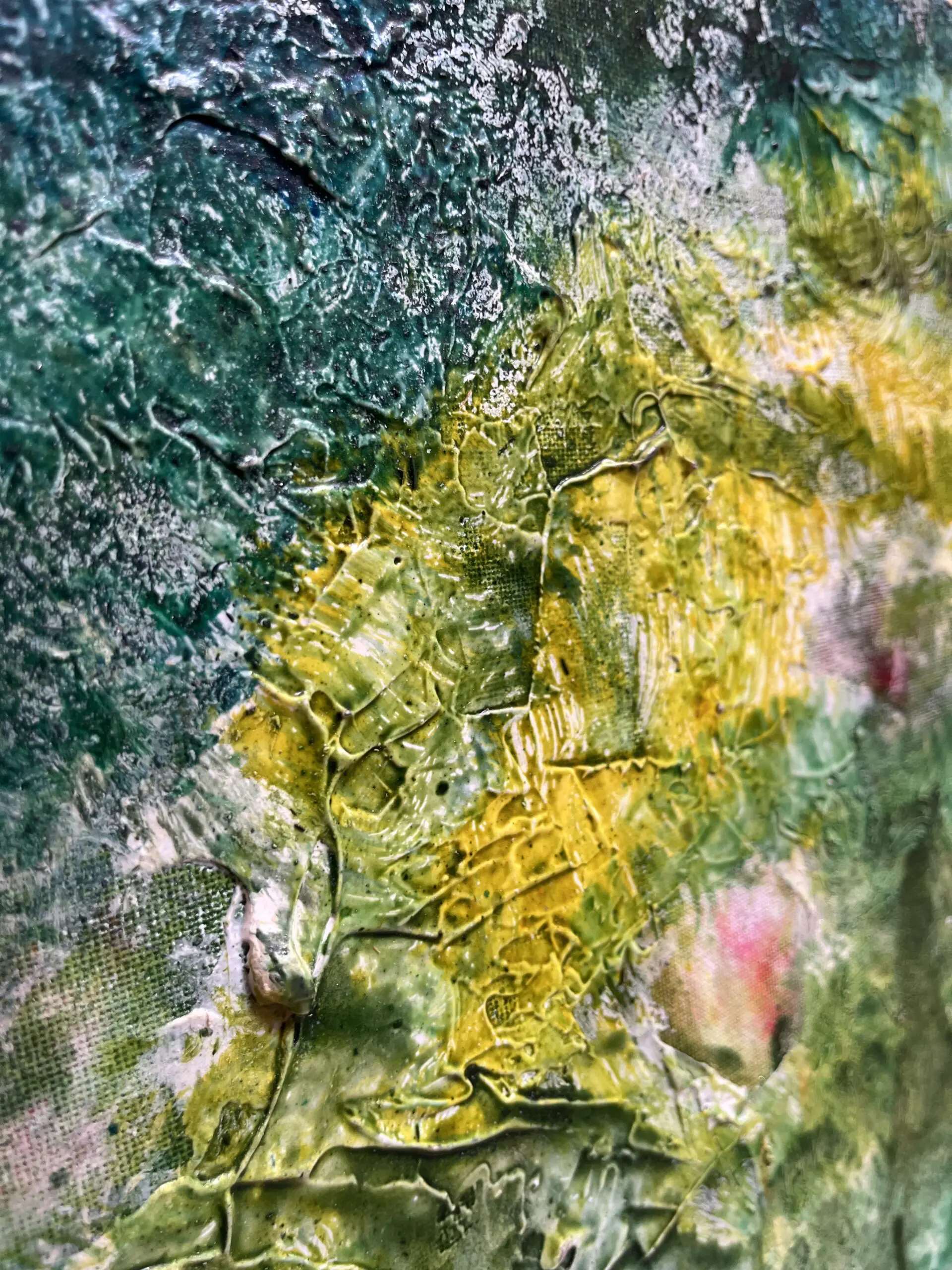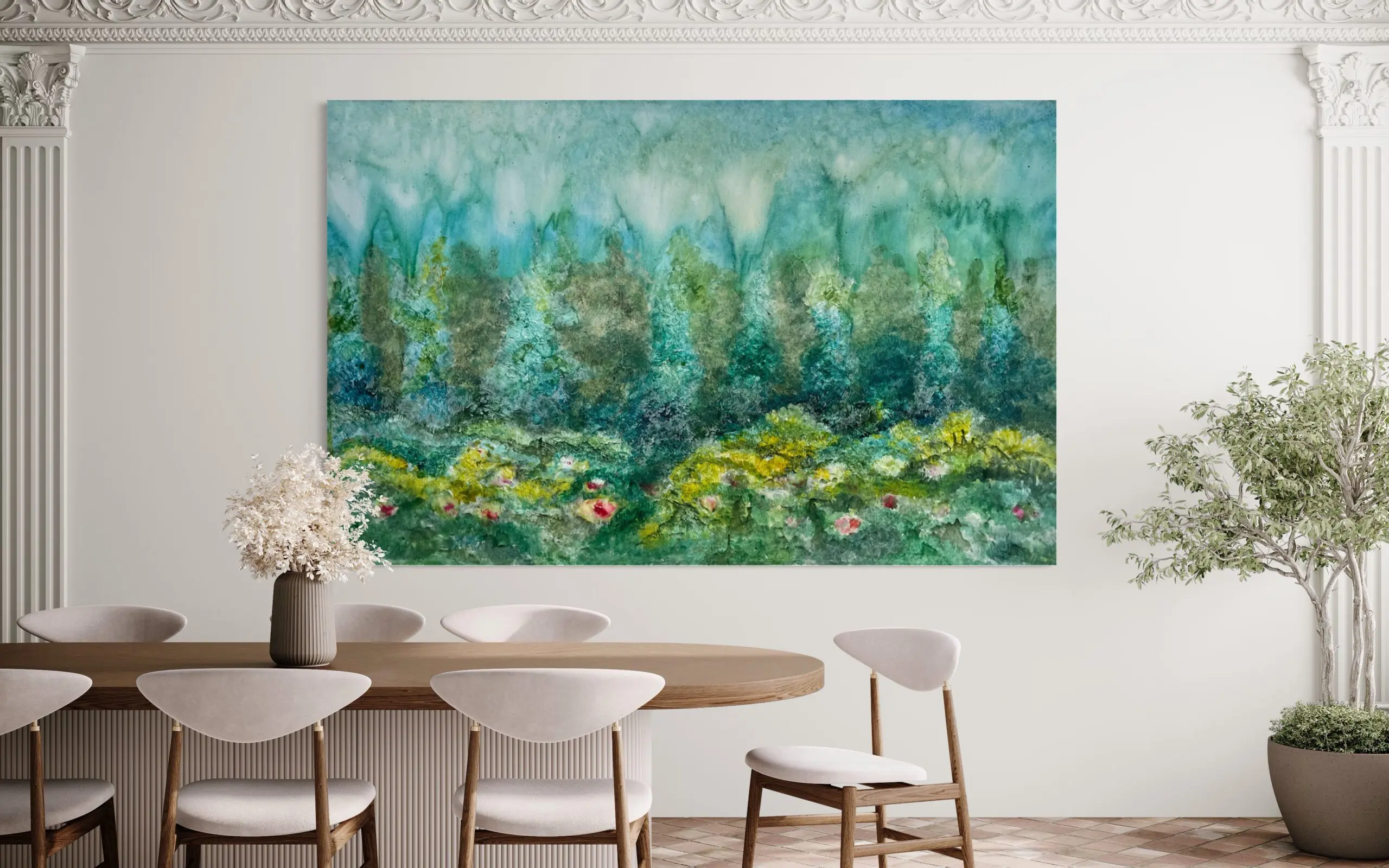 In the foreground, the artist employs more pronounced brushstrokes to depict trees and flowers. This technique creates a striking contrast between the softness of the background and the defined details in the foreground.