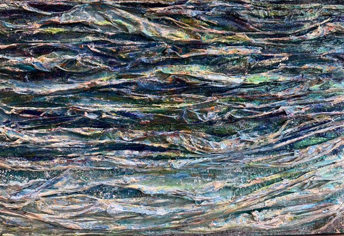 In “Rolling Surge”, Haleh Mashian captures the unrelenting force and hypnotic beauty of the sea, transforming the canvas into an electrifying display of movement, texture, and raw energy. The composition undulates with deep blues, iridescent greens, and shimmering silvers, pulsating with the fluid vitality of an ocean caught between turbulence and tranquility.