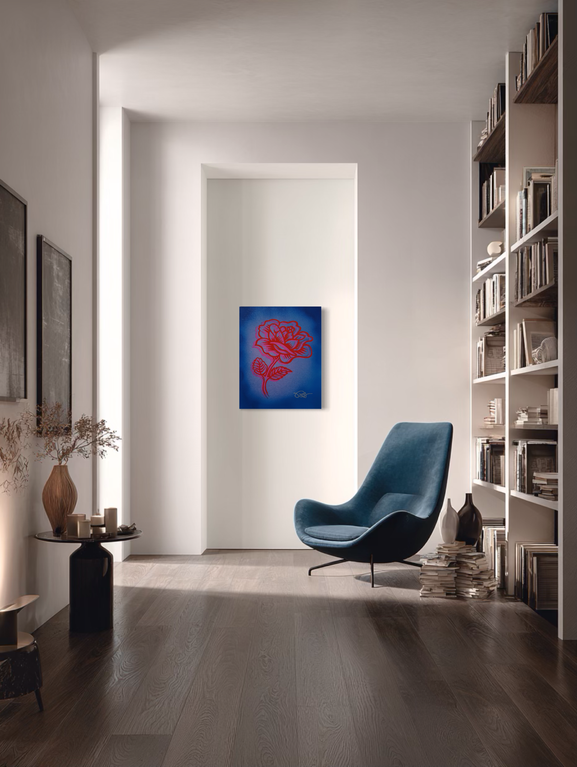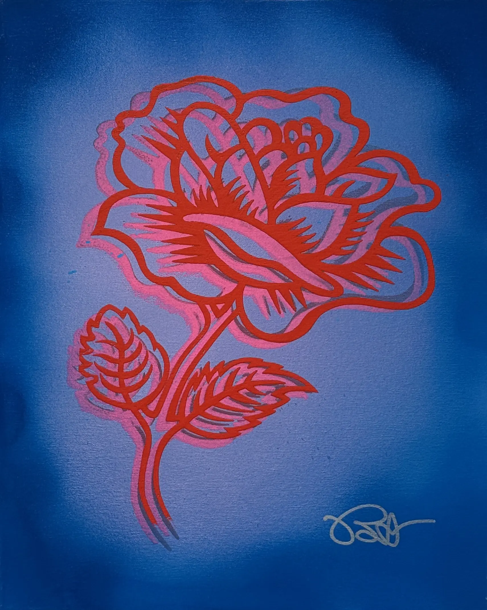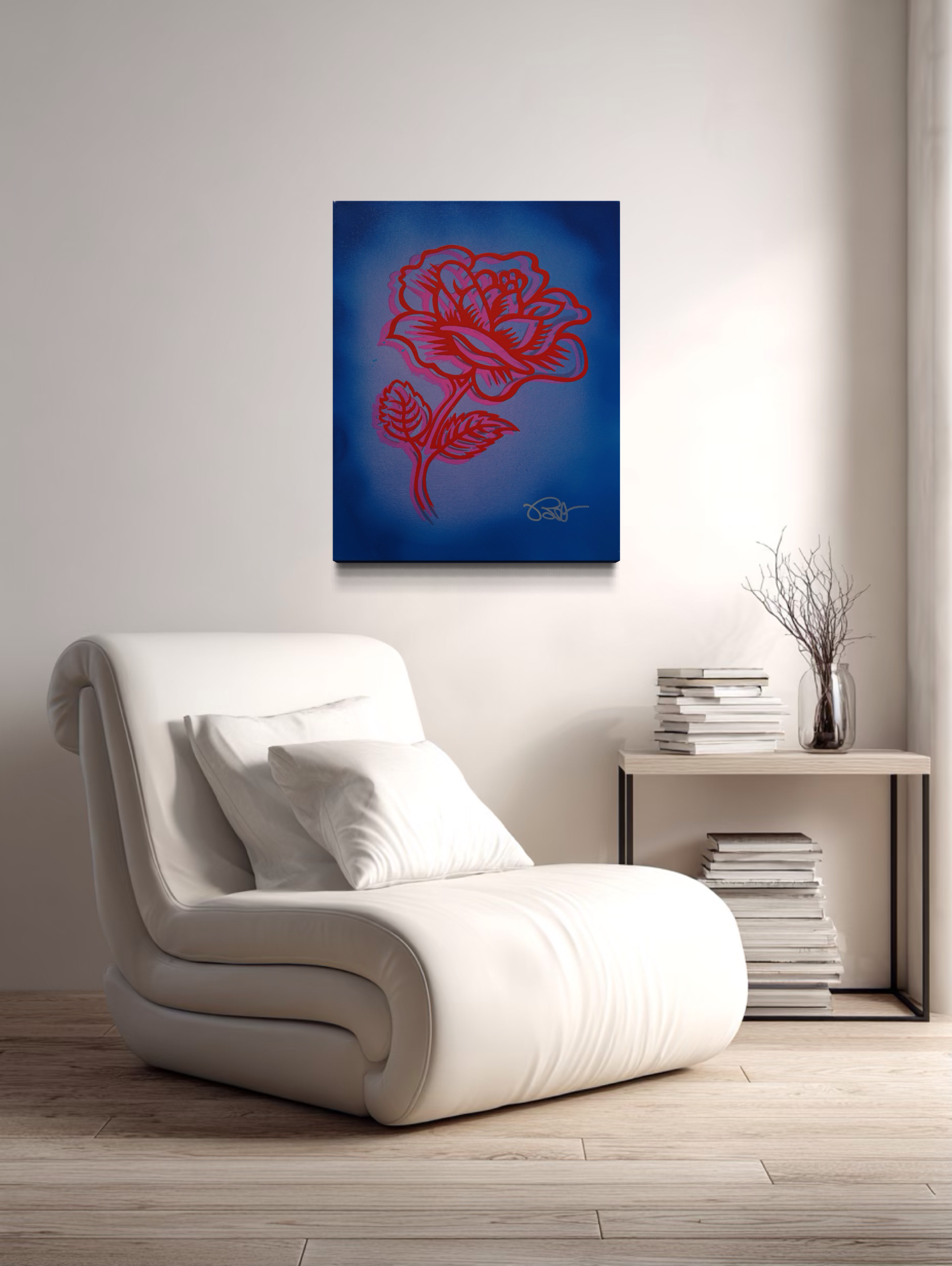 Rose Couture II is also featured in Icons in Bloom at MASH Gallery. The work introduces a luminous atmospheric field that surrounds the rose in layered red and violet gradients. Unlike Morris’ earlier flat and sharply contained pop compositions, this work integrates spray paint transitions that soften the boundary between figure and ground. The rose appears to radiate outward, shifting from static emblem to glowing presence.