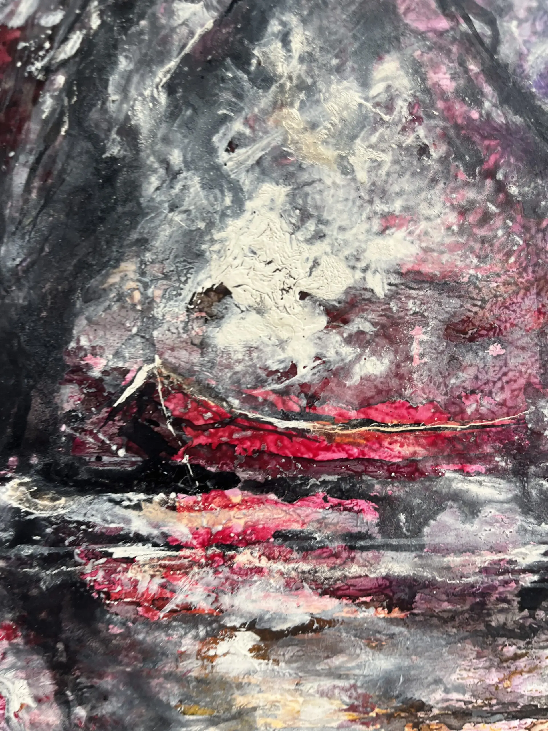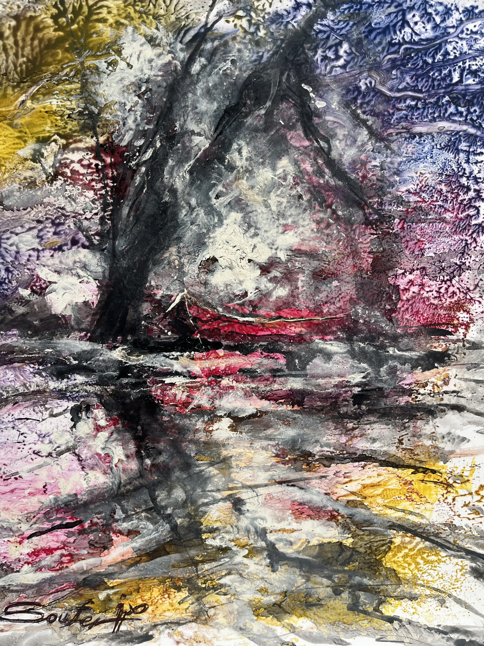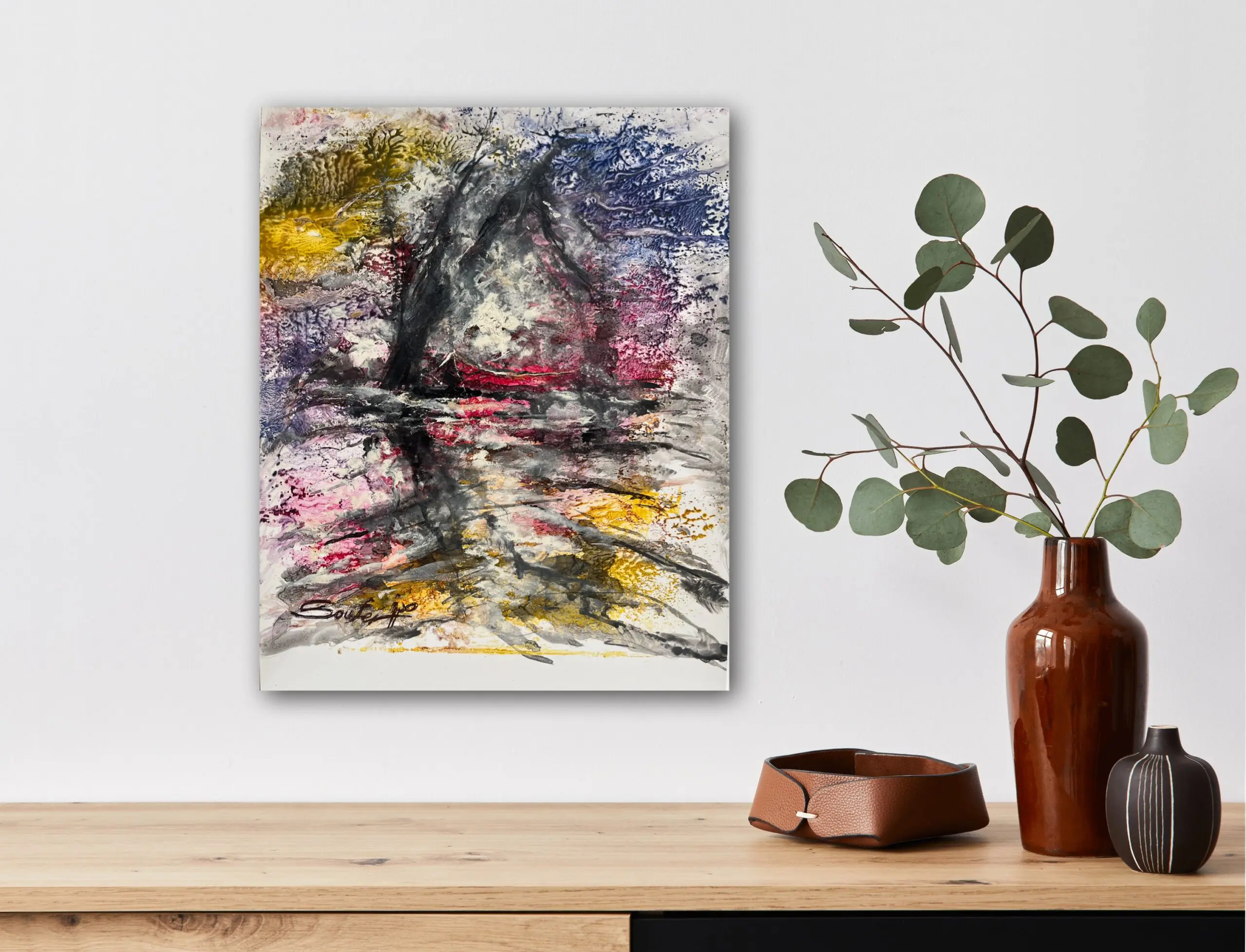 In this dreamy monoprint painting, a vibrant red canoe rests snugly between two majestic trees. The artist skillfully captures the essence of serenity and exploration in this scene. The background and foreground are beautifully rendered with a nebulous quality, creating an ethereal atmosphere that adds an element of mystery and intrigue. The soft and hazy brushstrokes in the background perfectly complement the vividness of the red canoe, drawing attention to its presence as a focal point. As viewers gaze upon this artwork, they are transported to a tranquil and dreamlike setting, where they can imagine themselves embarking on a peaceful journey, surrounded by the beauty of nature.