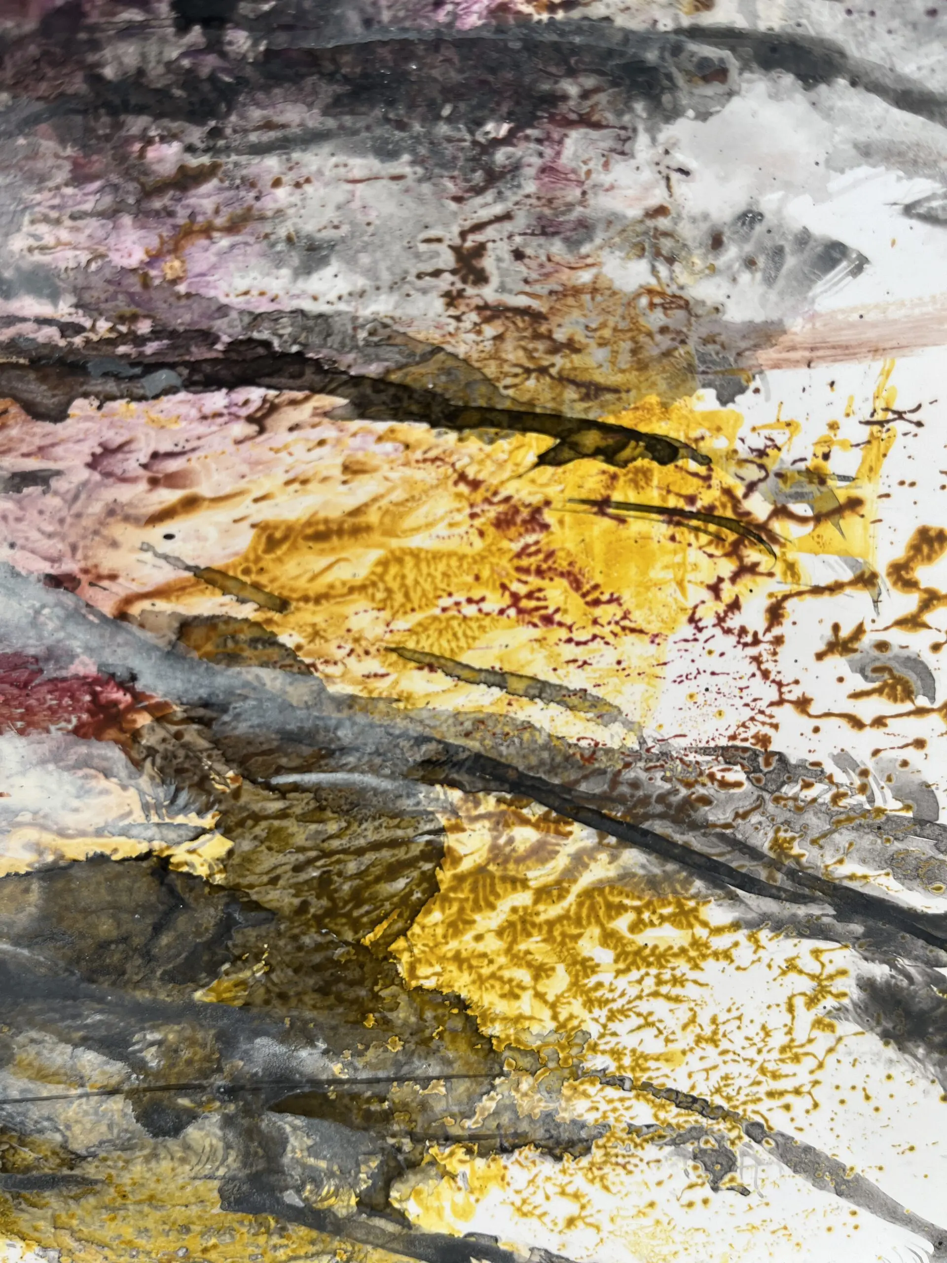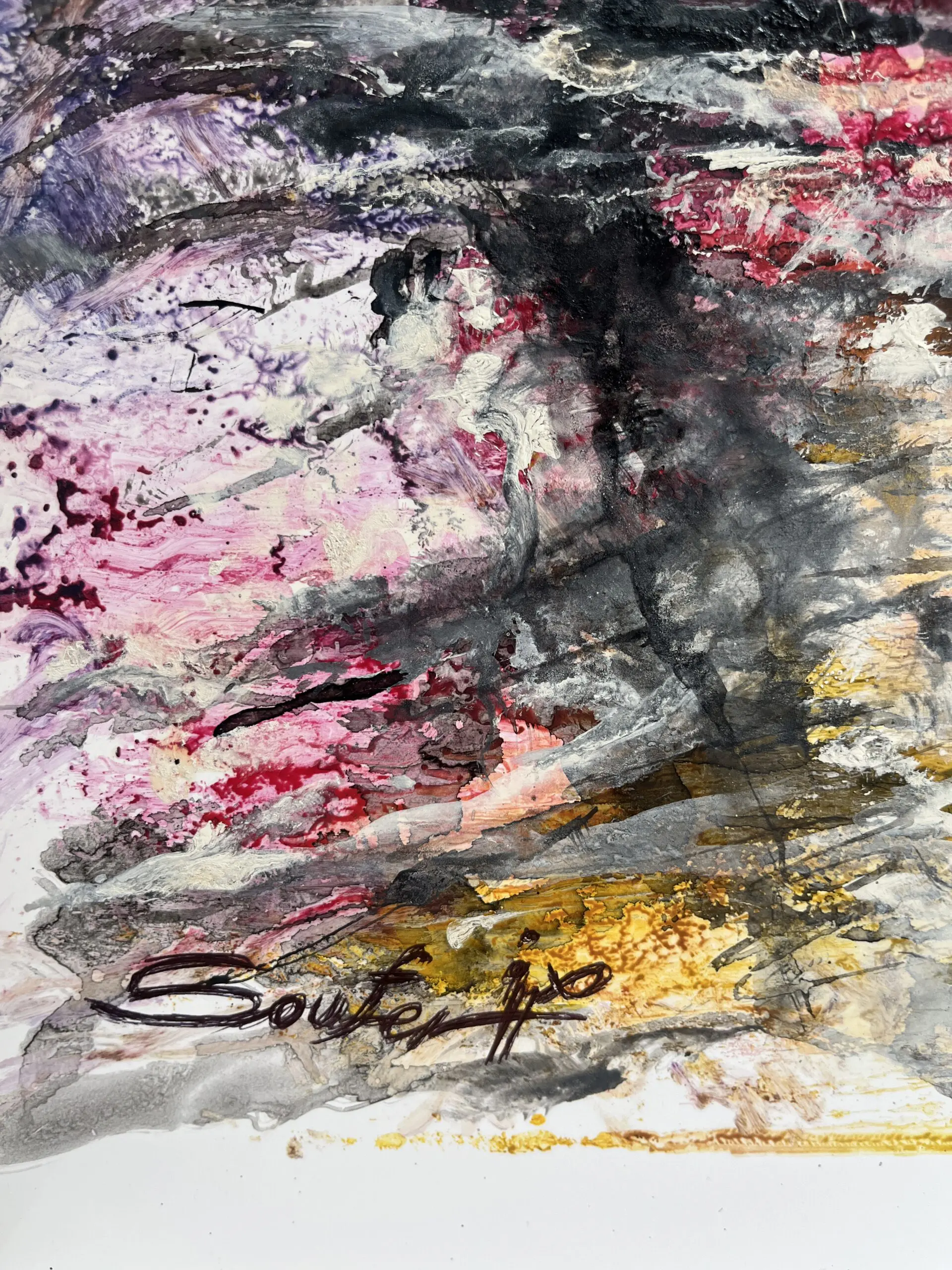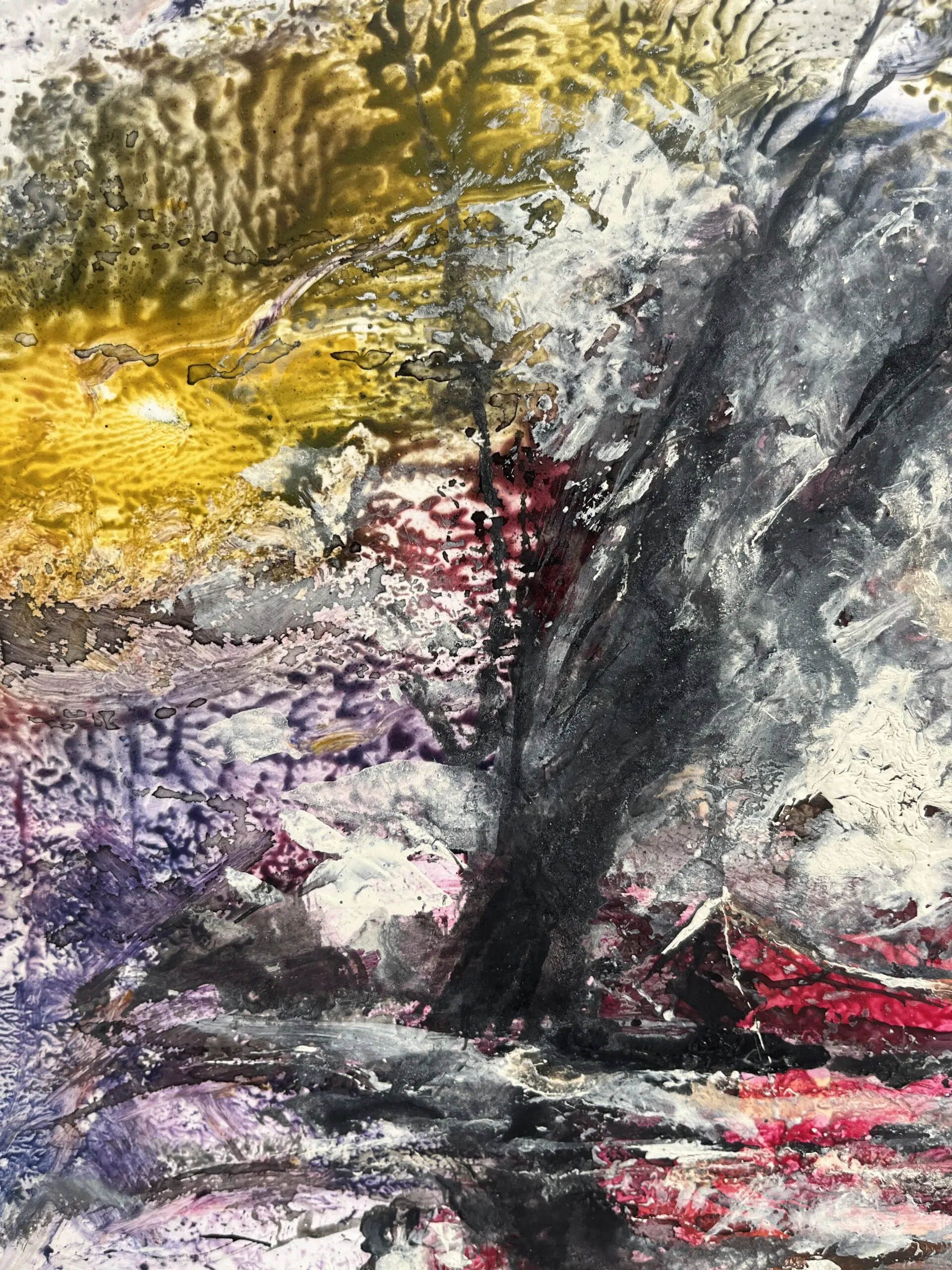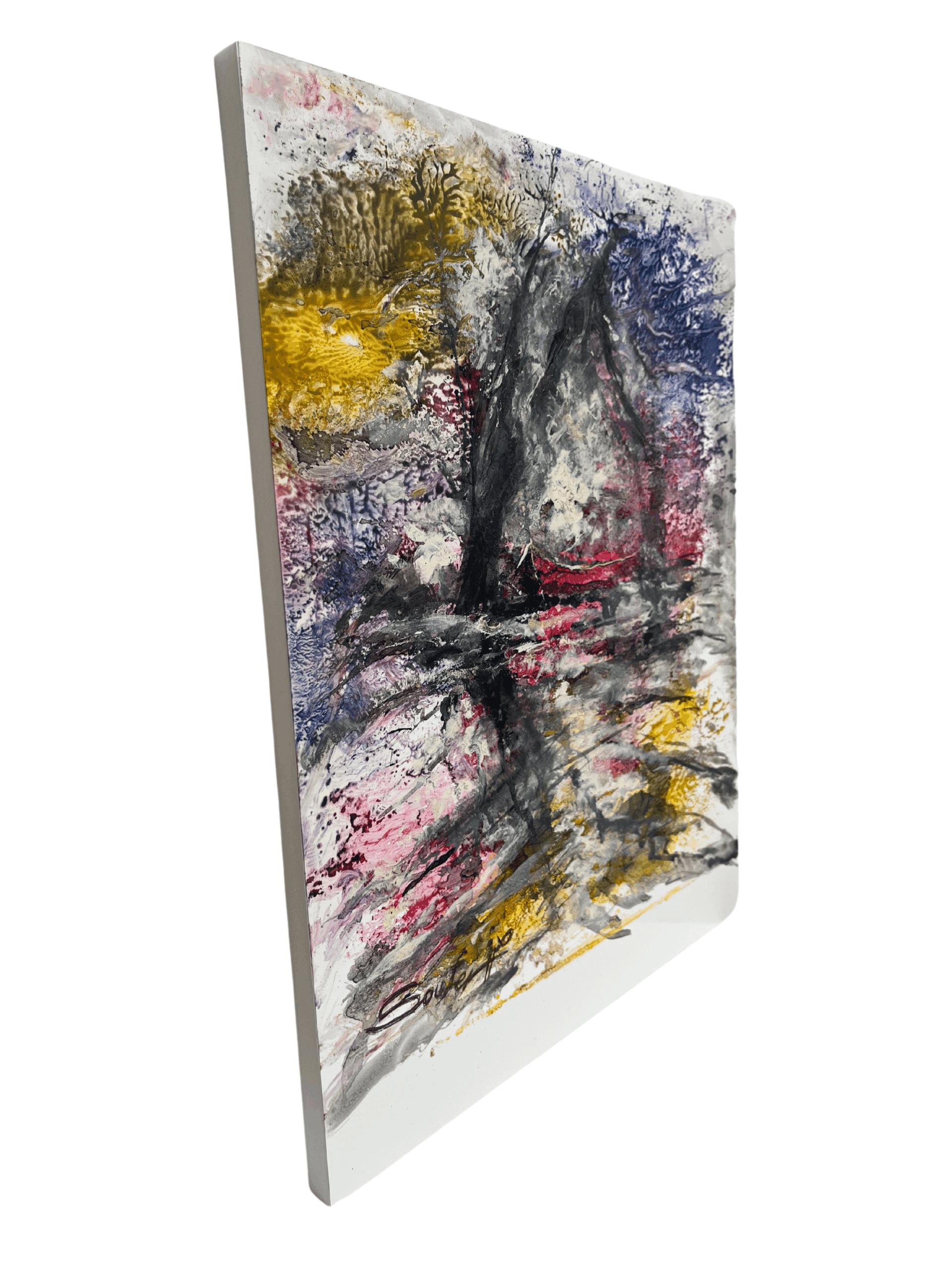 In this dreamy monoprint painting, a vibrant red canoe rests snugly between two majestic trees. The artist skillfully captures the essence of serenity and exploration in this scene. The background and foreground are beautifully rendered with a nebulous quality, creating an ethereal atmosphere that adds an element of mystery and intrigue. The soft and hazy brushstrokes in the background perfectly complement the vividness of the red canoe, drawing attention to its presence as a focal point. As viewers gaze upon this artwork, they are transported to a tranquil and dreamlike setting, where they can imagine themselves embarking on a peaceful journey, surrounded by the beauty of nature.