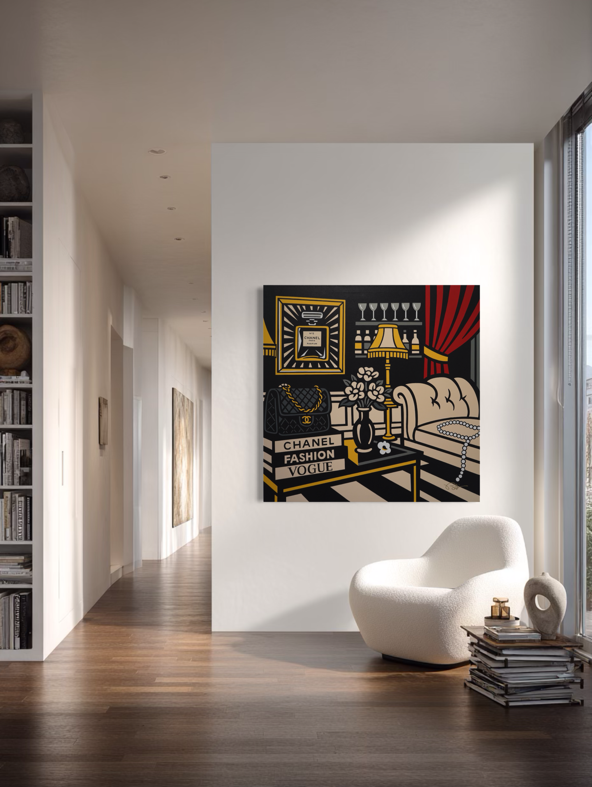 Salon de Coco reflects Burton Morris’ earlier exploration of contemporary consumer iconography and forms part of the artist’s broader visual dialogue with luxury culture. The composition constructs a stylized interior tableau where symbols associated with fashion and elegance, such as the Chanel No. 5 perfume bottle, designer handbag, pearls, and fashion publications, are assembled into a carefully orchestrated domestic scene.