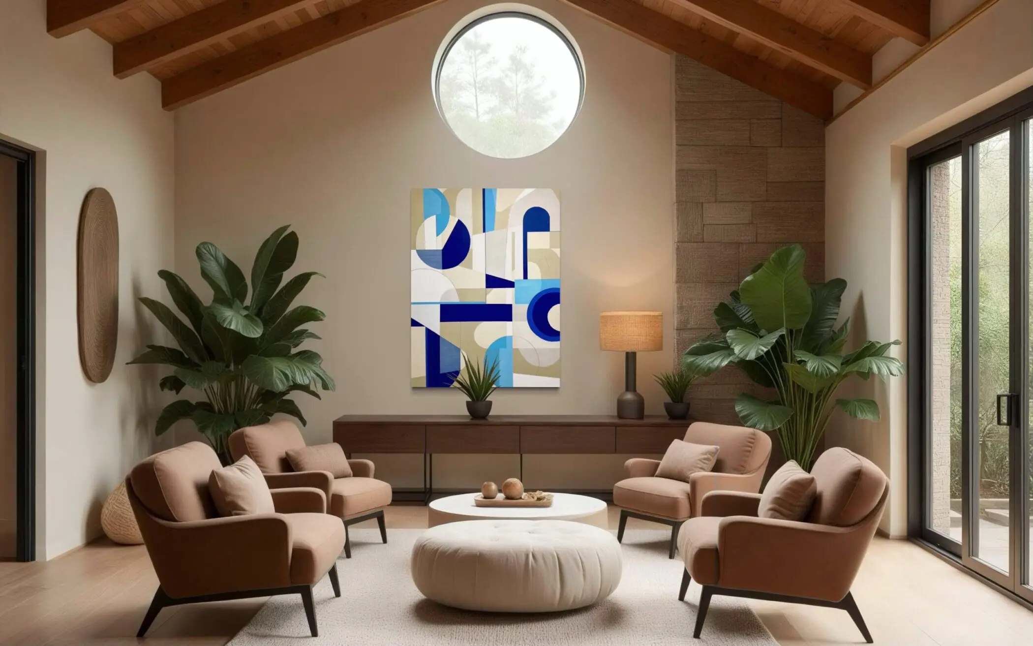 In Saved by Zero, crisp geometry and muted elegance converge to create a composition that feels both grounded and expansive. Cool blues, deep navy, ivory, and soft neutrals intersect across the surface, forming a rhythmic dialogue between line, shape, and negative space. Arcs, circles, and rectilinear forms shift and layer, creating a sense of quiet movement and balance.
