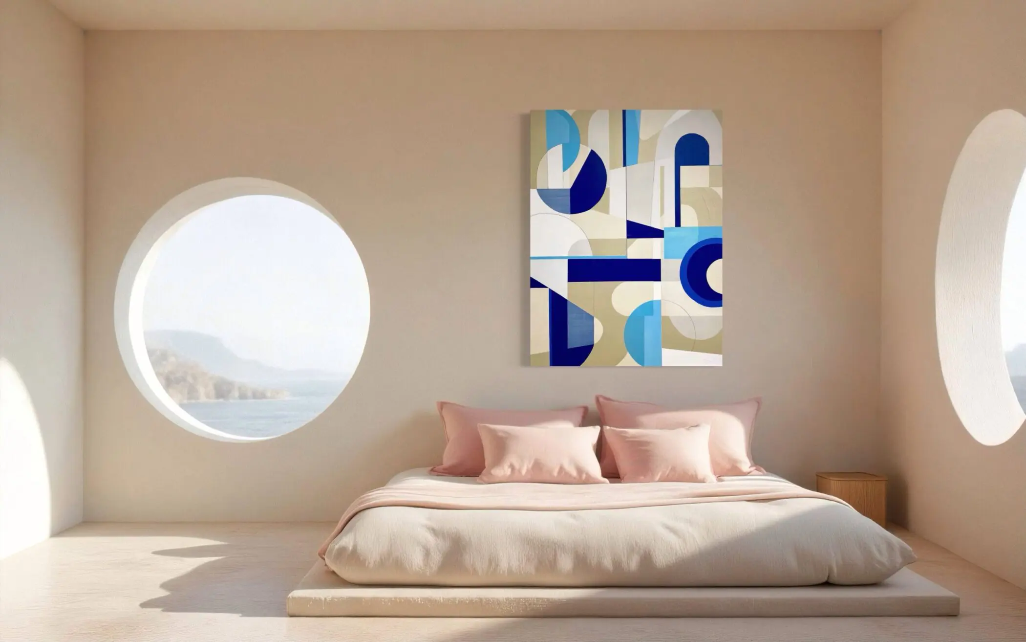 Rooted in the lineage of Bauhaus, minimalism, and modernist abstraction, Saved by Zero invites contemplation of structure, space, and visual harmony. It is an ideal work for collectors drawn to contemporary geometric painting, modernist principles, and the understated power of pure form.
