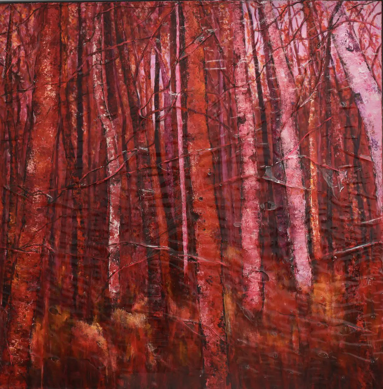The vertical lines of the trunks establish a strong sense of structure, yet the soft blending of reds and oranges in the undergrowth creates a feeling of fluidity. The delicate tracery of bare branches weaves through the upper portion of the painting, adding contrast against the saturated backdrop. The use of texture gives the piece a tactile presence, as if the layers of pigment echo the organic surfaces of bark and foliage.