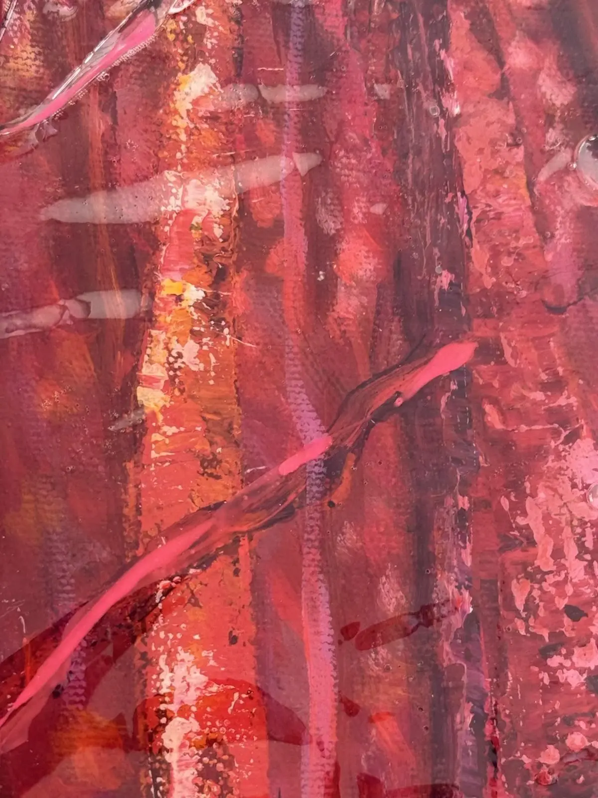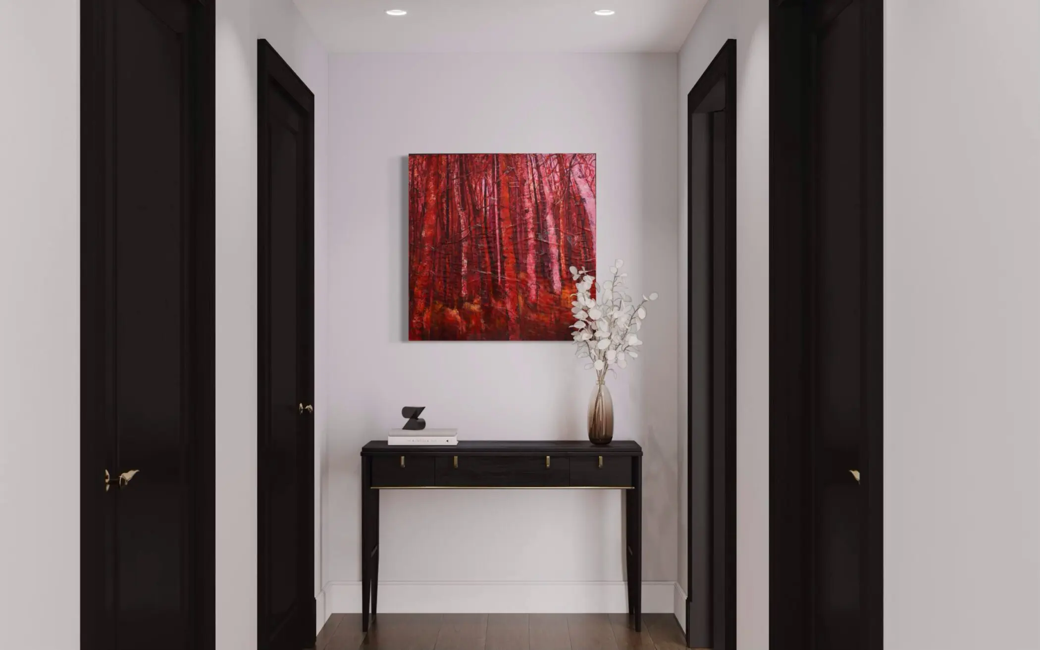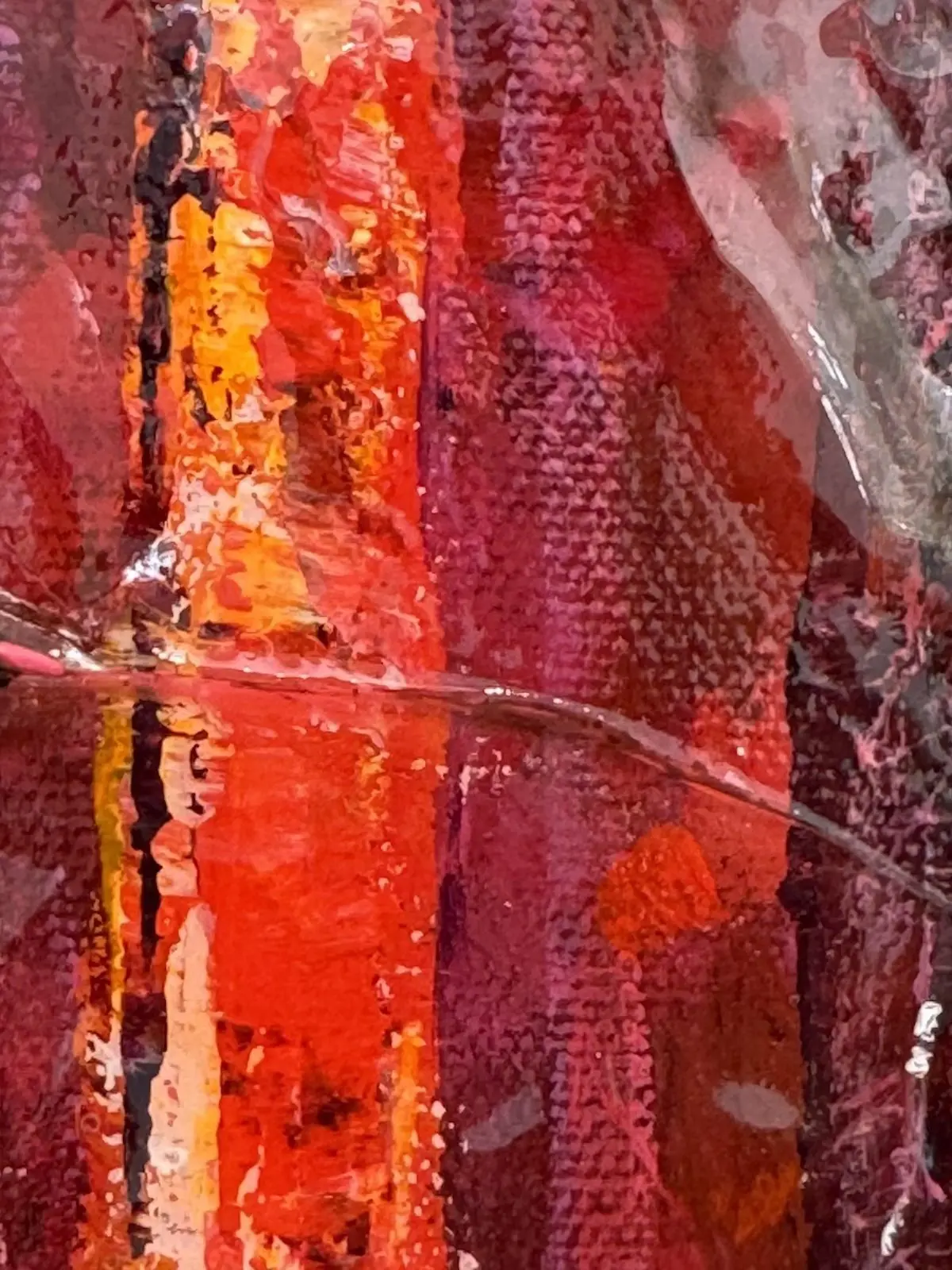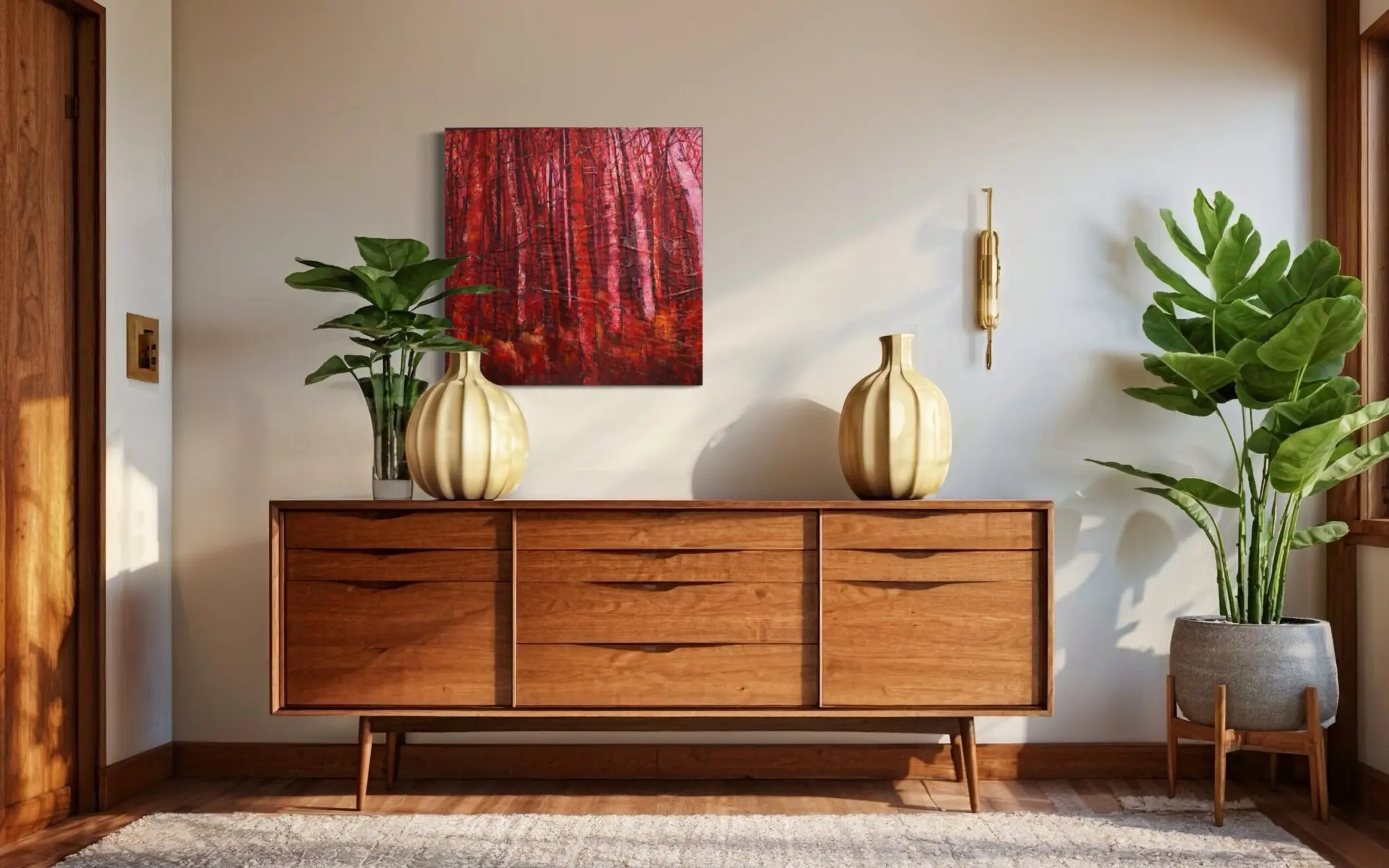 “Scarlet Serenade” brings an emotive quality to the forest, where color dictates mood and atmosphere. The depth of color and texture in “Scarlet Serenade” makes it a visually engaging addition to any space, capturing the beauty and energy of the natural world through an expressive, layered approach, making it an ideal statement piece for interior designers and art collectors.