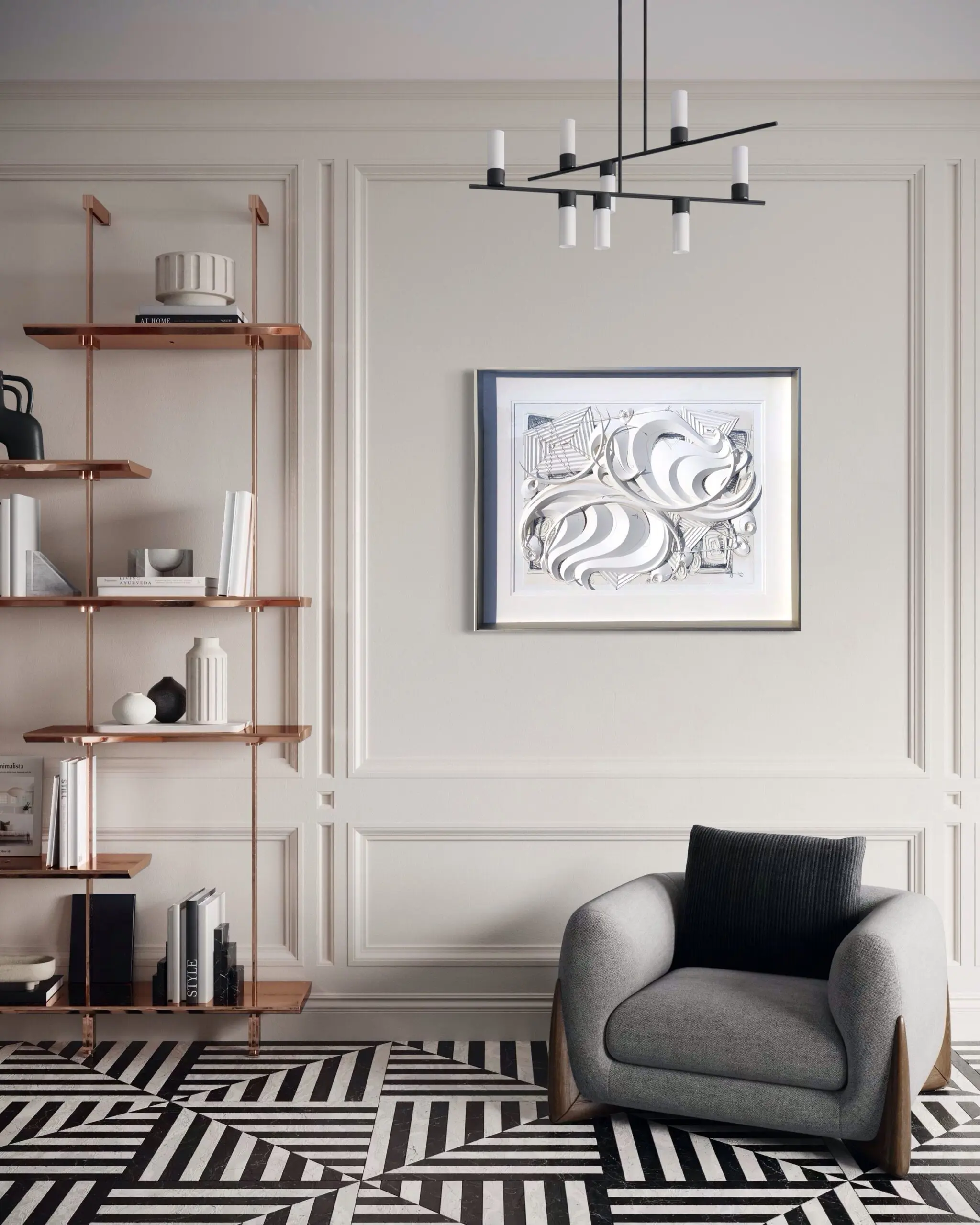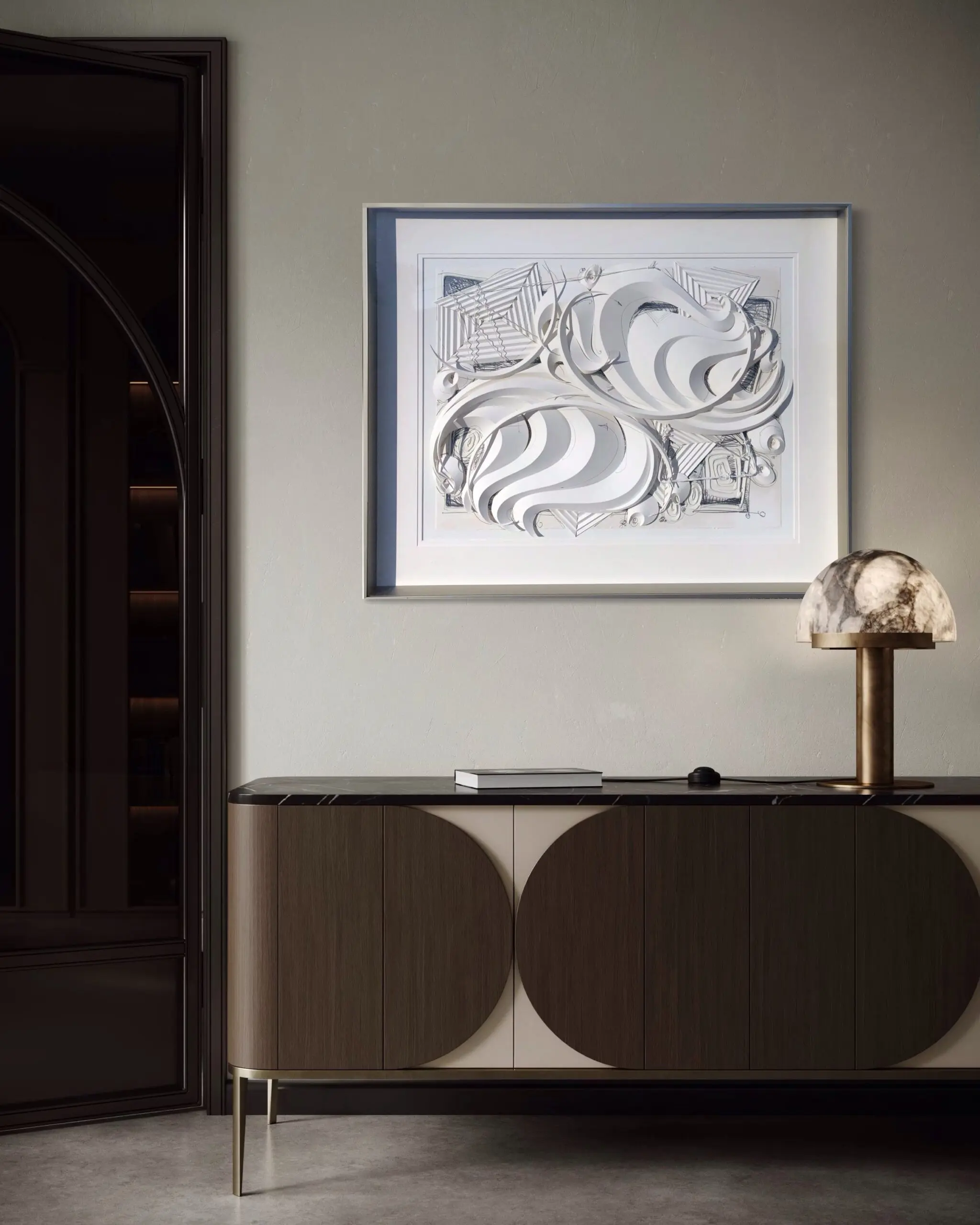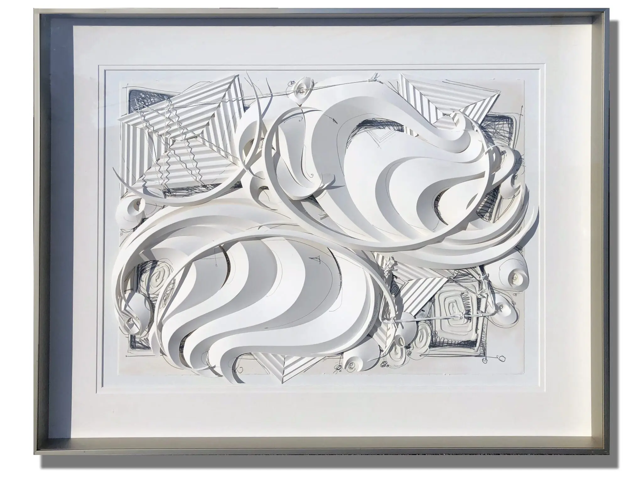 In Seeds of Change 128, Salvatore Matteo continues his exploration of balance, perception, and collective consciousness through intricately layered paper relief. Cut, curled, and suspended from a precisely drawn foundation, the pure-white paper forms unfold in sweeping arcs and measured spirals, hovering between drawing, sculpture, and architectural model. Light activates the work, casting soft shadows that animate the surface and extend the composition into surrounding space, allowing the piece to evolve throughout the day.