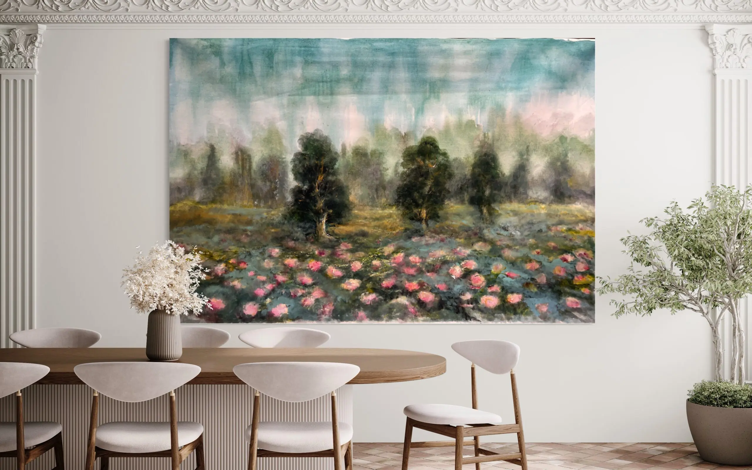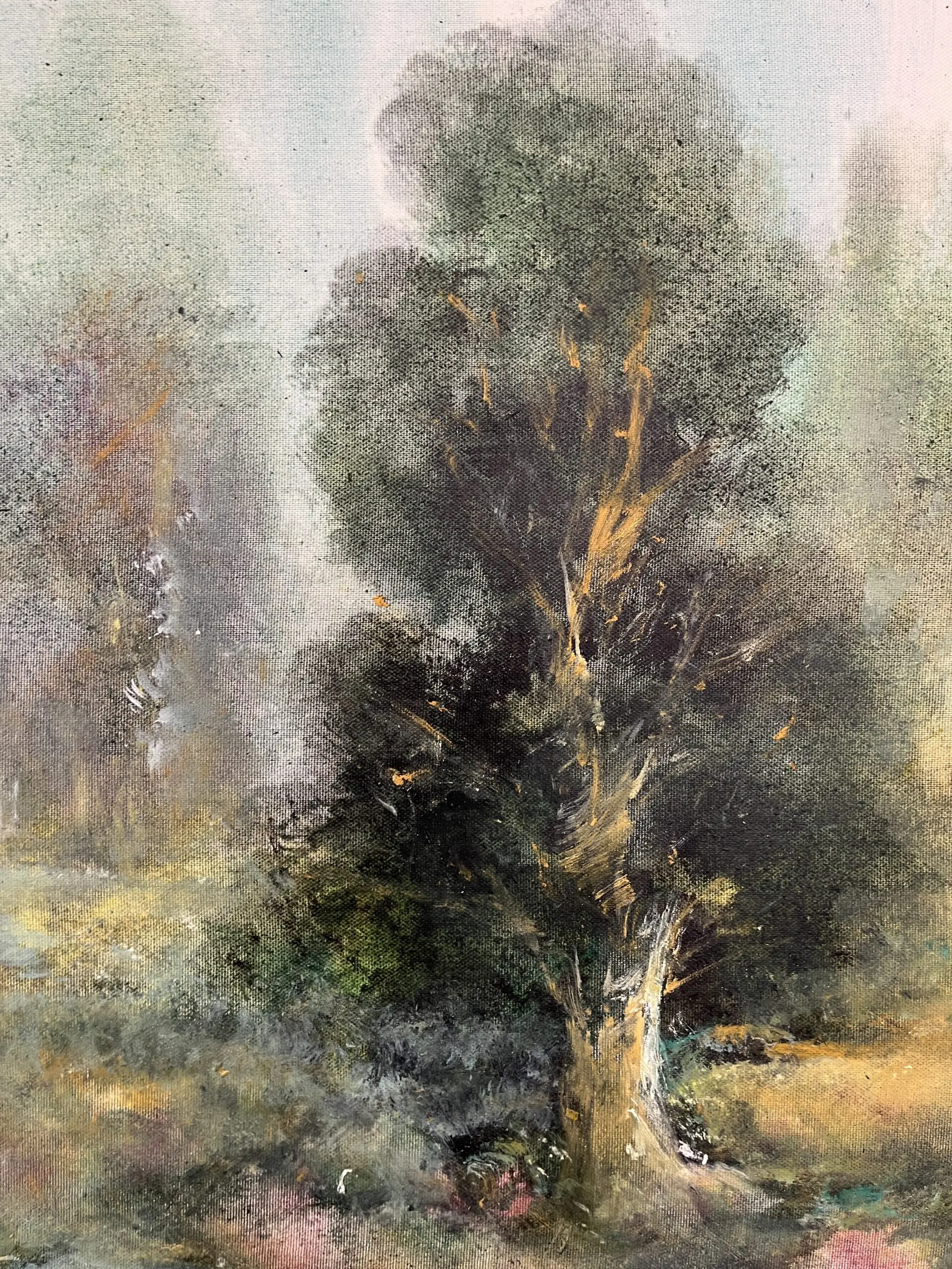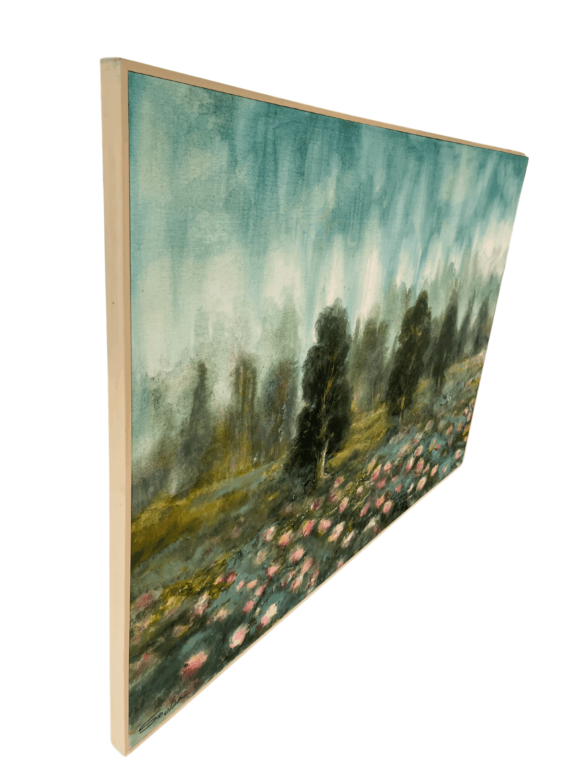 The landscape piece is a stunning representation of a serene and romantic setting, created in a unique impressionistic style. The artist has masterfully captured the essence of nature, infusing the artwork with a delicate and dreamlike quality.
