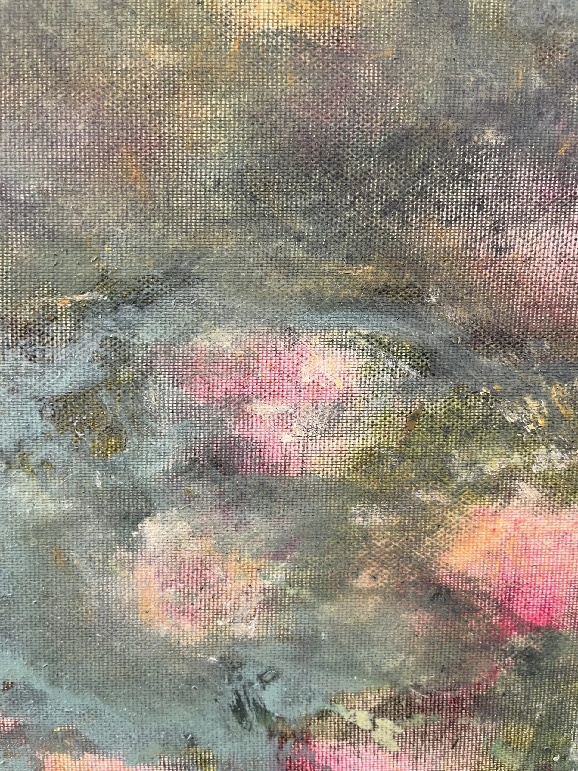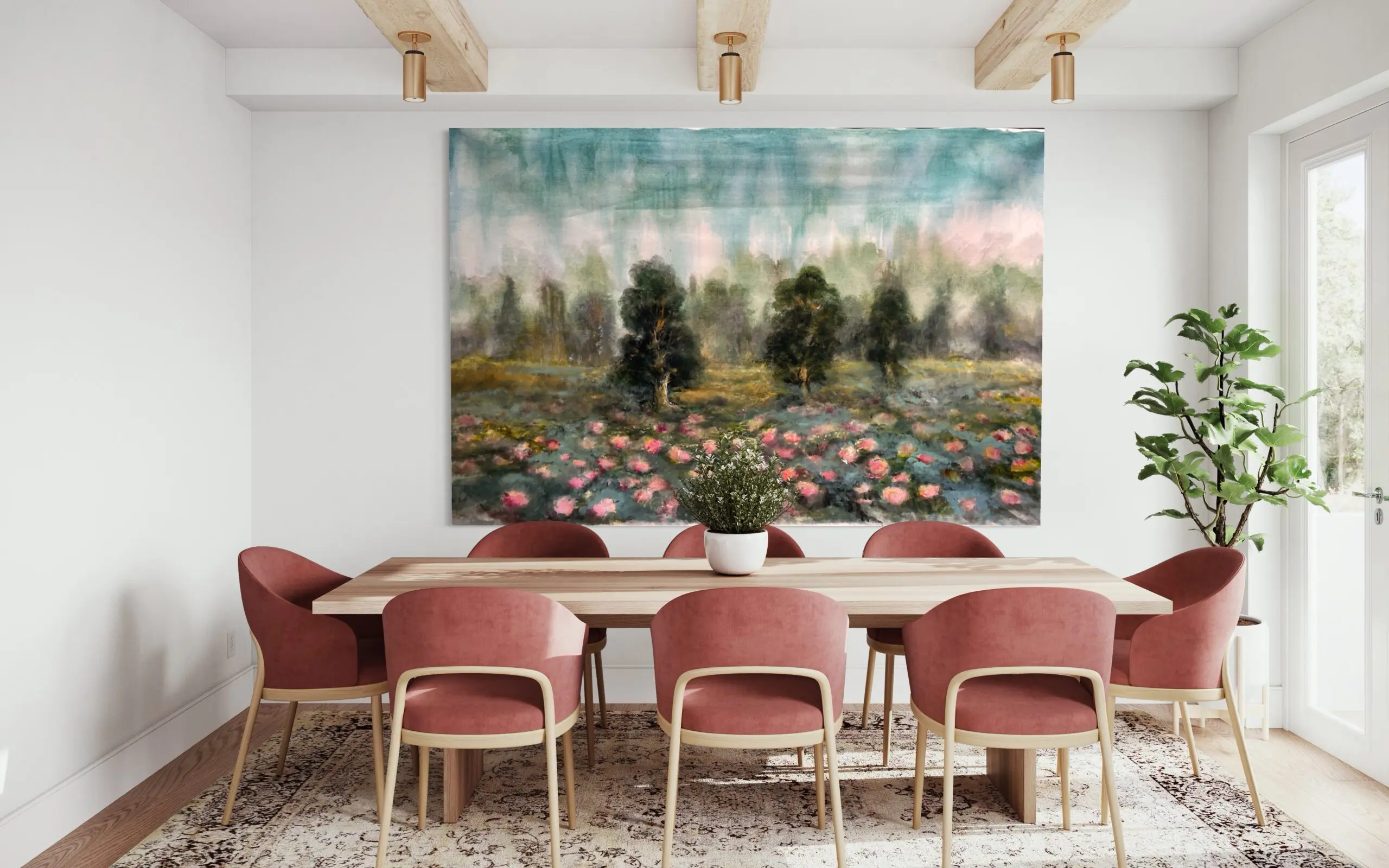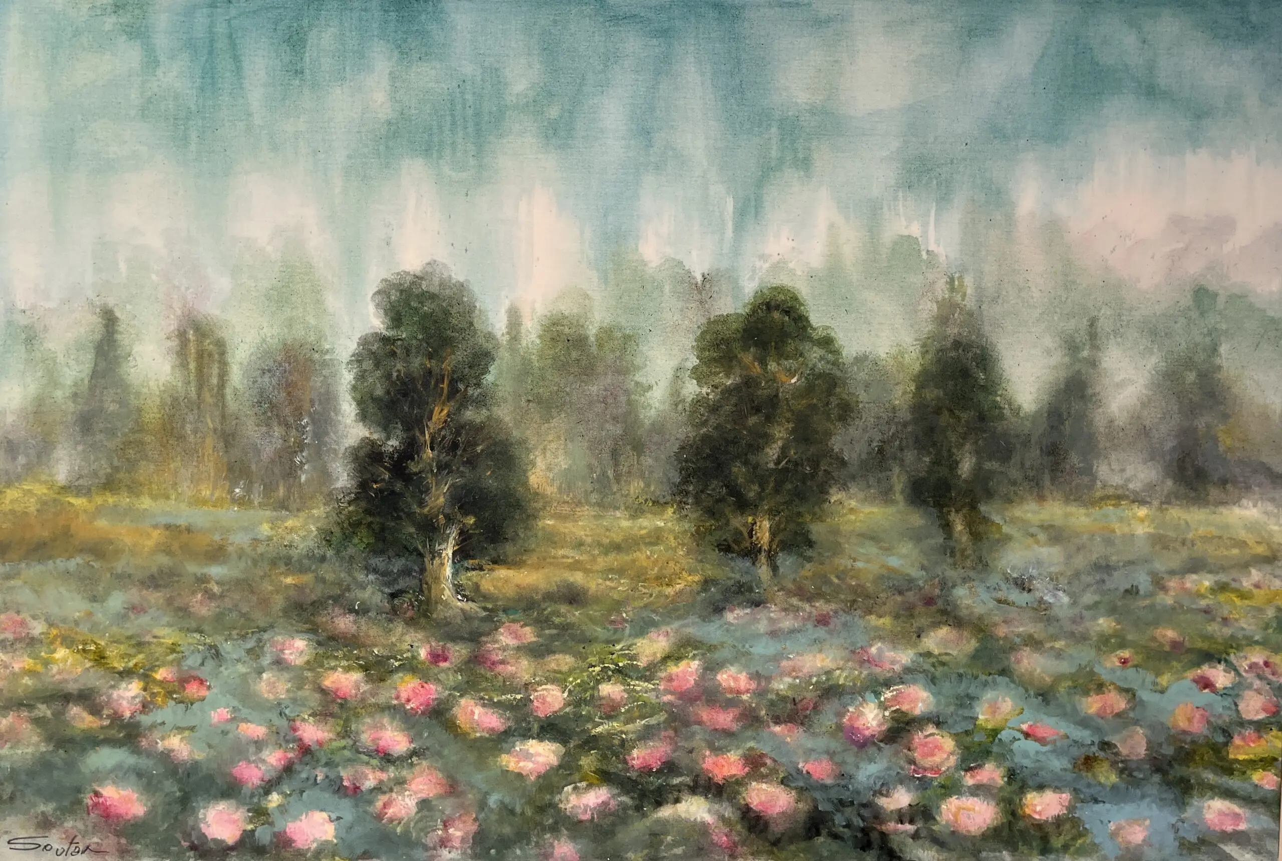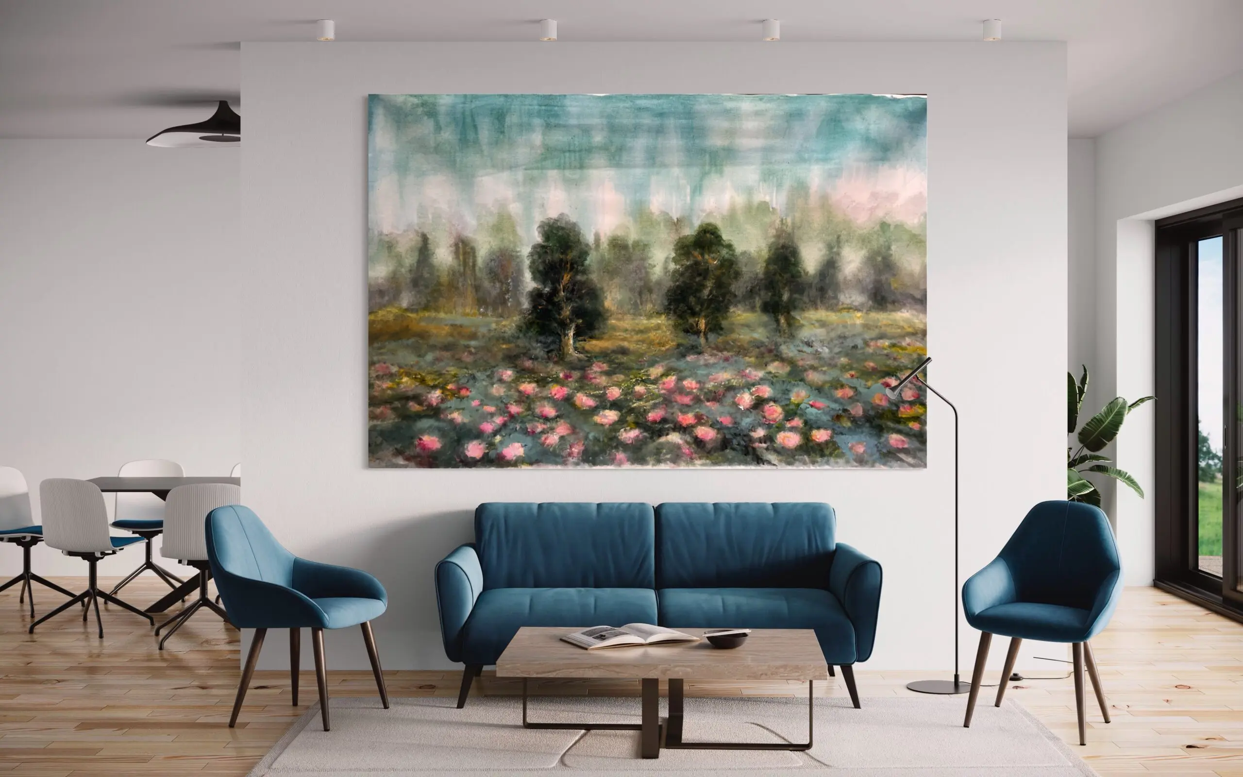The landscape piece is a stunning representation of a serene and romantic setting, created in a unique impressionistic style. The artist has masterfully captured the essence of nature, infusing the artwork with a delicate and dreamlike quality.
