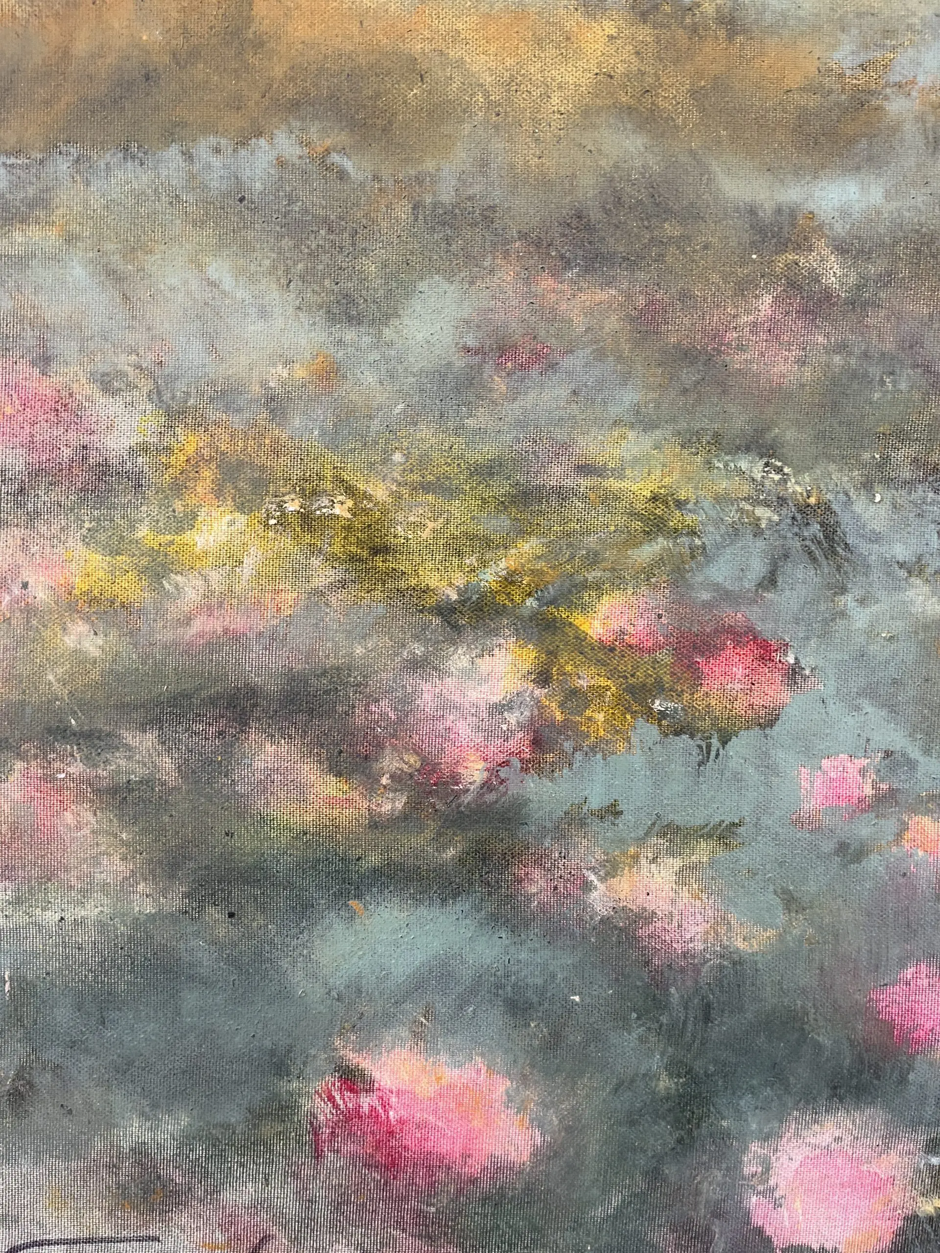 In the foreground, floating flowers take center stage, their ethereal presence adding a touch of enchantment to the composition. The artist has employed a soft and light color palette, with tones of pink, blue, and green, to depict these delicate blossoms. The flowers seem to dance gracefully, creating a sense of weightlessness and whimsy.