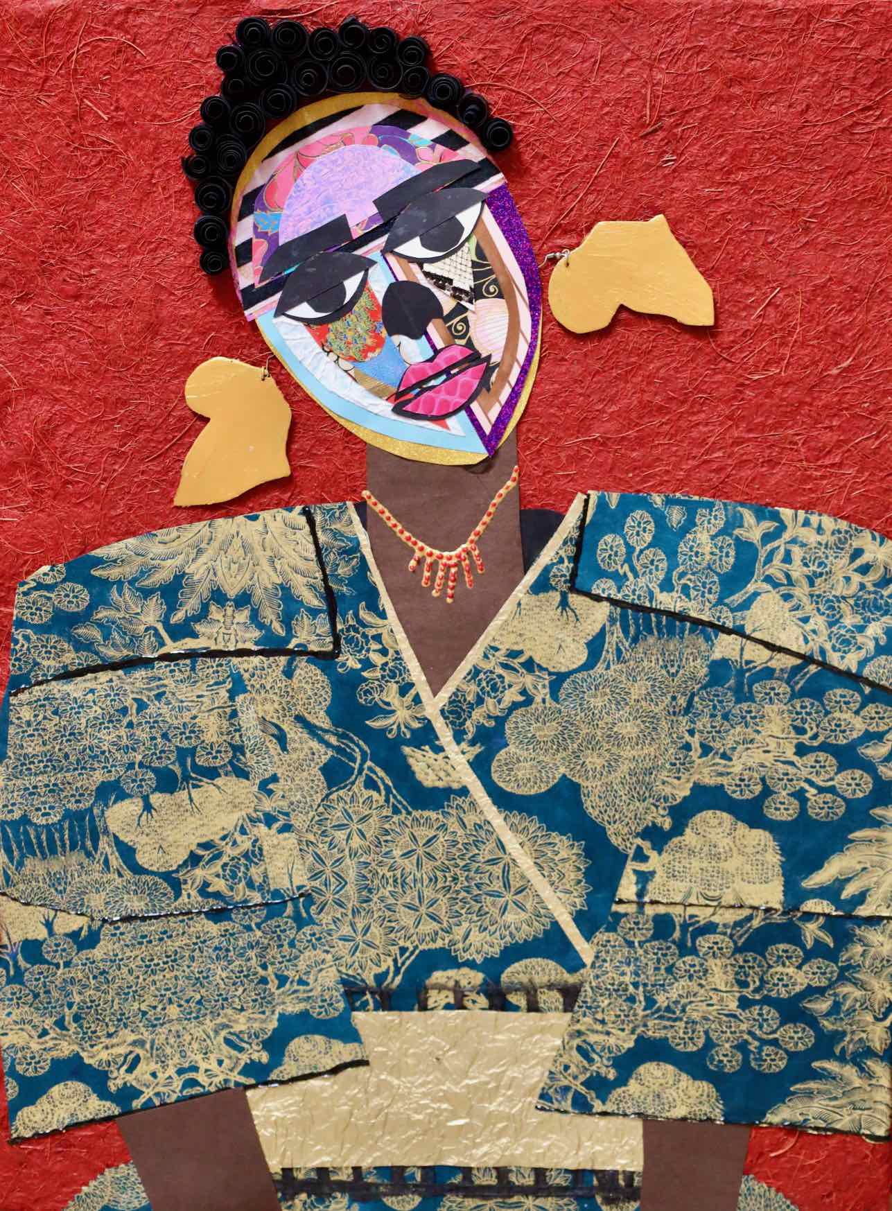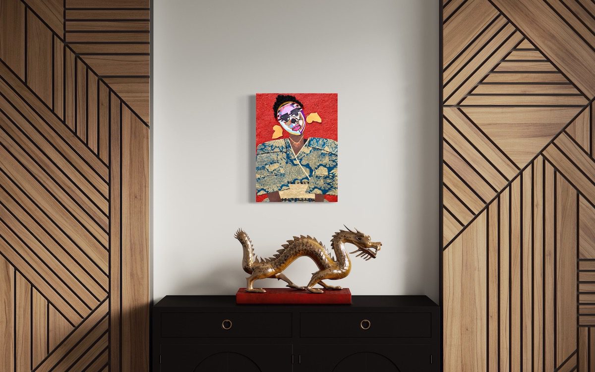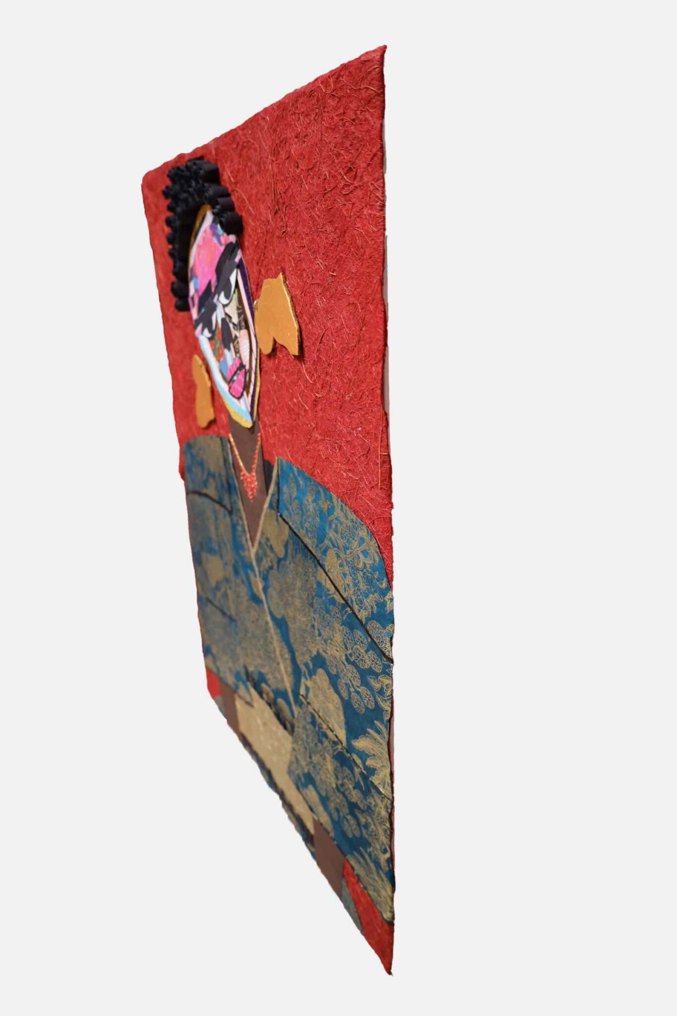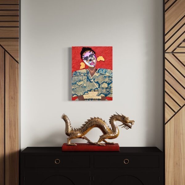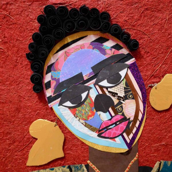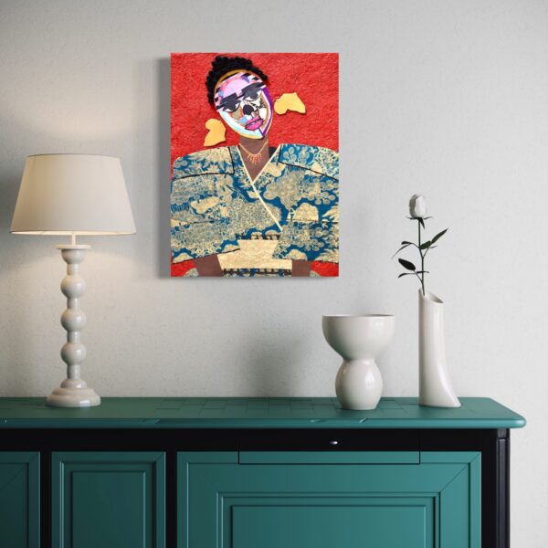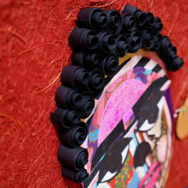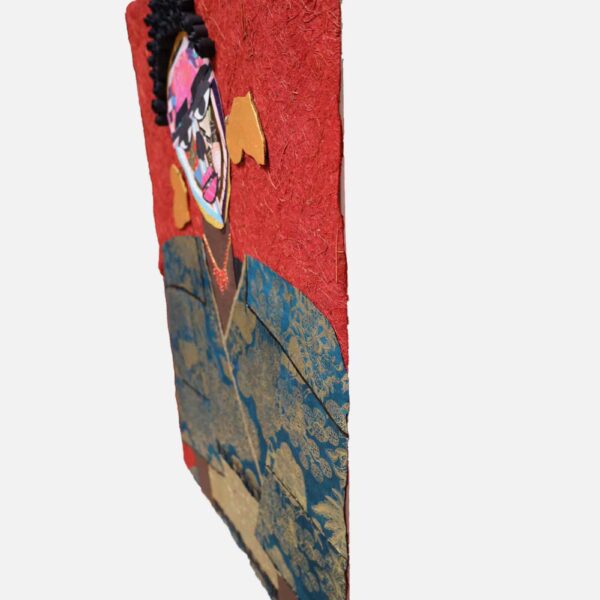 In “Shinshuku,” Lola Okunola’s fascination with African cultural traditions and aesthetics is evident. The central character wears vibrant, patterned fabrics reminiscent of African sartorial customs. Okunola skillfully combines these textiles with torn paper and organic materials, giving the figure dynamism and multi-layered identity. The construction of the piece reflects Okunola’s conceptual interests, blending, overlapping, and sometimes obscuring visual elements to create an ambiguous central form.