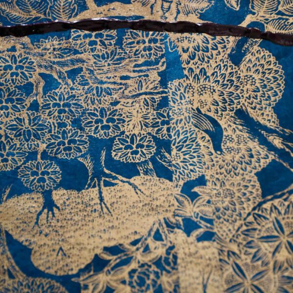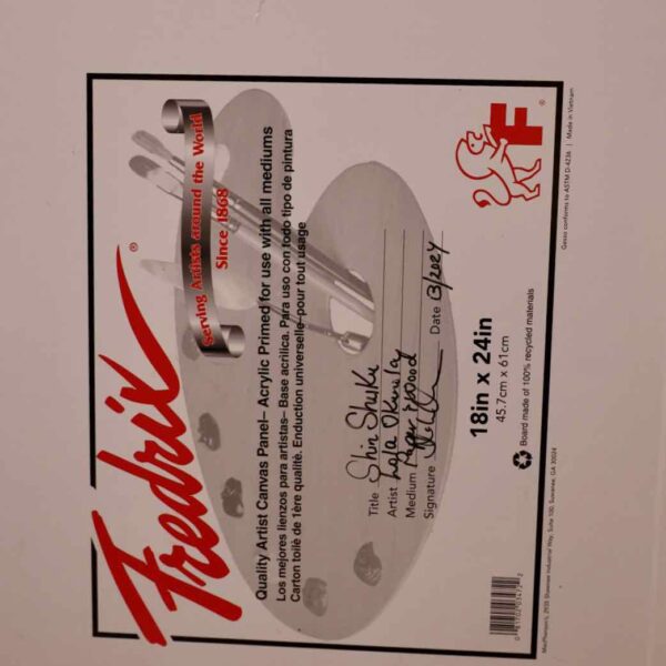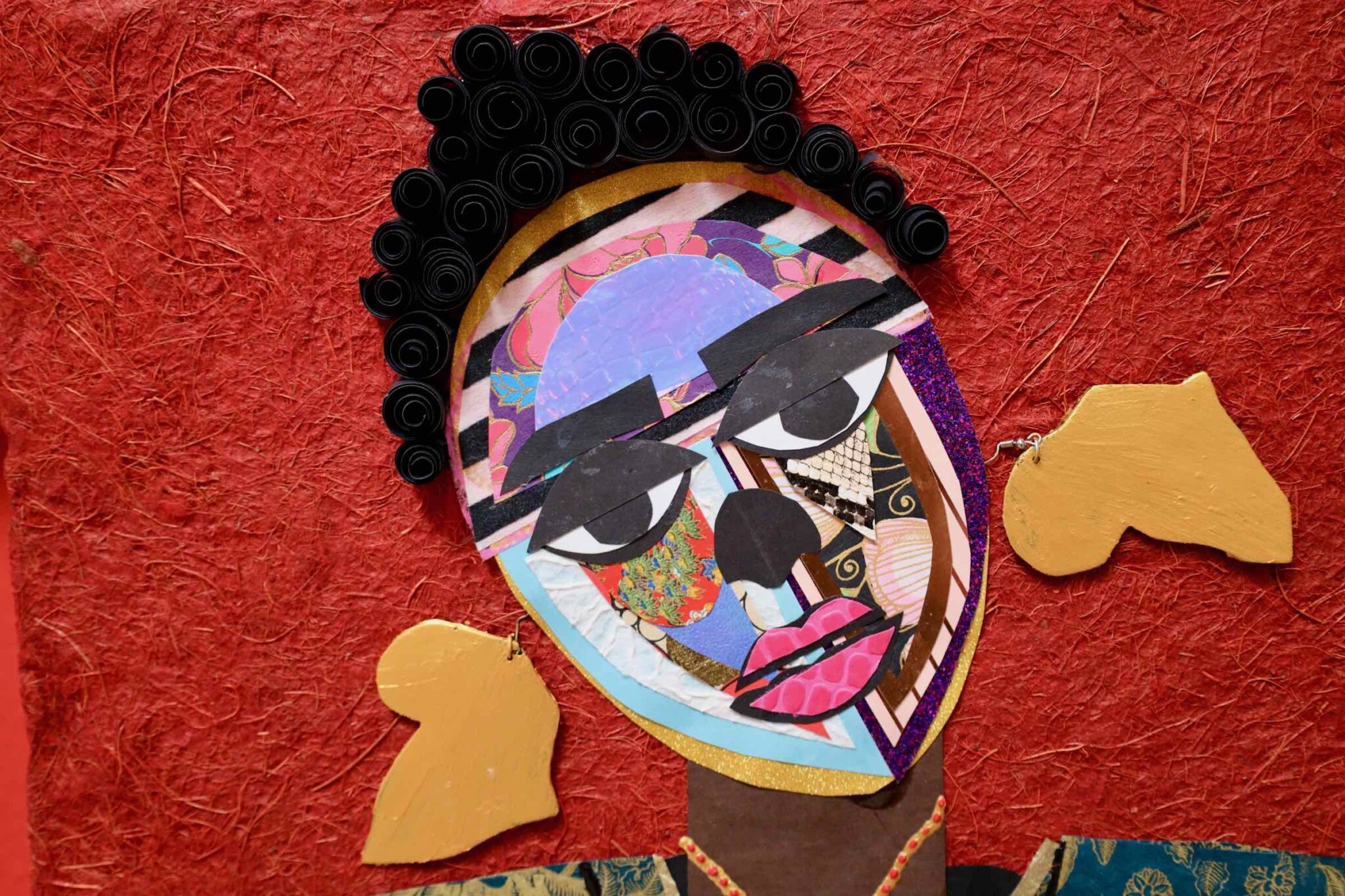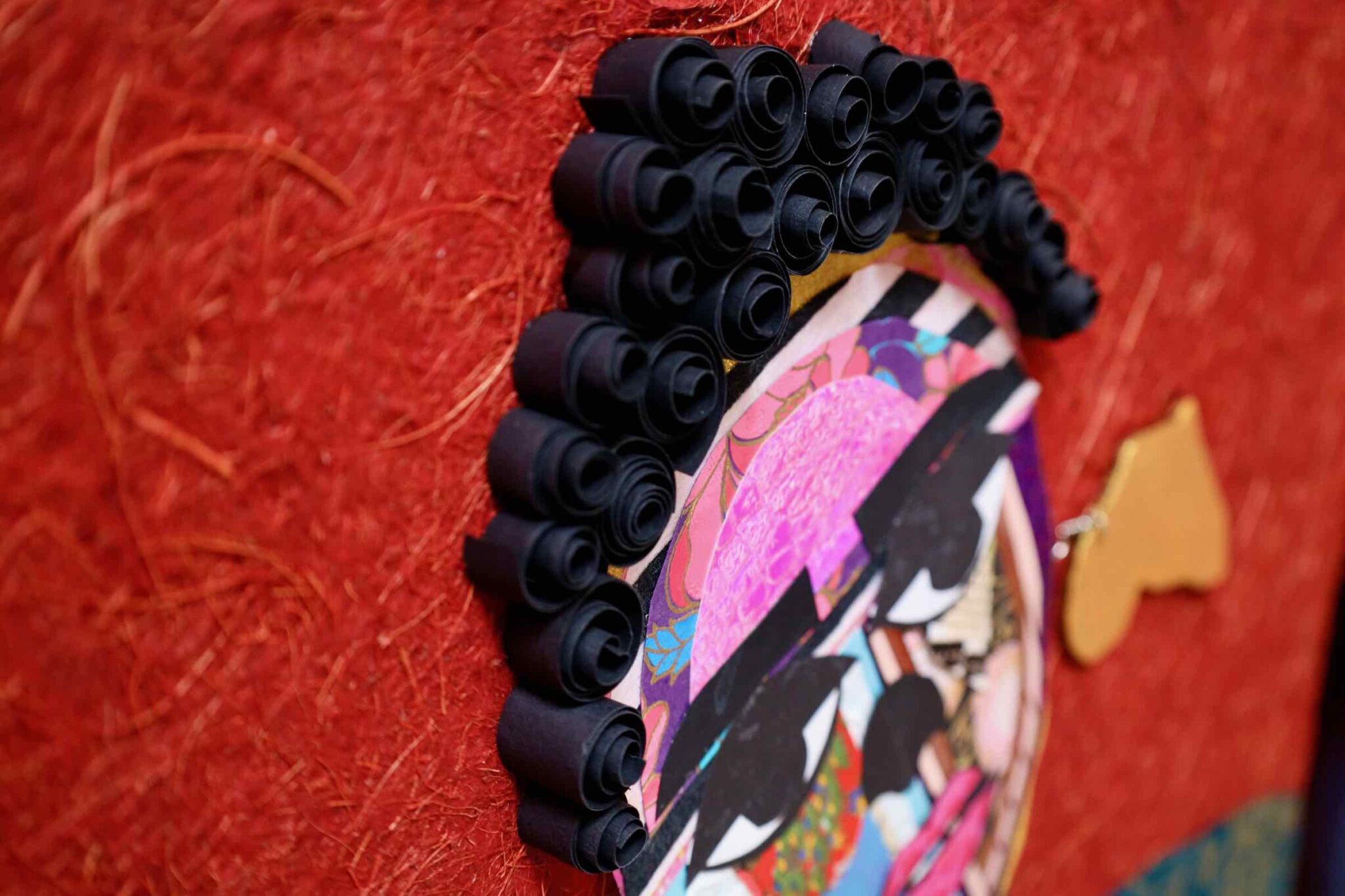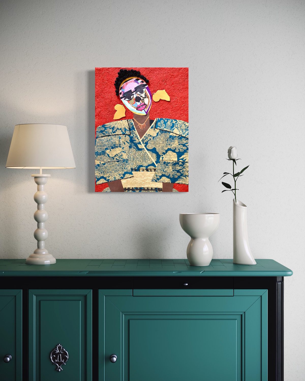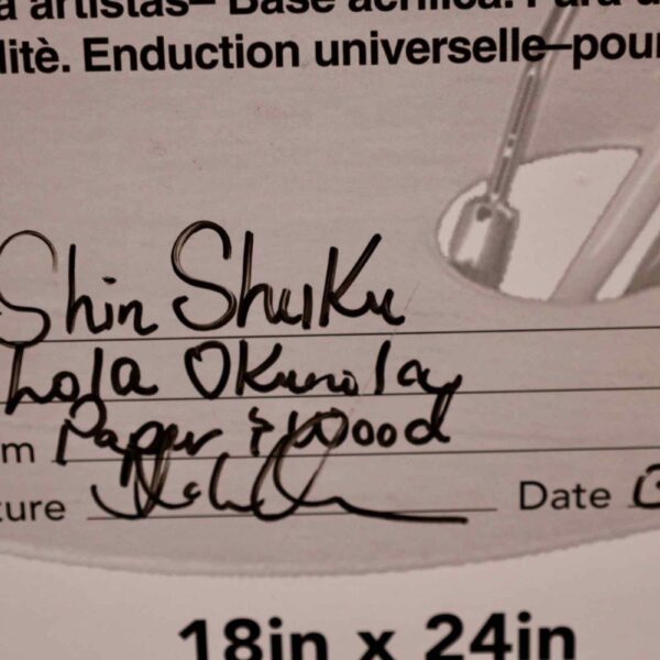 In “Shinshuku,” Lola Okunola’s fascination with African cultural traditions and aesthetics is evident. The central character wears vibrant, patterned fabrics reminiscent of African sartorial customs. Okunola skillfully combines these textiles with torn paper and organic materials, giving the figure dynamism and multi-layered identity. The construction of the piece reflects Okunola’s conceptual interests, blending, overlapping, and sometimes obscuring visual elements to create an ambiguous central form.