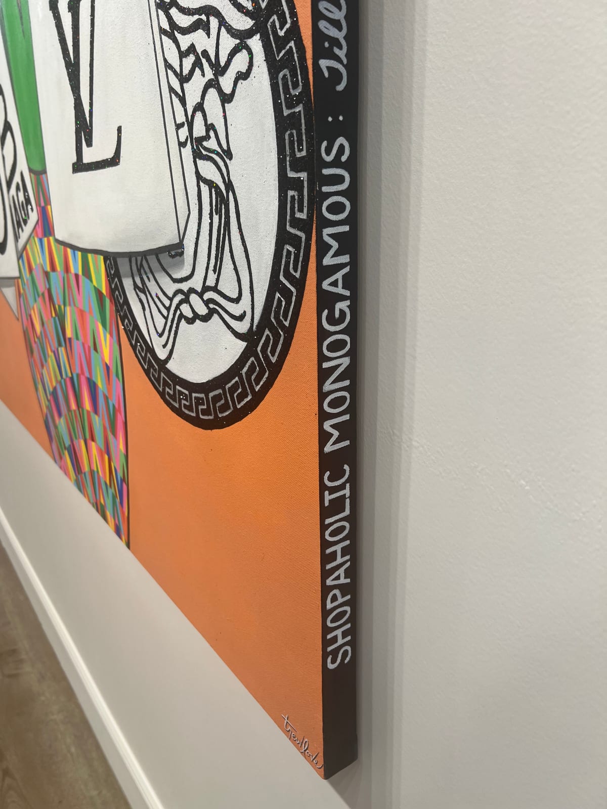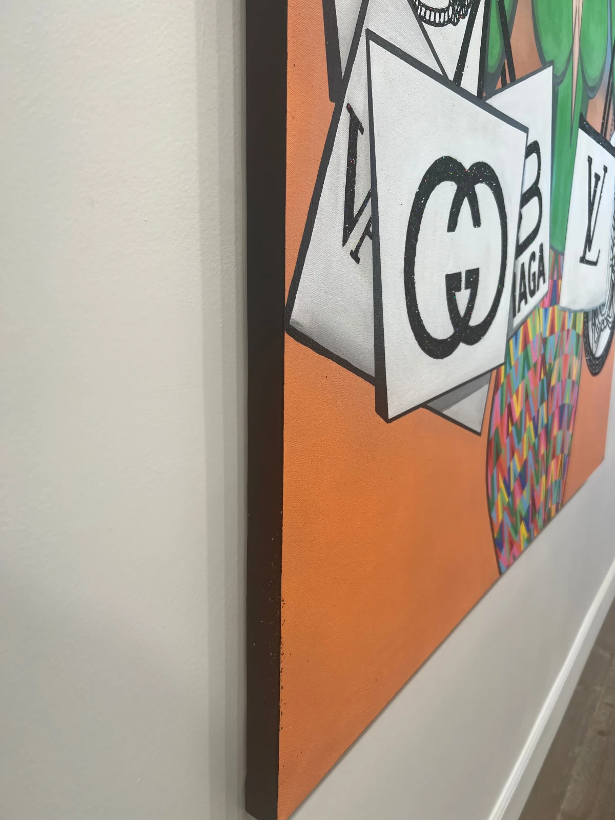 Acrylic, spray paint, and black glitter on canvas