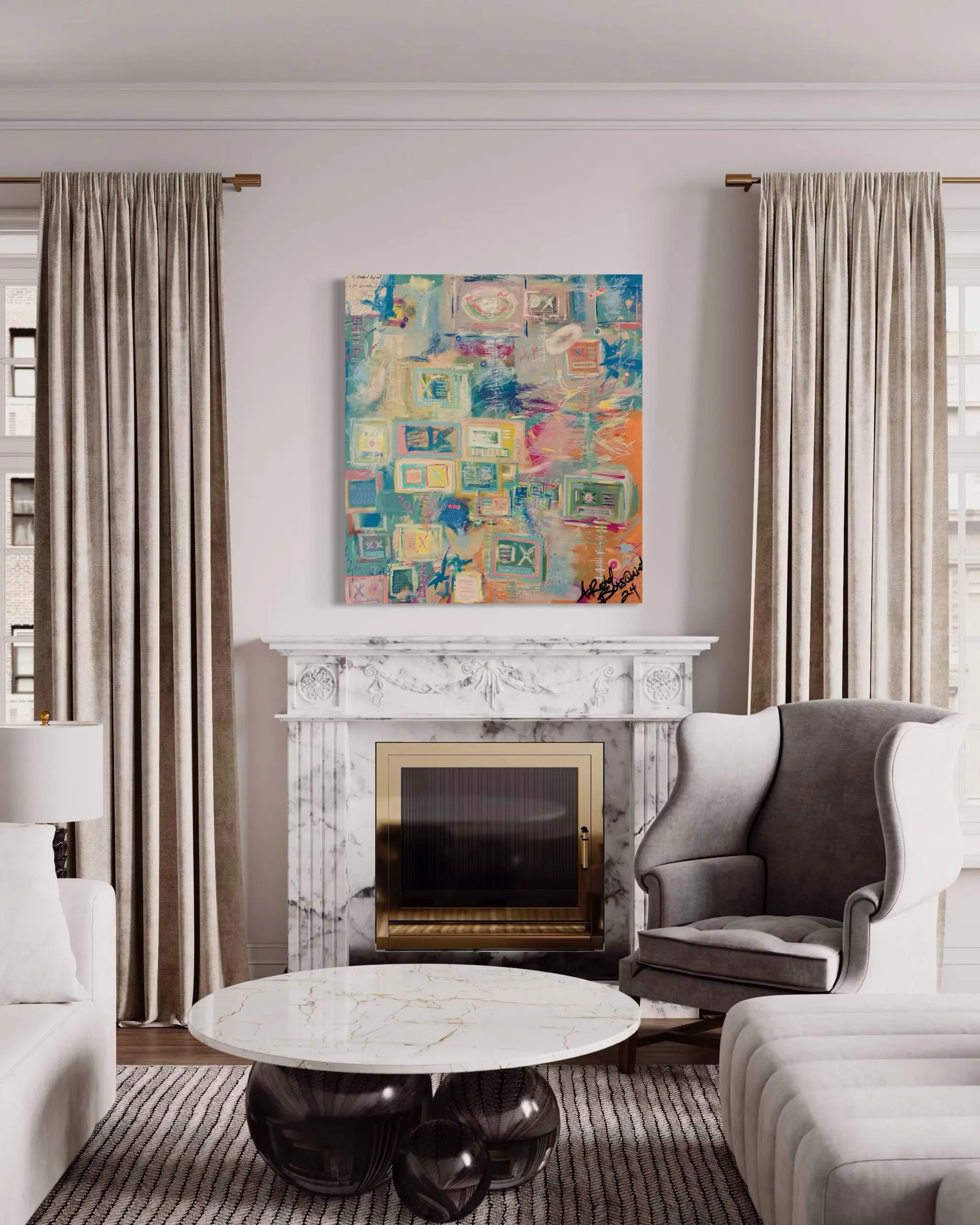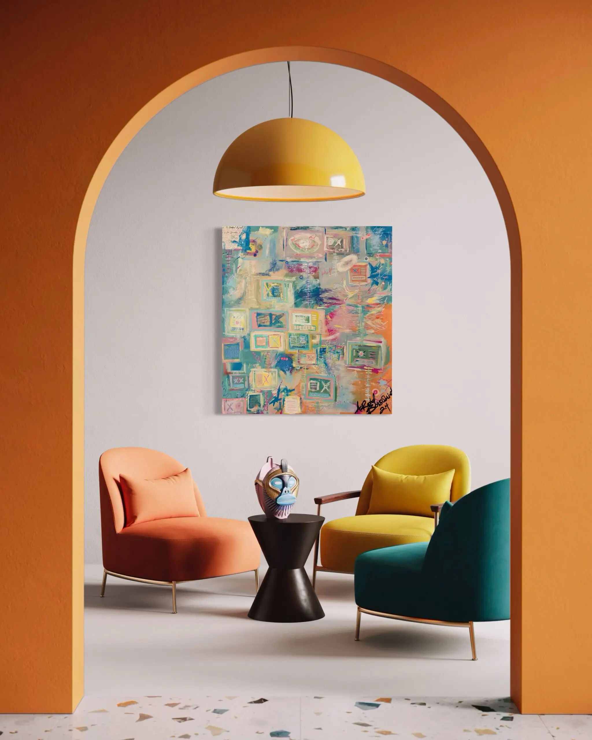 “Signals in Motion” captures the dynamic interplay between technology and human connection, where abstract screens and flowing gestures create a sense of movement and continuous exchange. Soft pastel tones of blue, peach, and green blend harmoniously with structured digital motifs, suggesting a network of communication in flux. The artist’s layering of shapes and symbols evokes the rhythm of data streams, conversations, and evolving ideas.