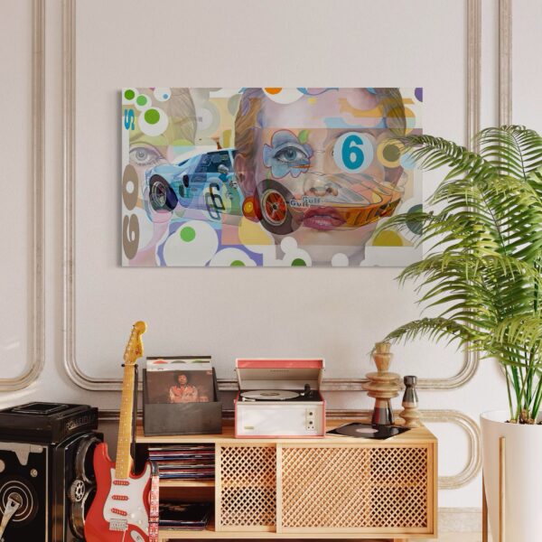 “Sixties” by Marcello Petisci captures the bold energy, color, and cultural style of the 1960s. The composition centers on a sleek vintage race car with the number 6 emblazoned on its side—a nod to the golden era of motorsport. Layered over the car is the portrait of a woman wearing iconic sixties makeup, complete with dramatic eyeliner, bold lashes, and a poised, confident expression. This juxtaposition of speed and style creates a visual dialogue between the thrill of racing and the glamour of mid-century fashion.