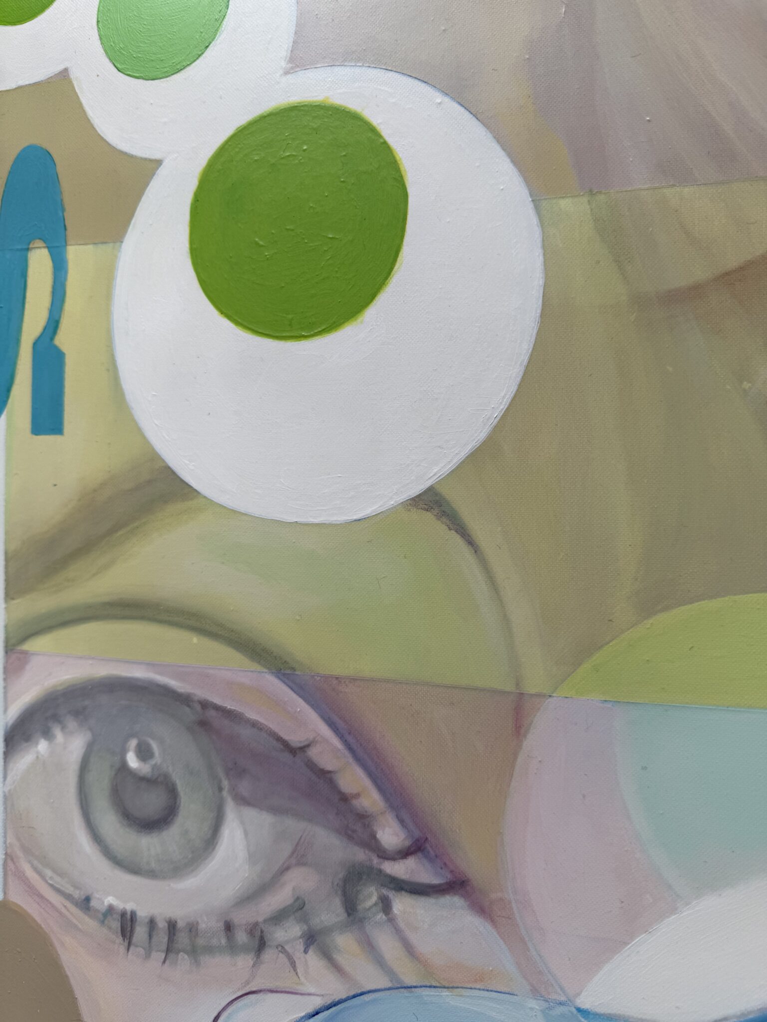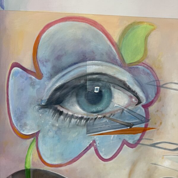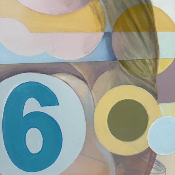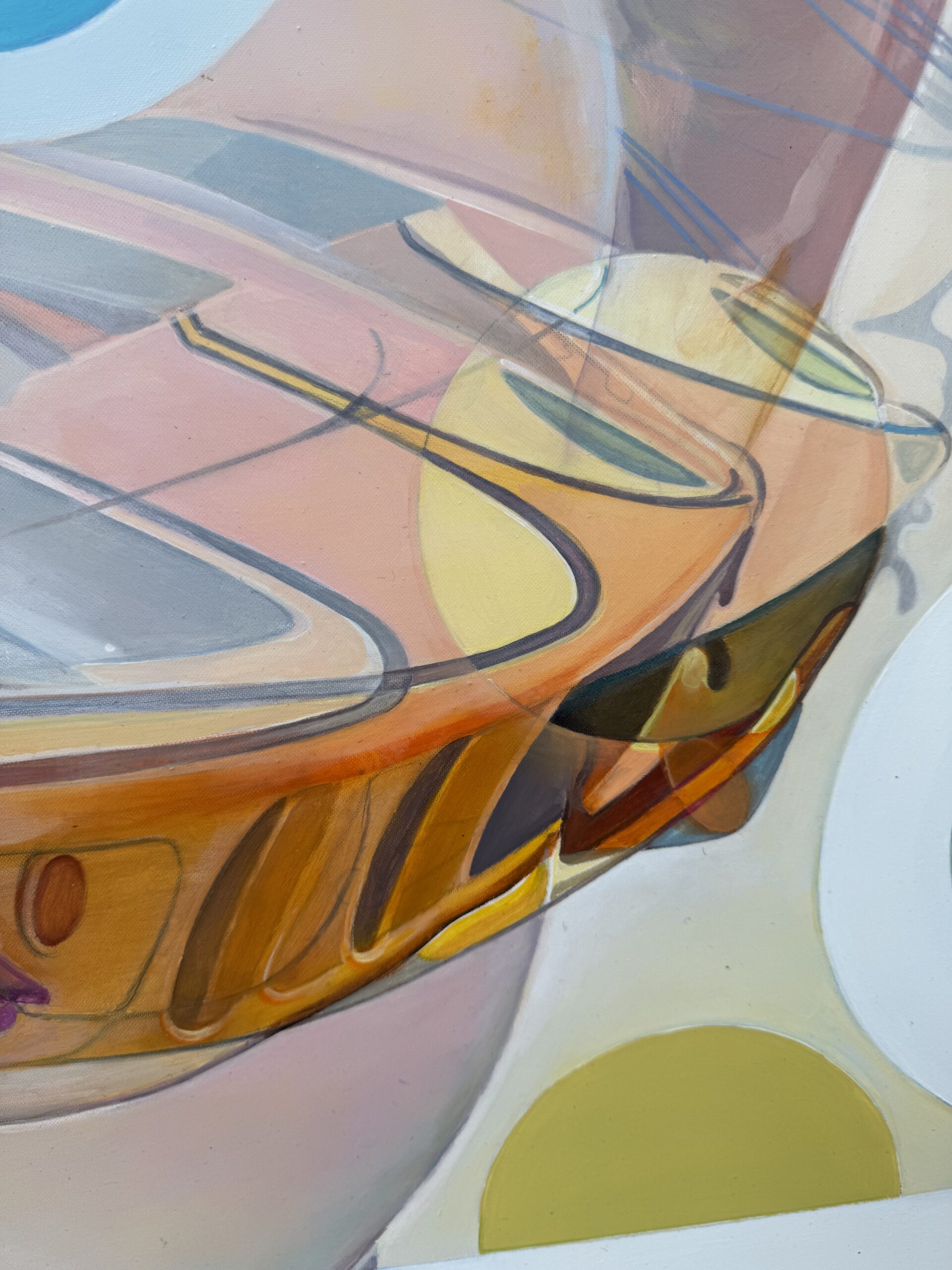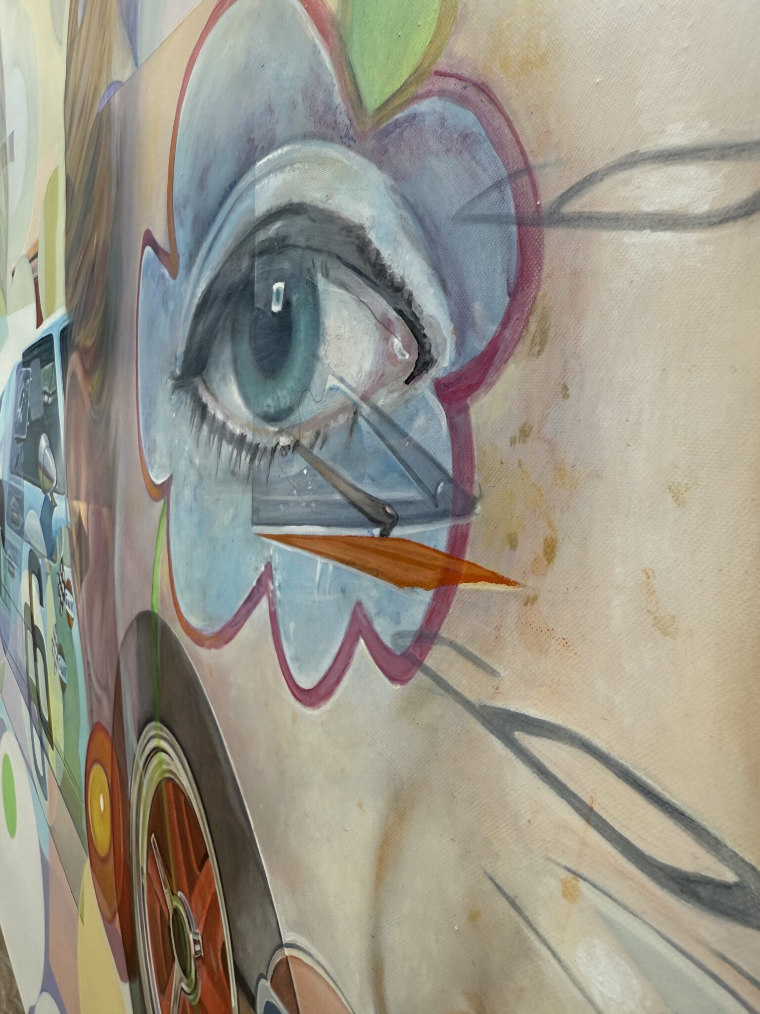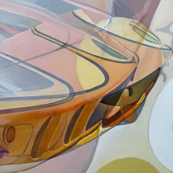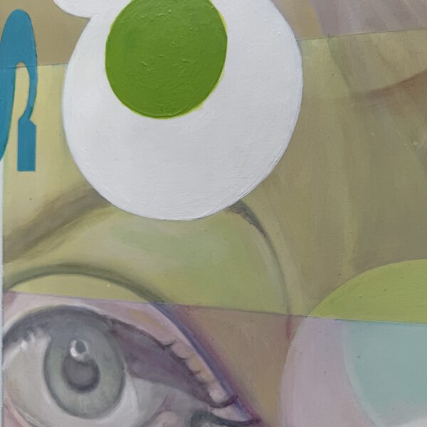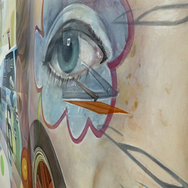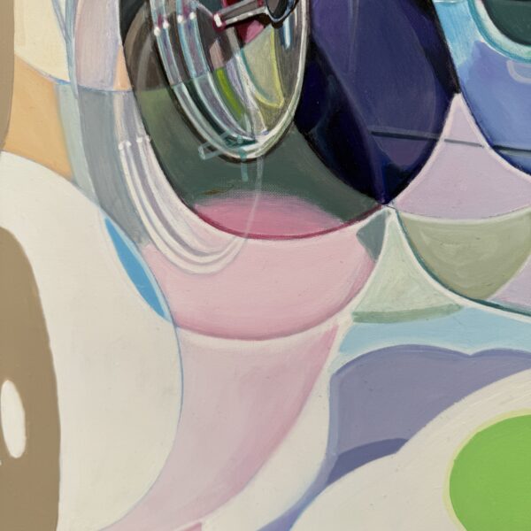 Marcello’s palette is electric and joyful, filled with candy-like hues of green, pink, blue, yellow, and orange. Scattered white spots throughout the painting reference playful, classic sixties patterns, tying the elements together in a way that feels retro yet timeless.