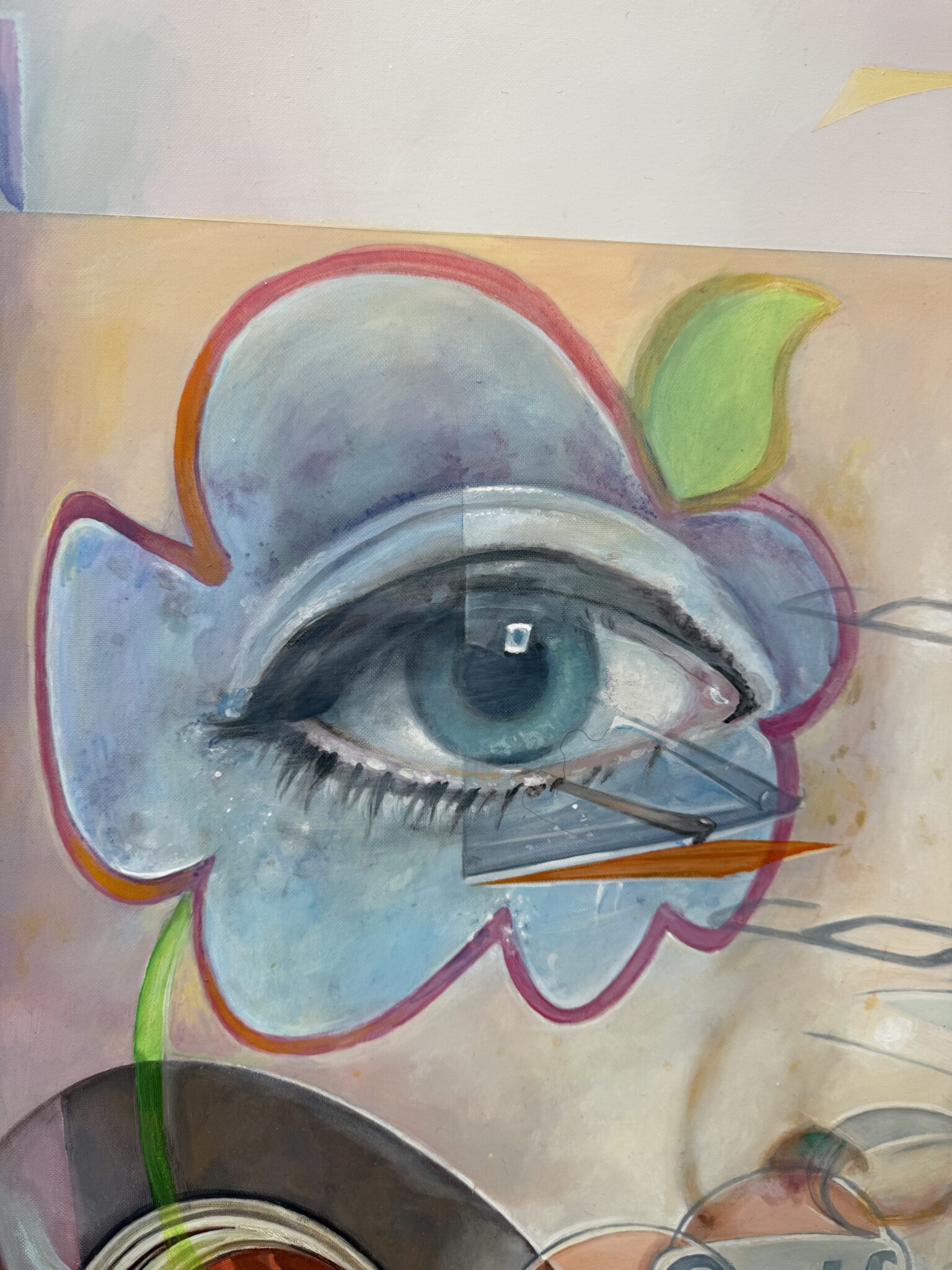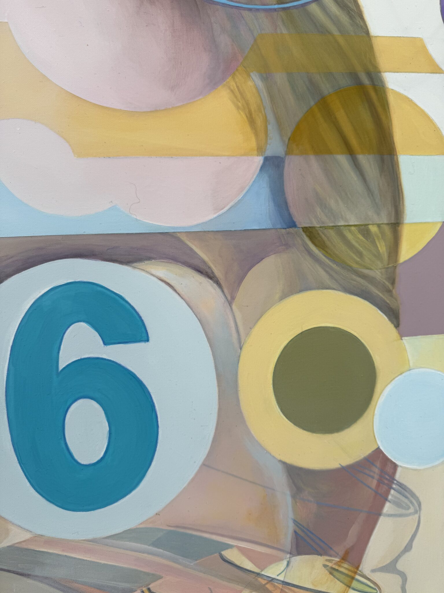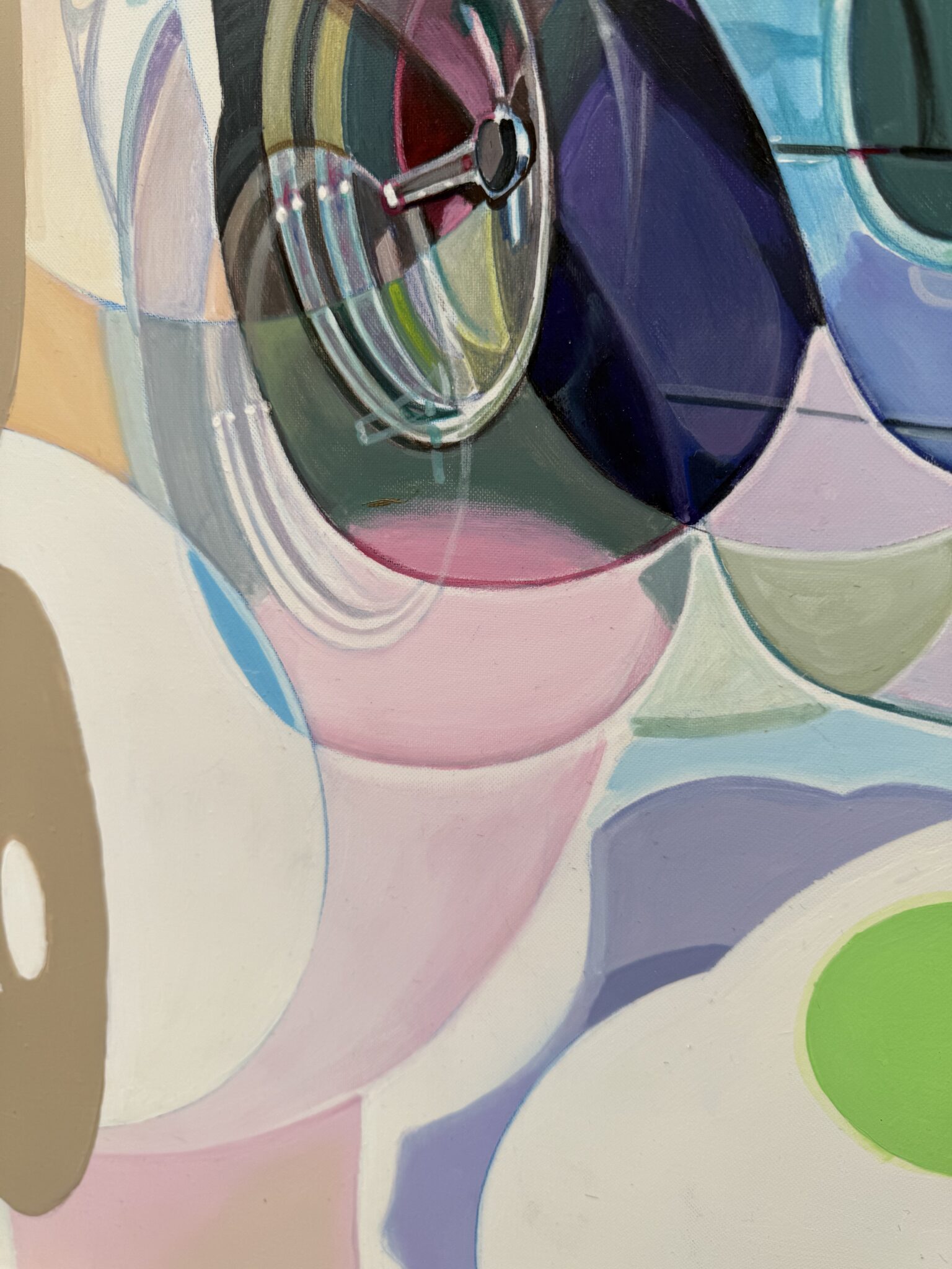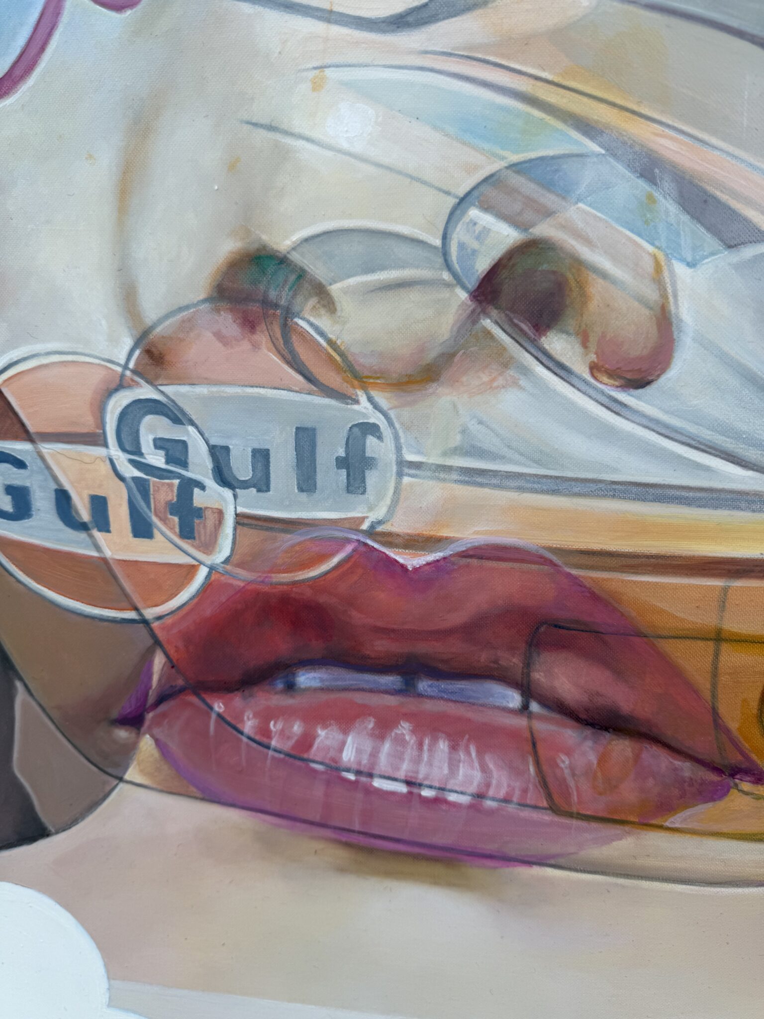 Marcello’s palette is electric and joyful, filled with candy-like hues of green, pink, blue, yellow, and orange. Scattered white spots throughout the painting reference playful, classic sixties patterns, tying the elements together in a way that feels retro yet timeless.
