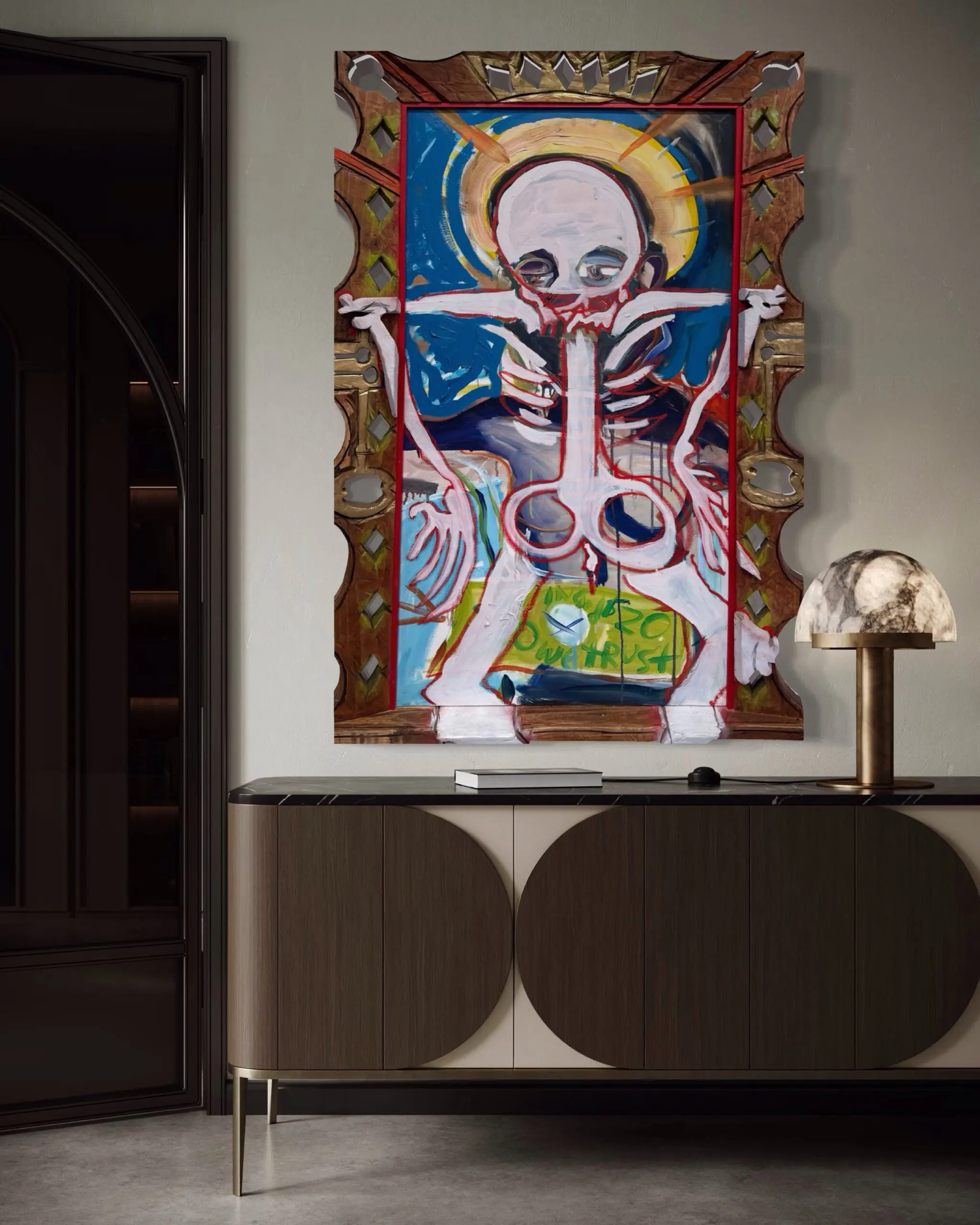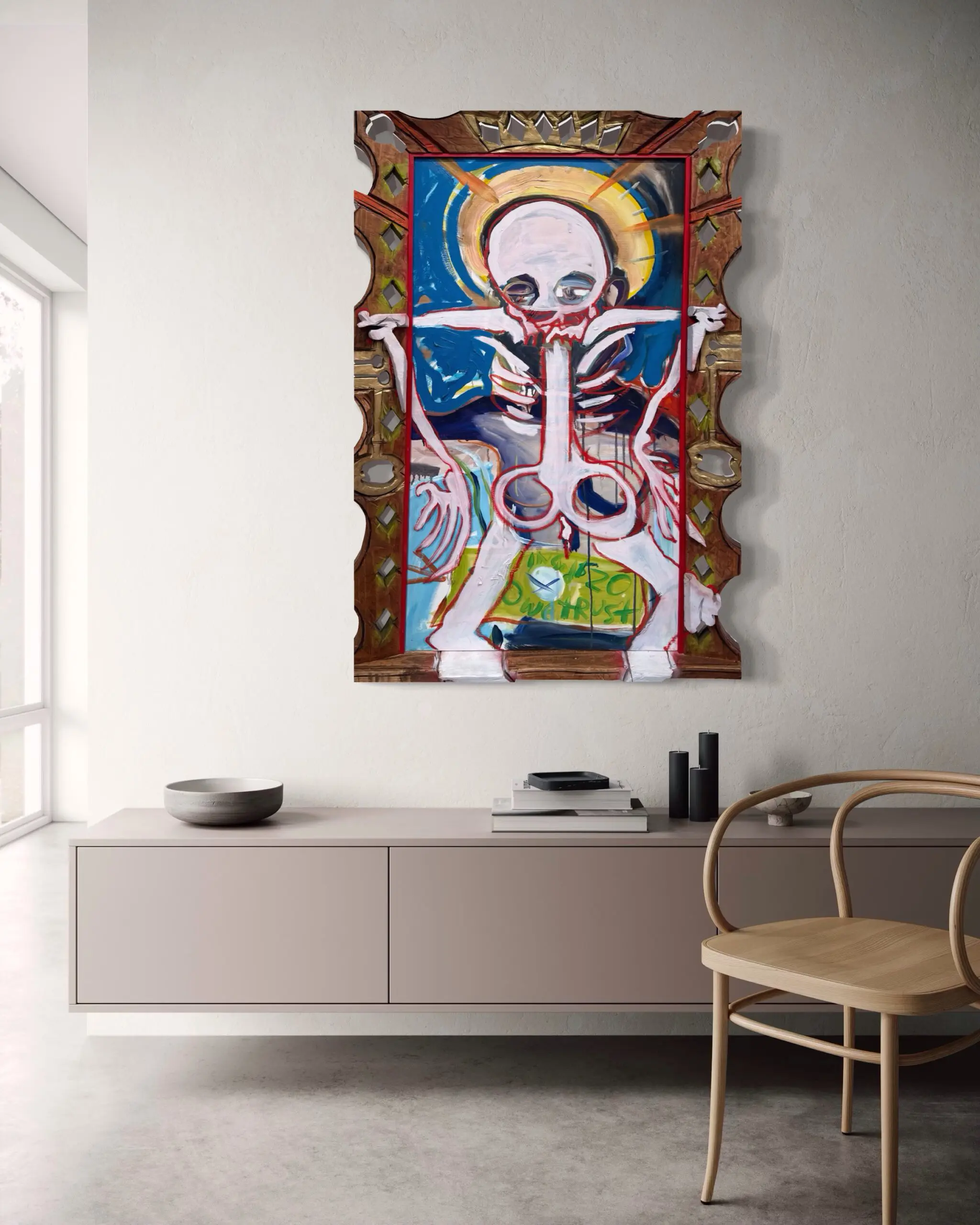 Oil, Acrylic, Spray Paint on Canvas with Carved Wood Elements (Framed)
